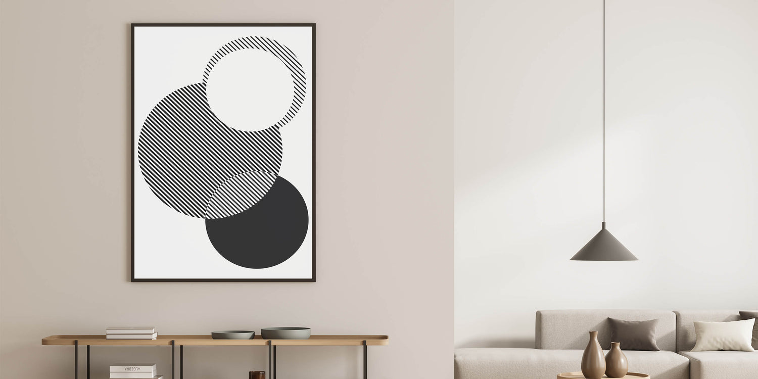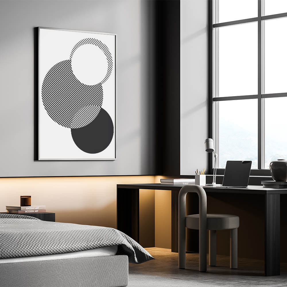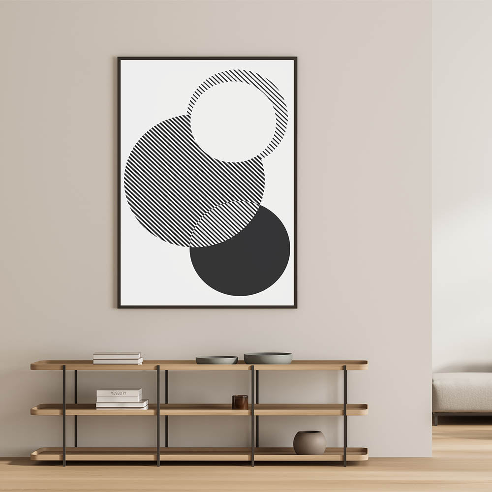 Enhance your space with this minimalist wall decor, a striking blend of geometric precision and modern elegance. This contemporary canvas print features overlapping circles with intricate diagonal line patterns, creating a balanced and sophisticated aesthetic. The monochrome palette of black, white, and gray makes it a timeless piece that complements any interior style.