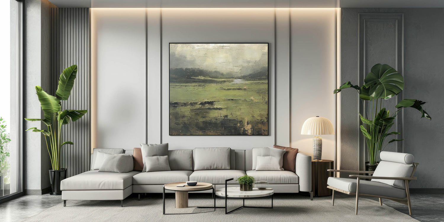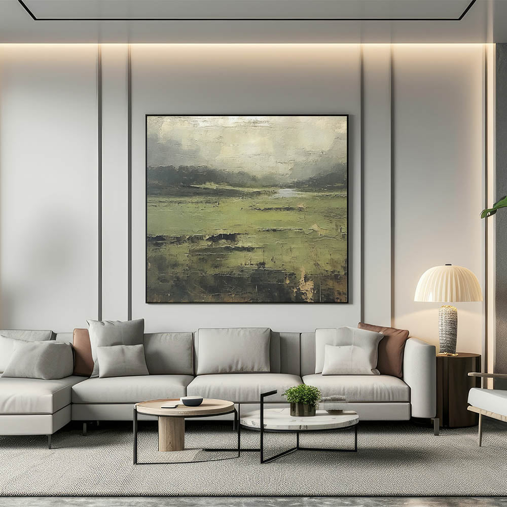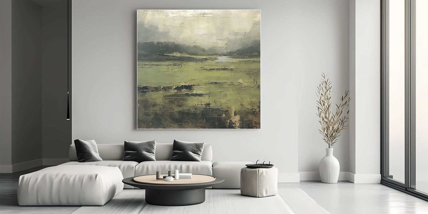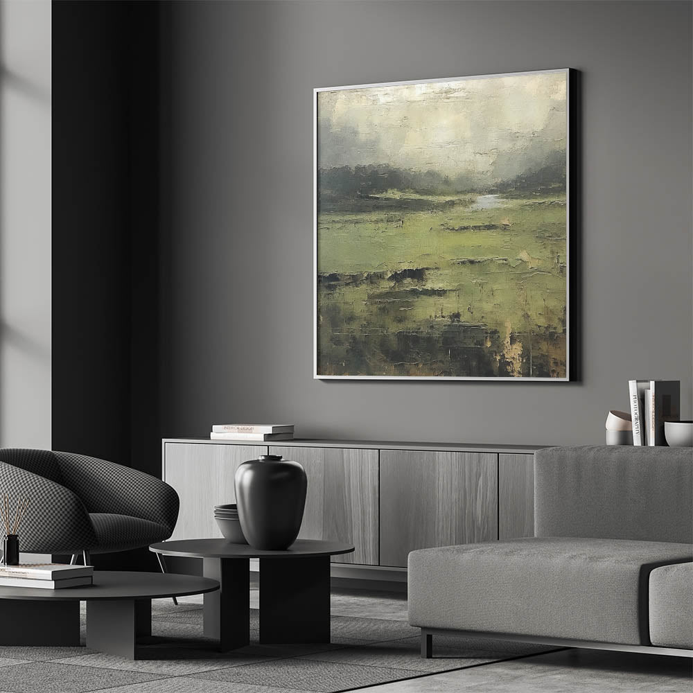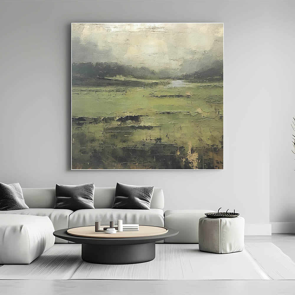 Immerse yourself in the calming beauty of nature with this misty green abstract landscape art, evoking the tranquil essence of a forest clearing. With deep greens, earthy tones, and subtle textures, this piece is perfect for creating a peaceful and grounding atmosphere in any room. Ideal for nature lovers, this artwork brings the beauty of the outdoors inside, adding a touch of serenity to your space.