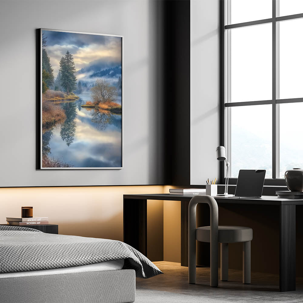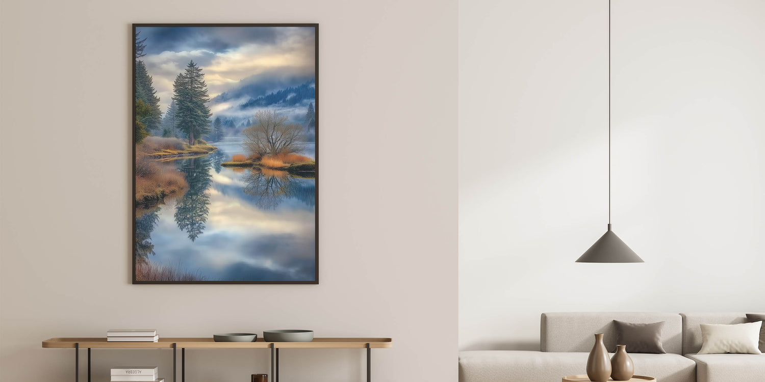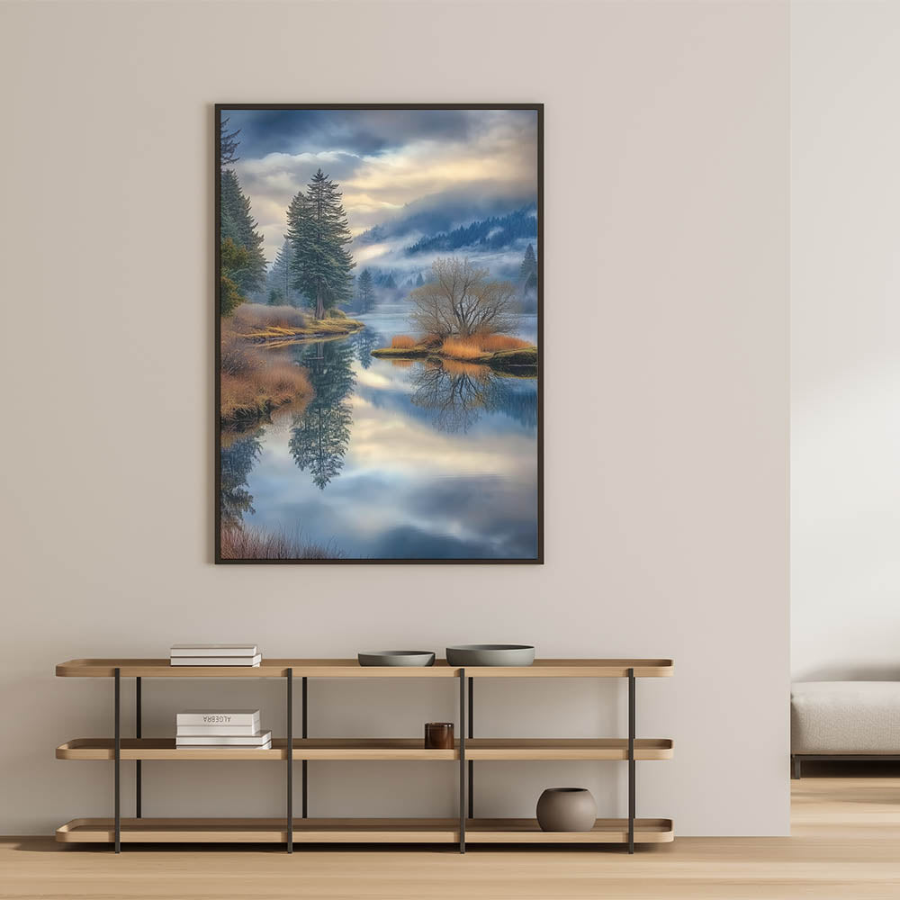 Immerse yourself in the tranquility of nature with this stunning fine art photography canvas print. This breathtaking landscape captures a misty lake surrounded by lush evergreen trees, golden autumn foliage, and rolling mountains. The calm water mirrors the sky and forest, creating a mesmerizing reflection that adds depth and serenity to any space.