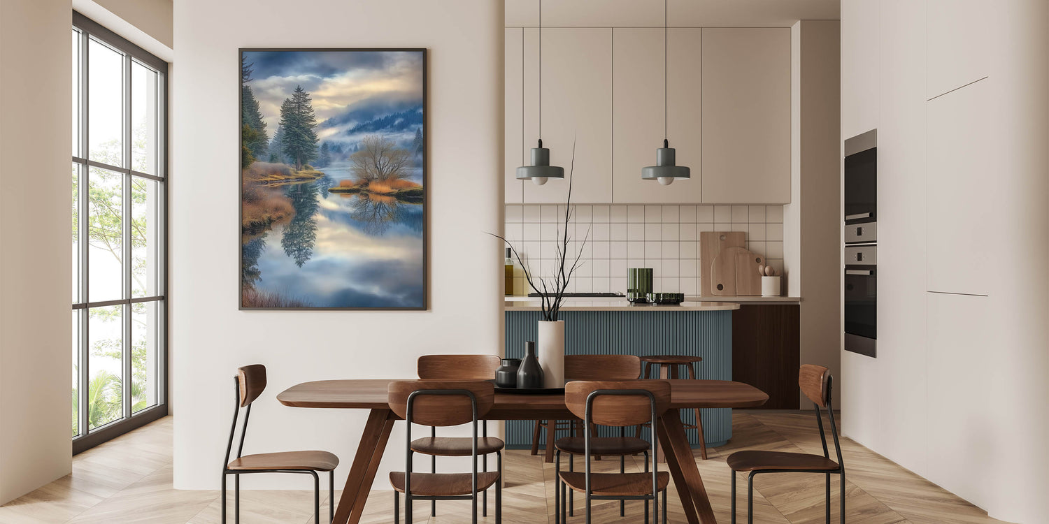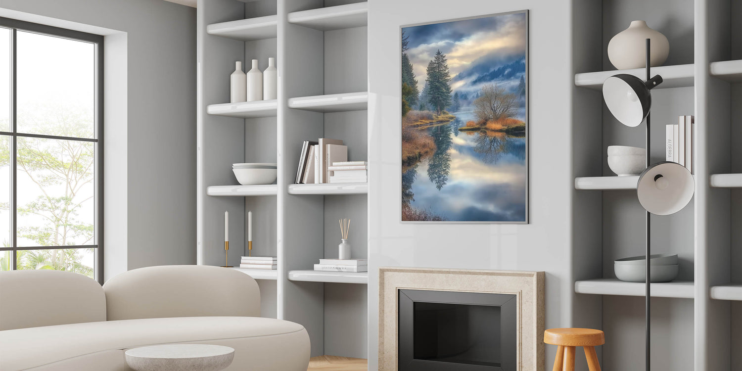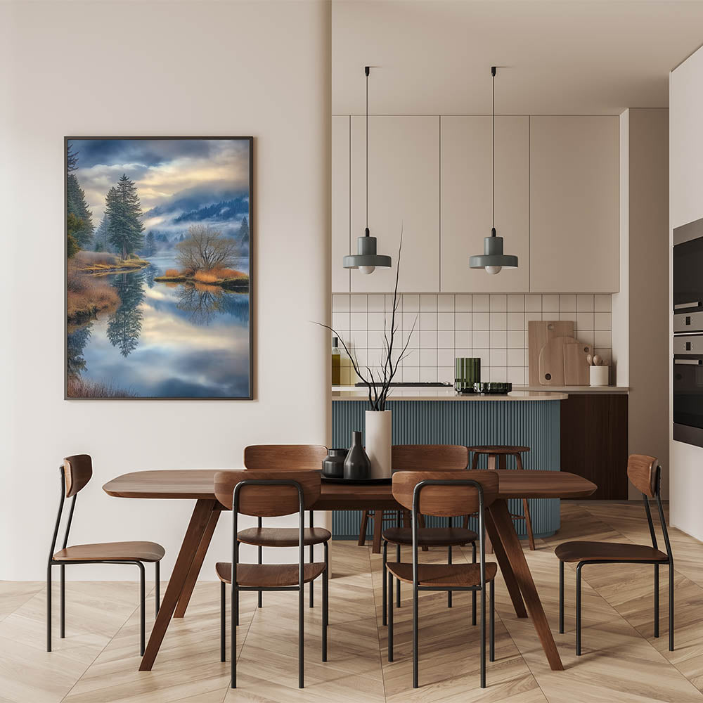 Immerse yourself in the tranquility of nature with this stunning fine art photography canvas print. This breathtaking landscape captures a misty lake surrounded by lush evergreen trees, golden autumn foliage, and rolling mountains. The calm water mirrors the sky and forest, creating a mesmerizing reflection that adds depth and serenity to any space.