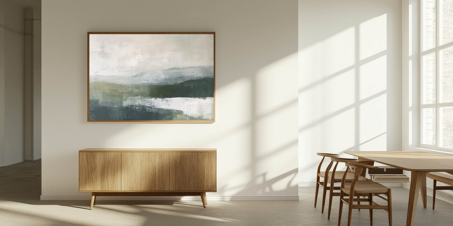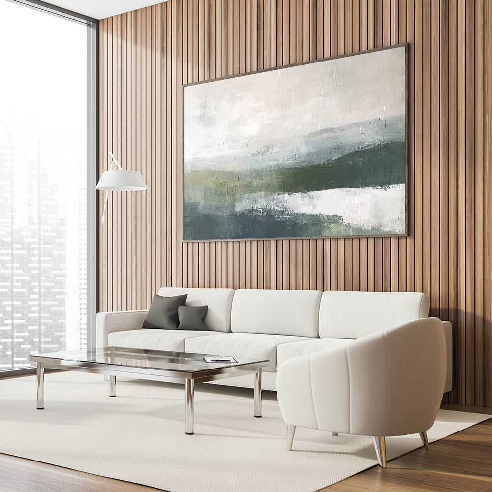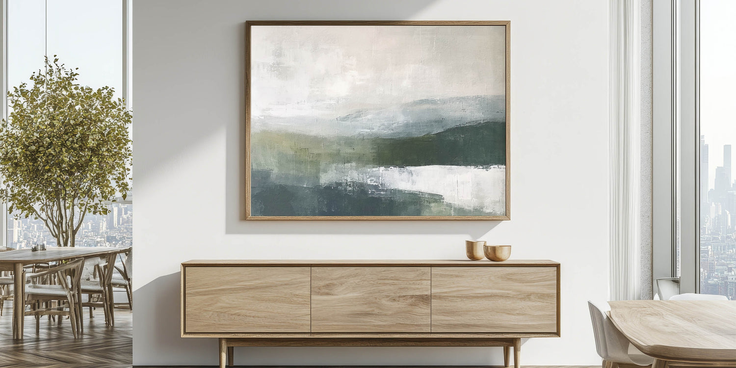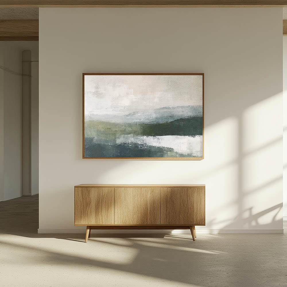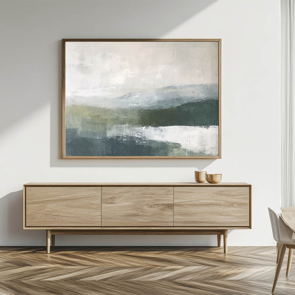 Embrace the serenity of nature with this misty mountain abstract landscape art, showcasing soothing hues of green, blue, and gray. This artwork captures the calm, mist-covered mountains, making it ideal for creating a tranquil ambiance in any room. Perfect for minimalist and modern decor, the subtle color gradients and textures evoke a sense of peace and harmony, bringing the essence of nature indoors.