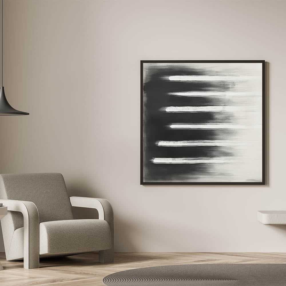 Enhance your interior with this modern abstract wall art, a striking fusion of bold contrast and soft motion. This minimalist abstract painting features a captivating blend of horizontal white strokes fading into a deep black background, evoking a sense of movement and balance. The monochromatic palette makes this artwork a perfect addition to contemporary, industrial, and minimalist spaces.