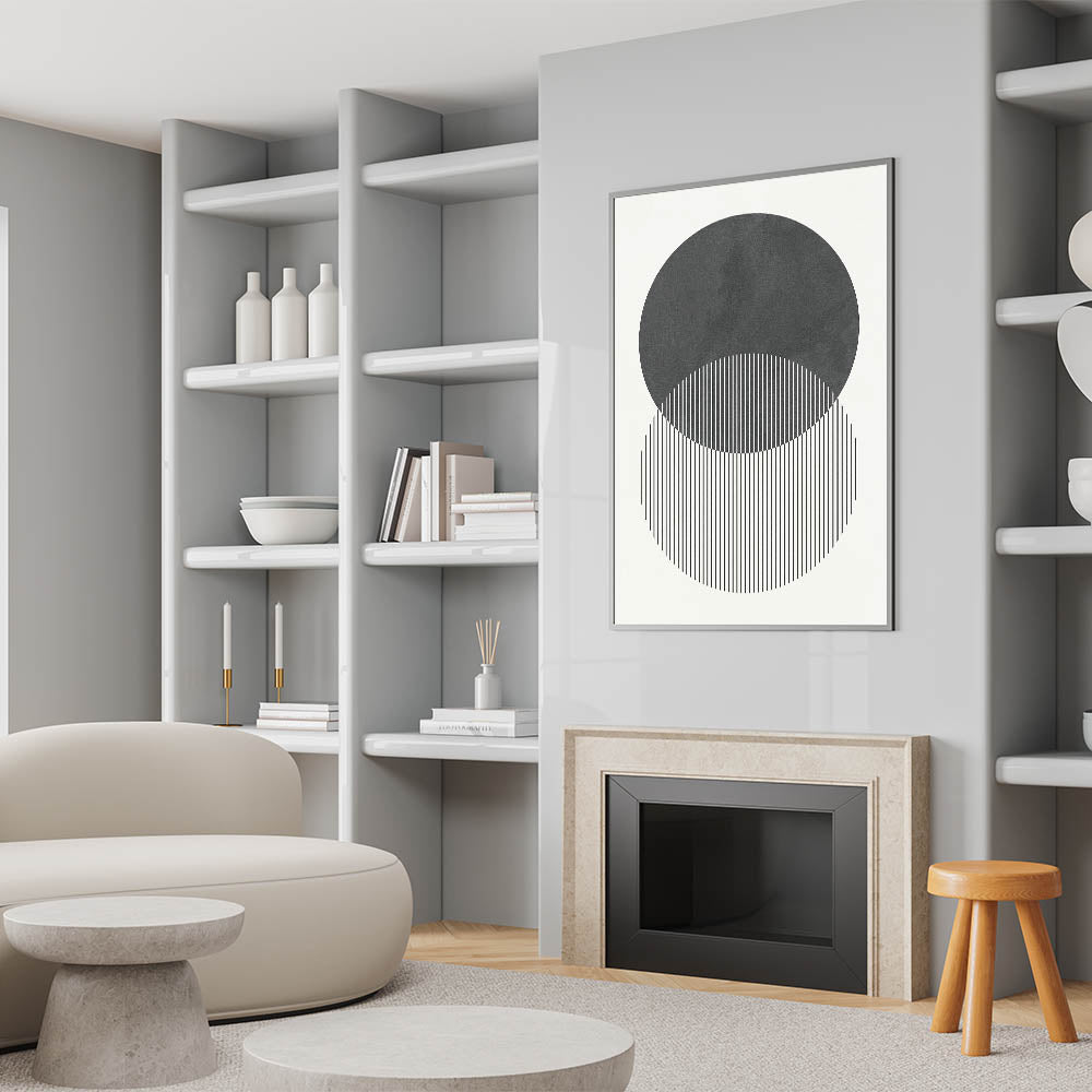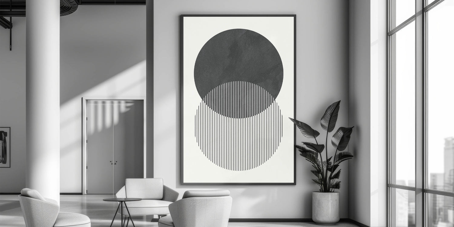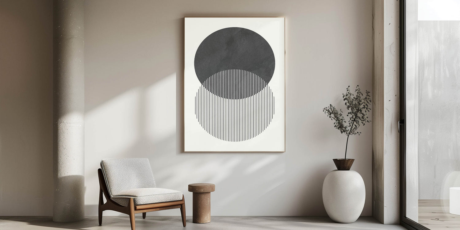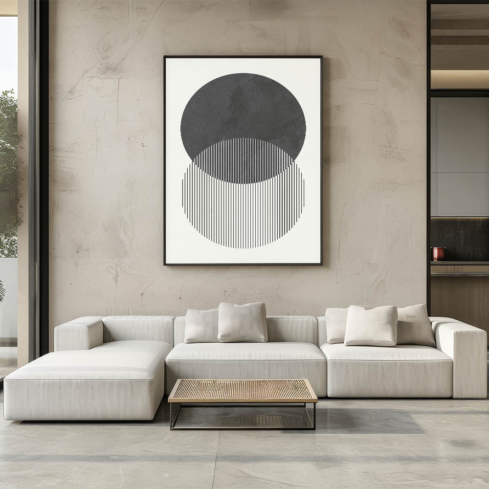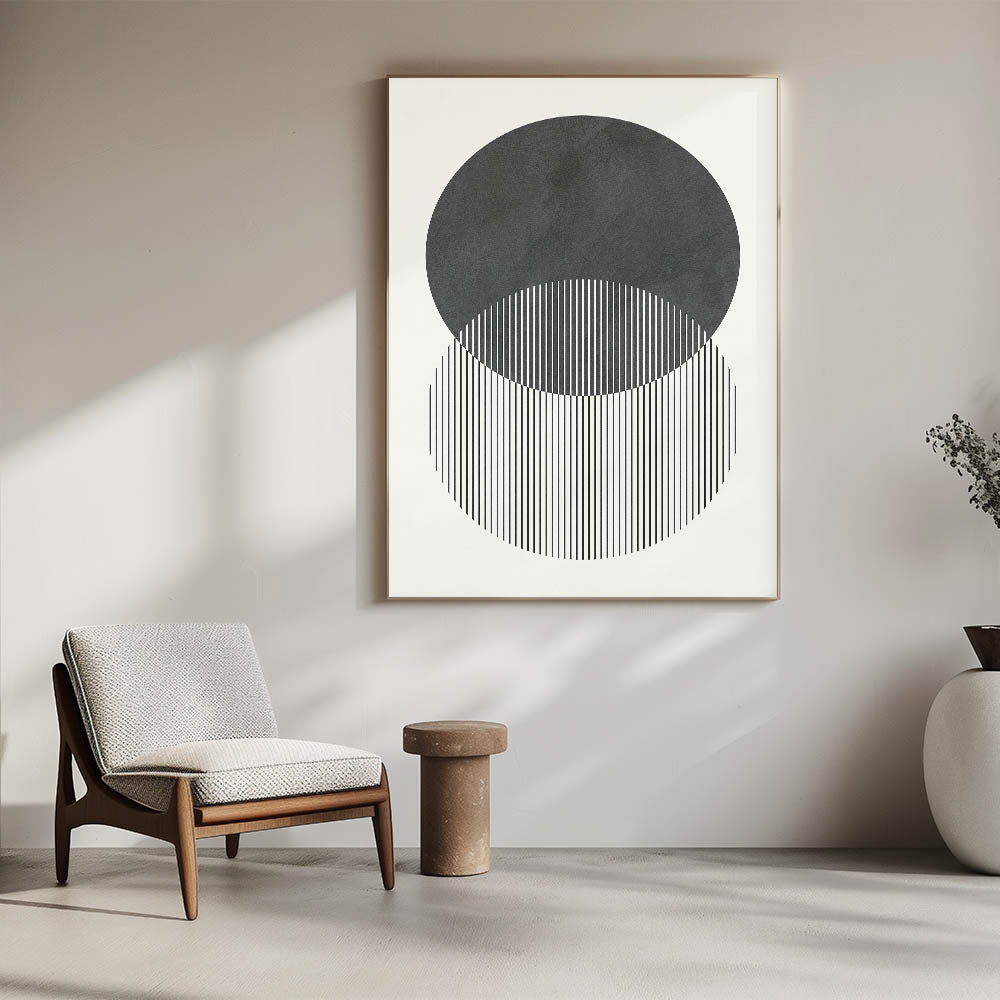 Transform your space with this modern abstract wall art, a stunning composition of geometric shapes and minimalist design. Featuring two overlapping circles with fine vertical lines, this contemporary canvas print embodies balance and symmetry, making it an elegant addition to modern interiors. The black and white contrast adds depth and sophistication, perfect for a refined and stylish atmosphere.