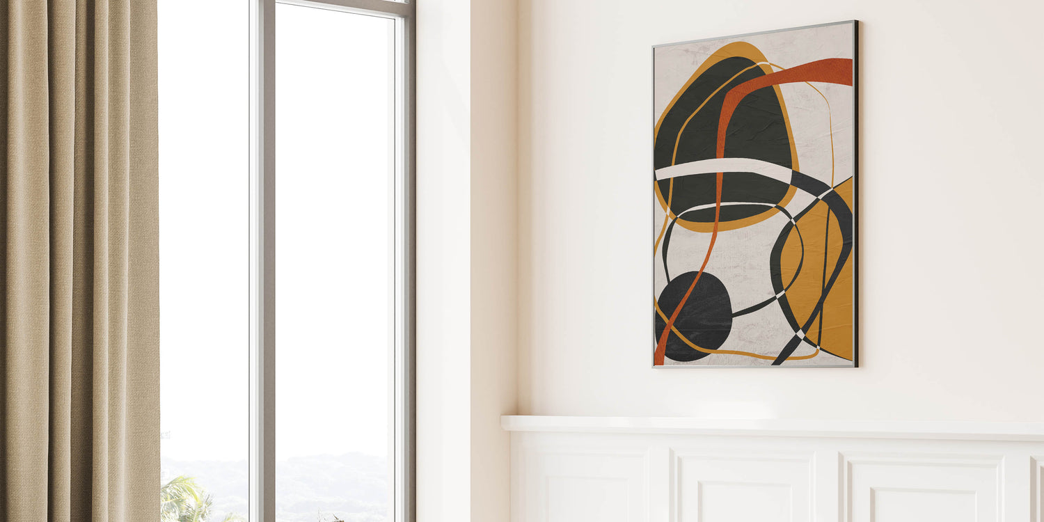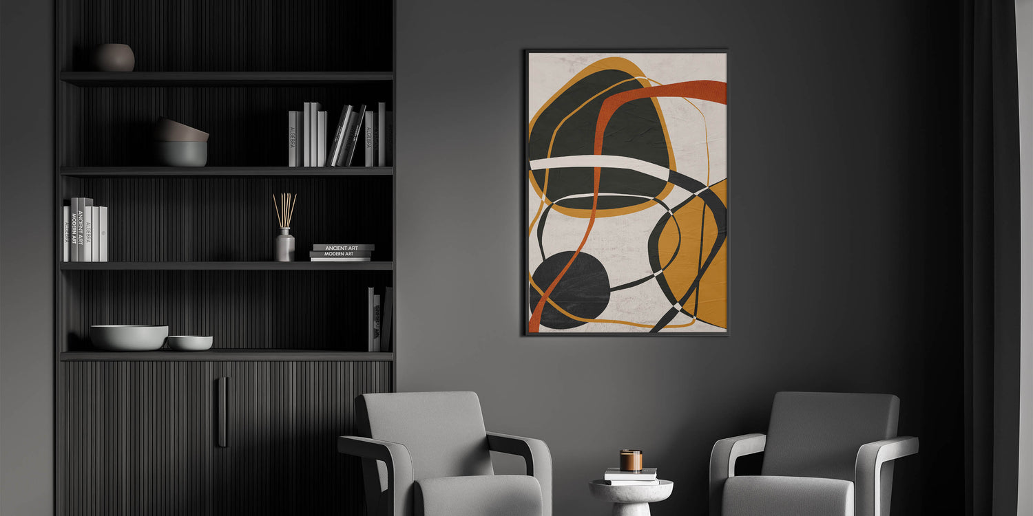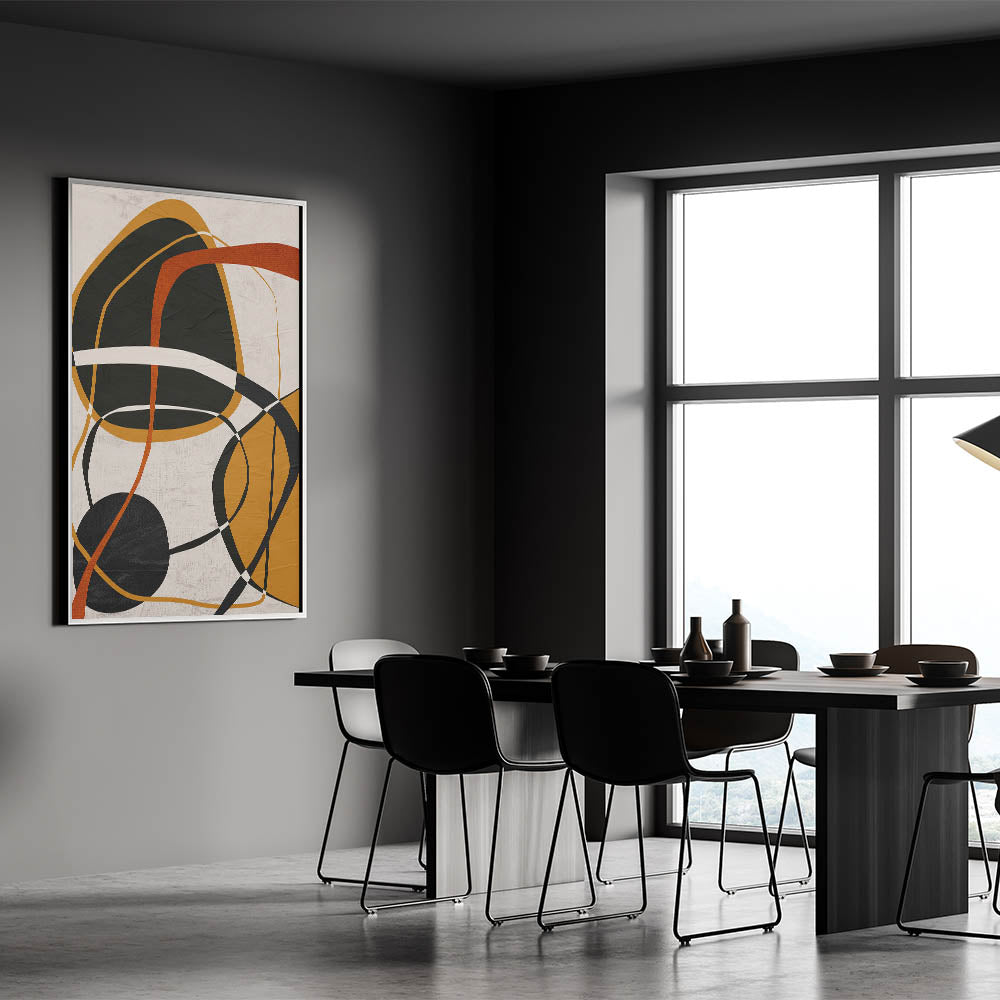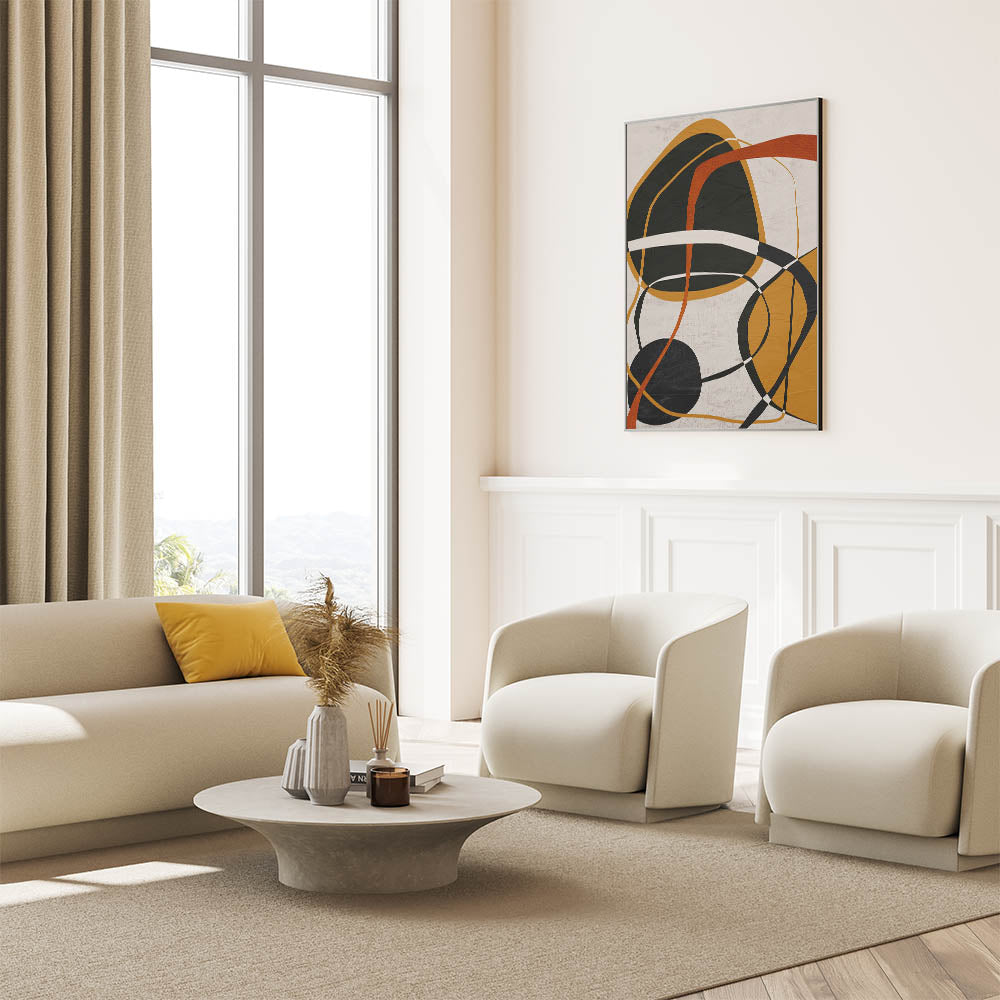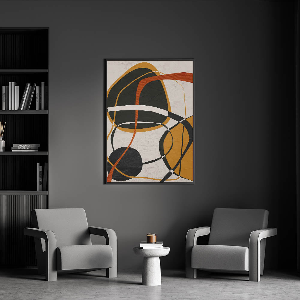 This modern abstract wall art features an elegant composition of organic shapes, overlapping lines, and warm earthy tones. The dynamic blend of mustard yellow, burnt orange, black, and beige creates a visually intriguing contrast, making this artwork a bold yet sophisticated addition to contemporary interiors. As part of the modern abstract art collection, this piece beautifully balances geometric patterns in modern art with expressive, free-flowing elements.