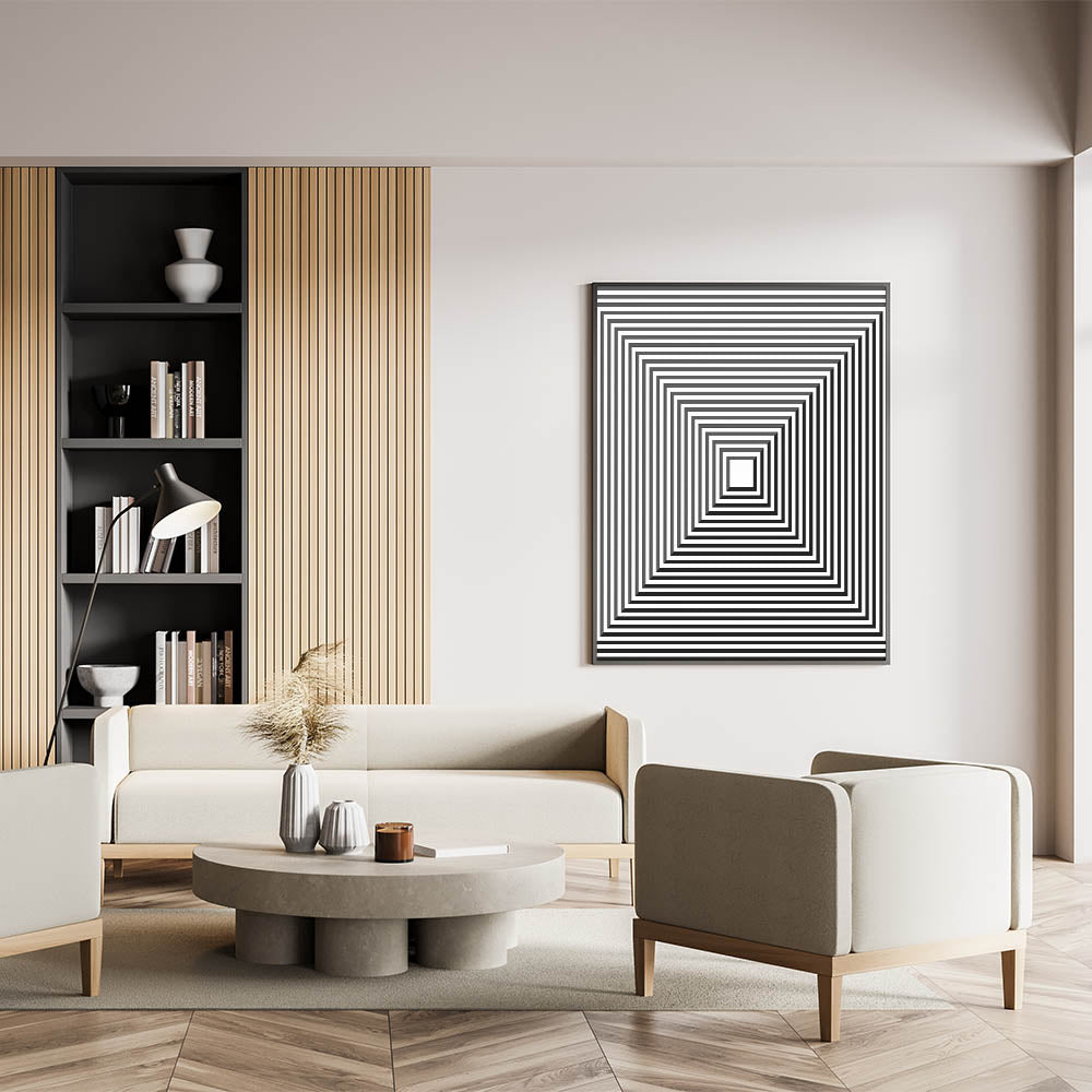Make a bold statement with this modern abstract wall art, a mesmerizing geometric composition featuring an intricate pattern of concentric squares. This contemporary canvas print creates an optical illusion effect, drawing the eye toward the center and adding depth to your space. The minimalist abstract painting in black and white is perfect for modern interiors, offering a sophisticated and visually engaging aesthetic.