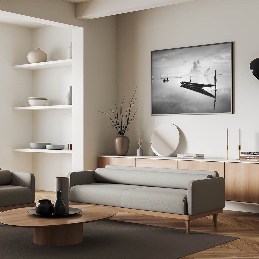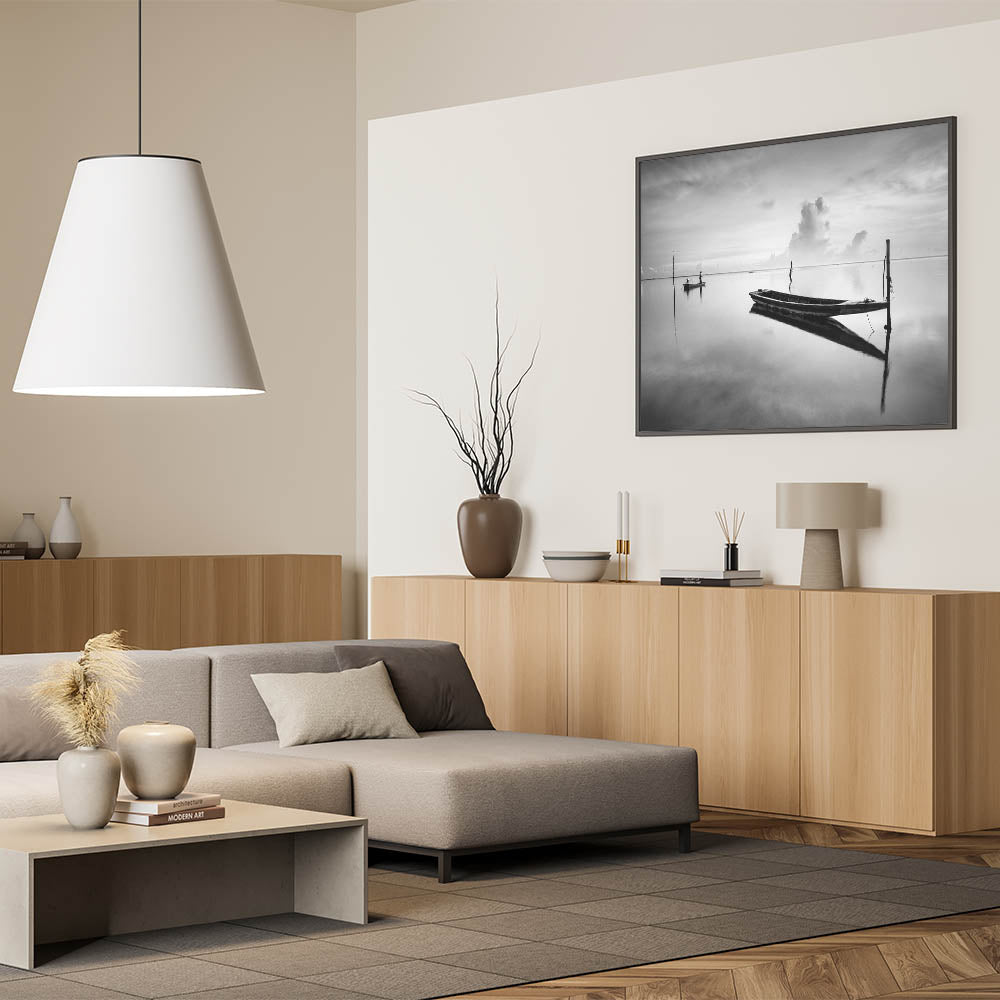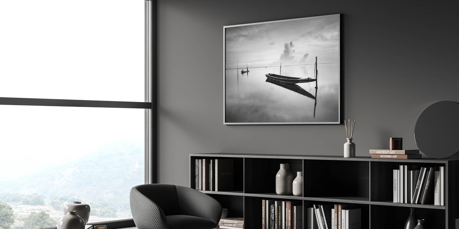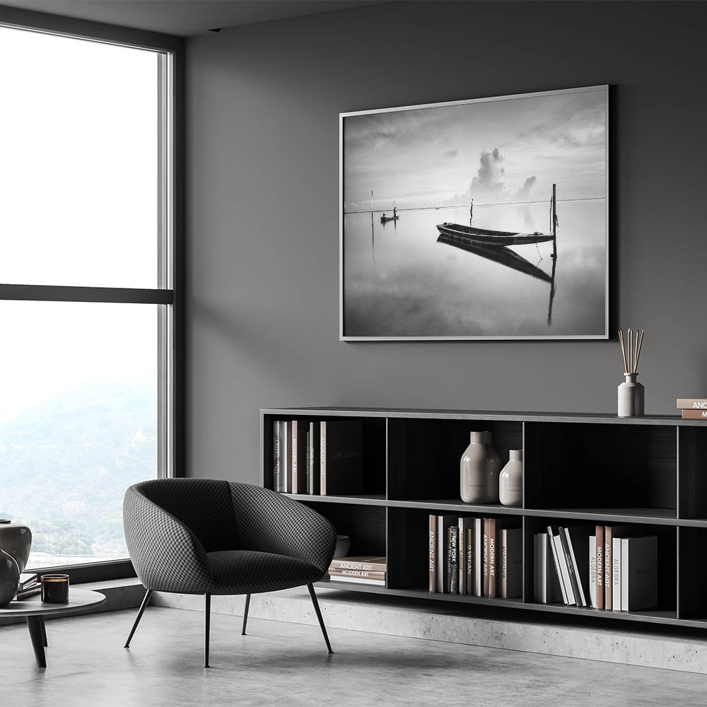 This fine art photography print presents a striking black-and-white composition of two boats floating on still waters. The mirrored reflections on the water create a breathtaking visual effect, while the presence of a solitary fisherman in the background adds a sense of tranquility and isolation.