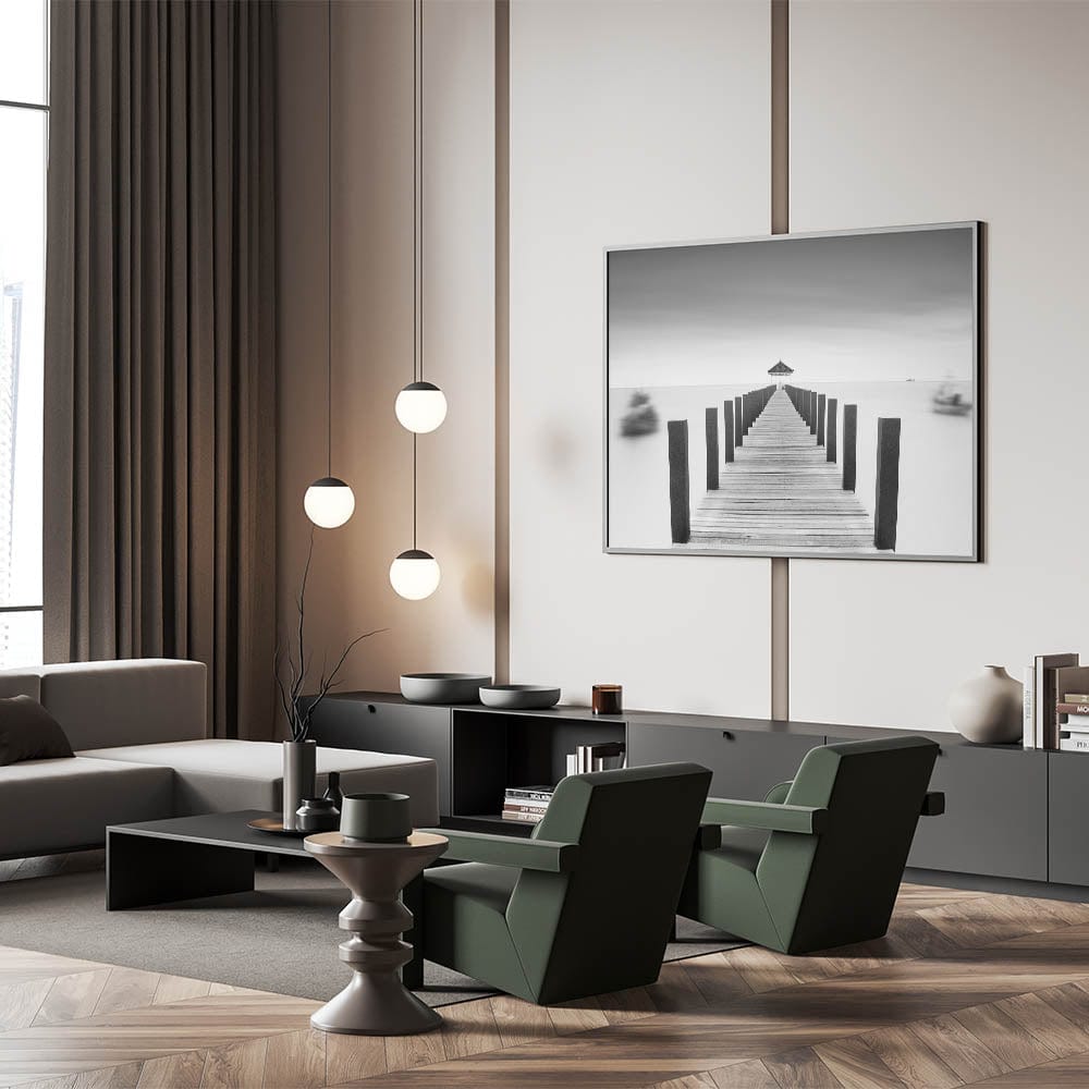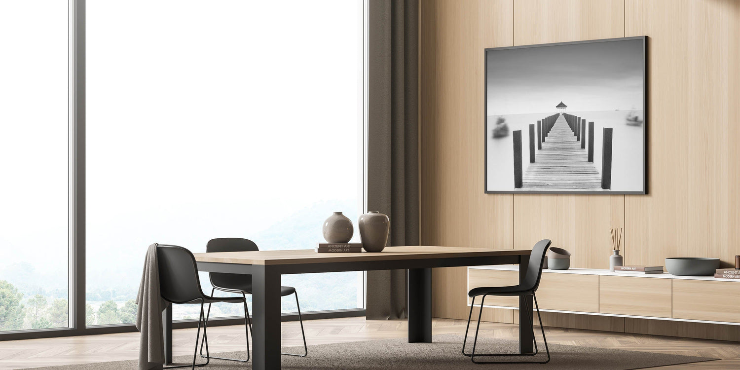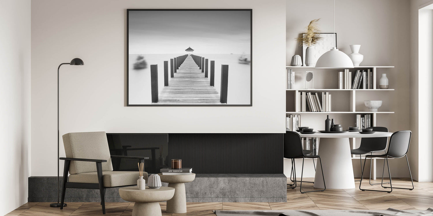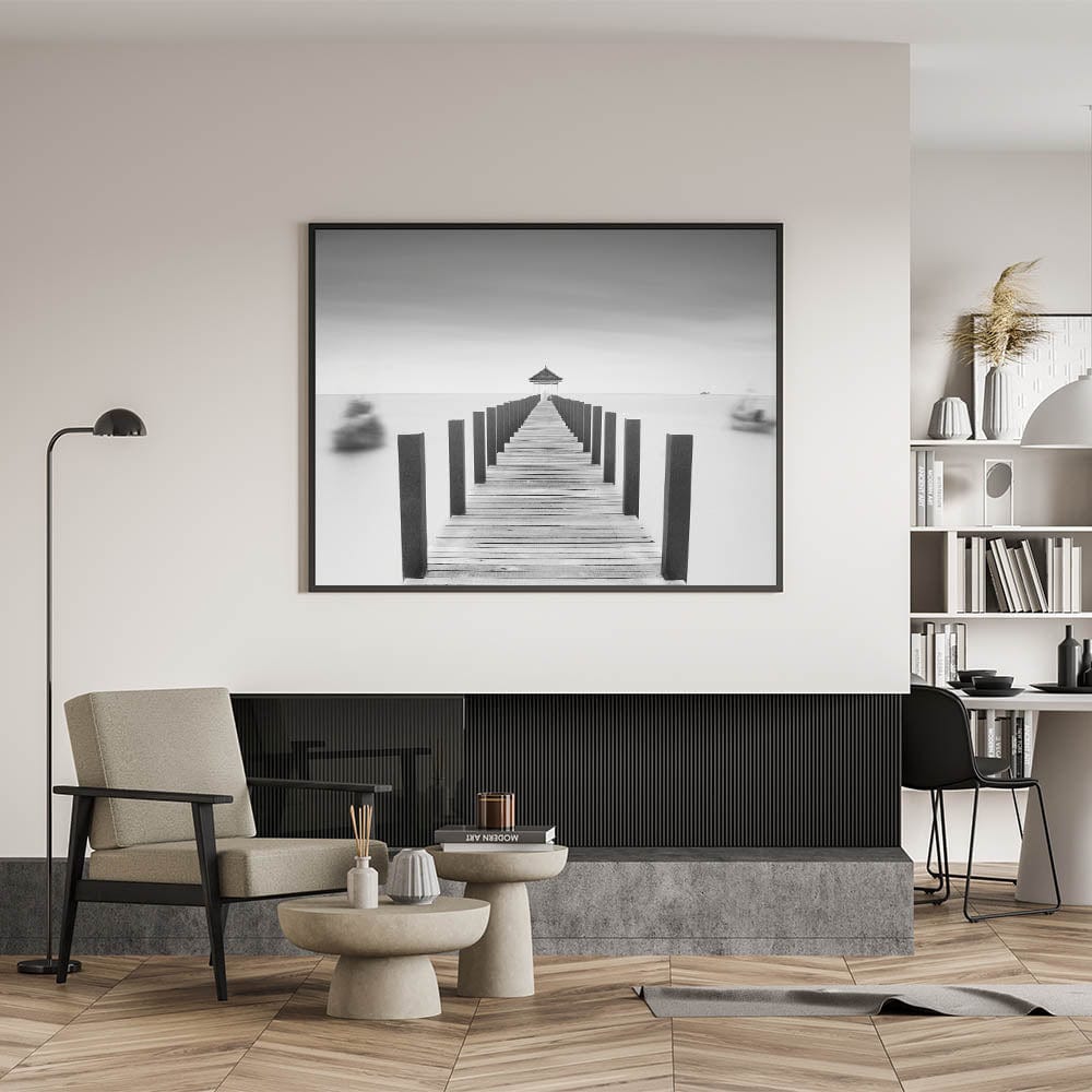 Step into serenity with this stunning fine art photography framed print. Featuring a long wooden pier extending into a calm, misty seascape, this black-and-white composition evokes a sense of peace and solitude. The long exposure technique softens the water’s surface, creating a dreamlike contrast between the still structure and the blurred motion of distant boats.