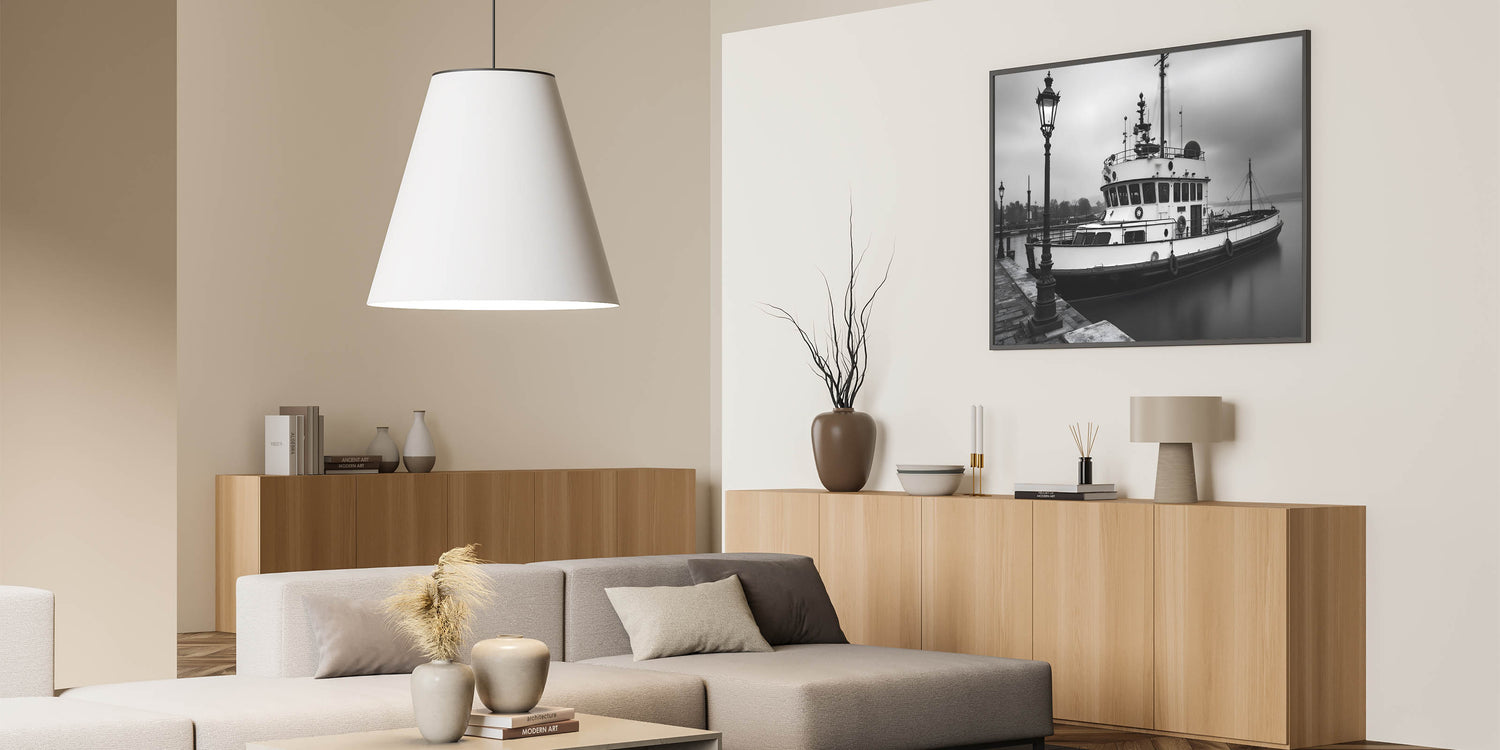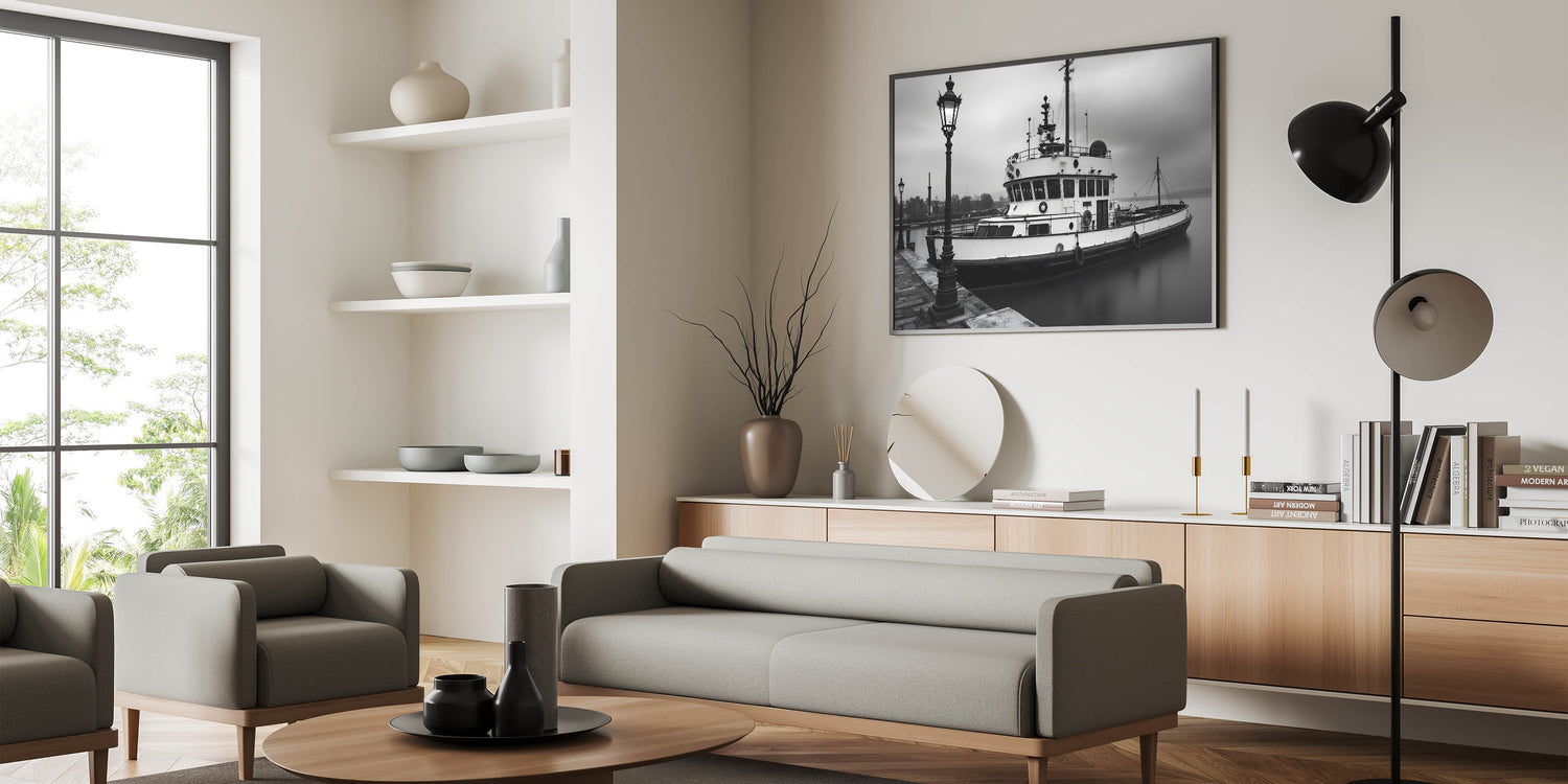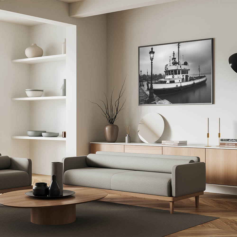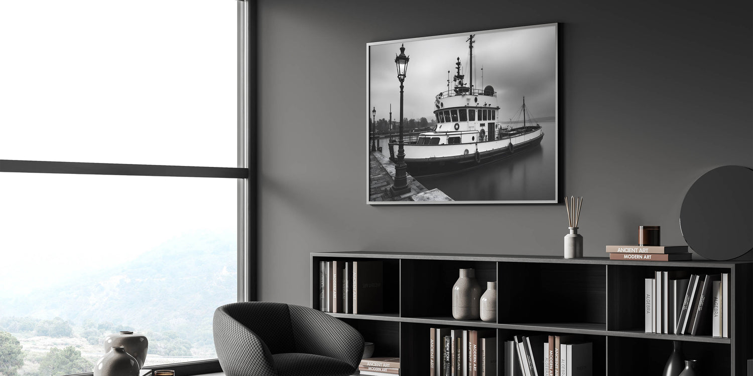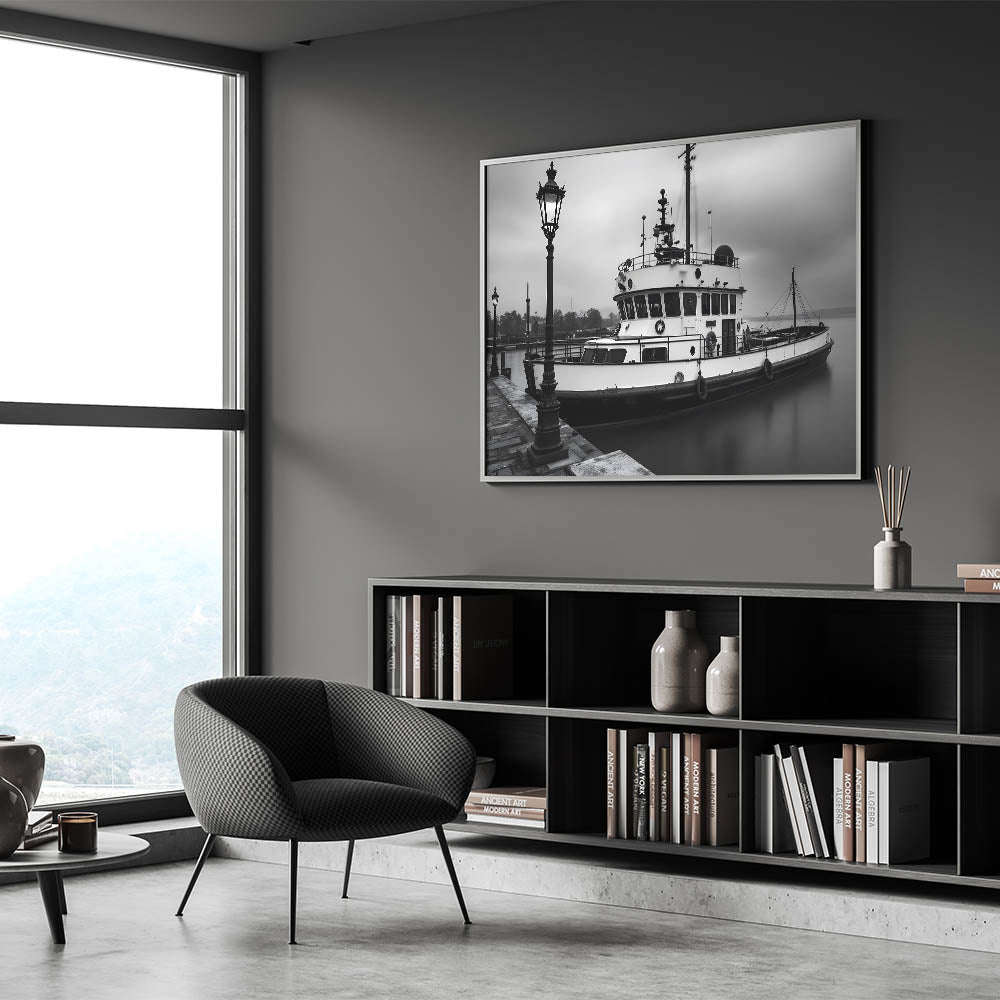 Step into a world of nautical nostalgia with this black and white fine art photography print. This stunning piece captures a vintage tugboat resting in the harbor, surrounded by mist and illuminated by classic street lamps. The play of light and shadow enhances the depth of the image, creating a timeless, cinematic aesthetic.