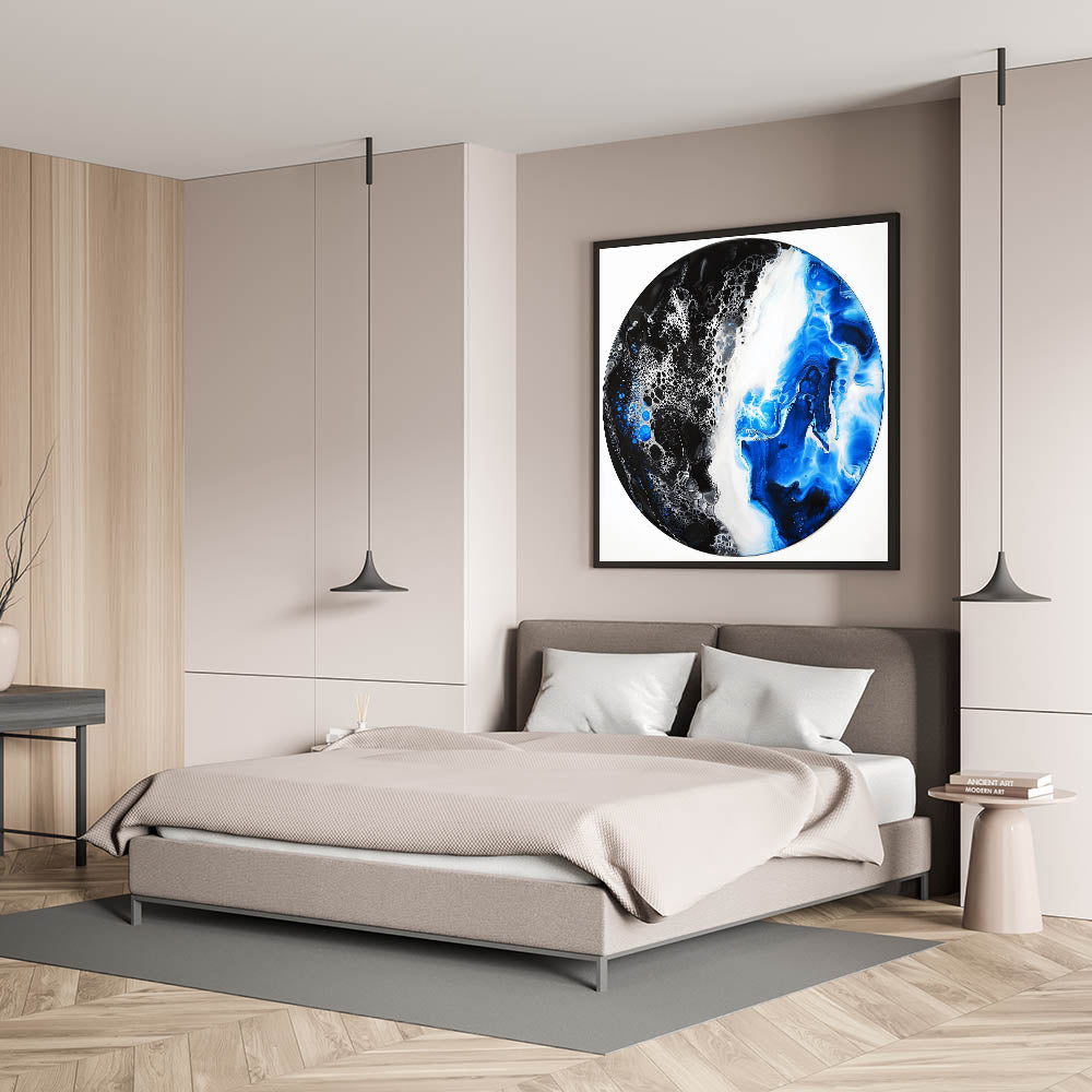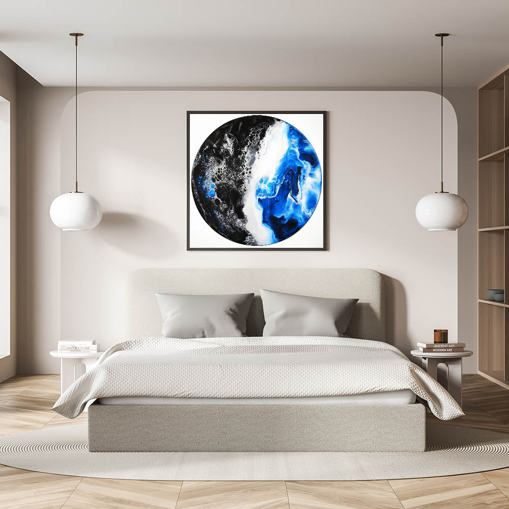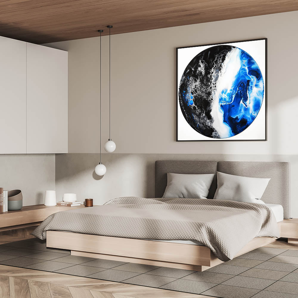 Enhance your bedroom with this modern bedroom wall art, featuring a mesmerizing fusion of deep blue, black, and white in a striking circular composition. This high-quality framed canvas print captures fluid abstract textures, creating a bold yet elegant visual impact. The dynamic contrast of dark and light hues makes it an eye-catching acrylic bedroom wall art piece, perfect for contemporary interiors.