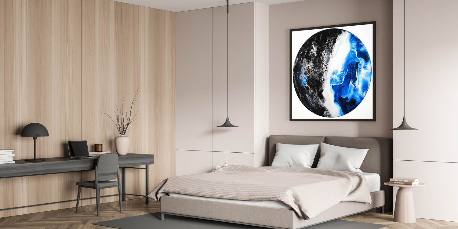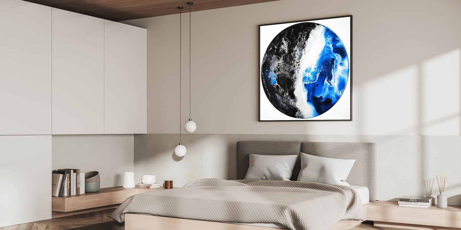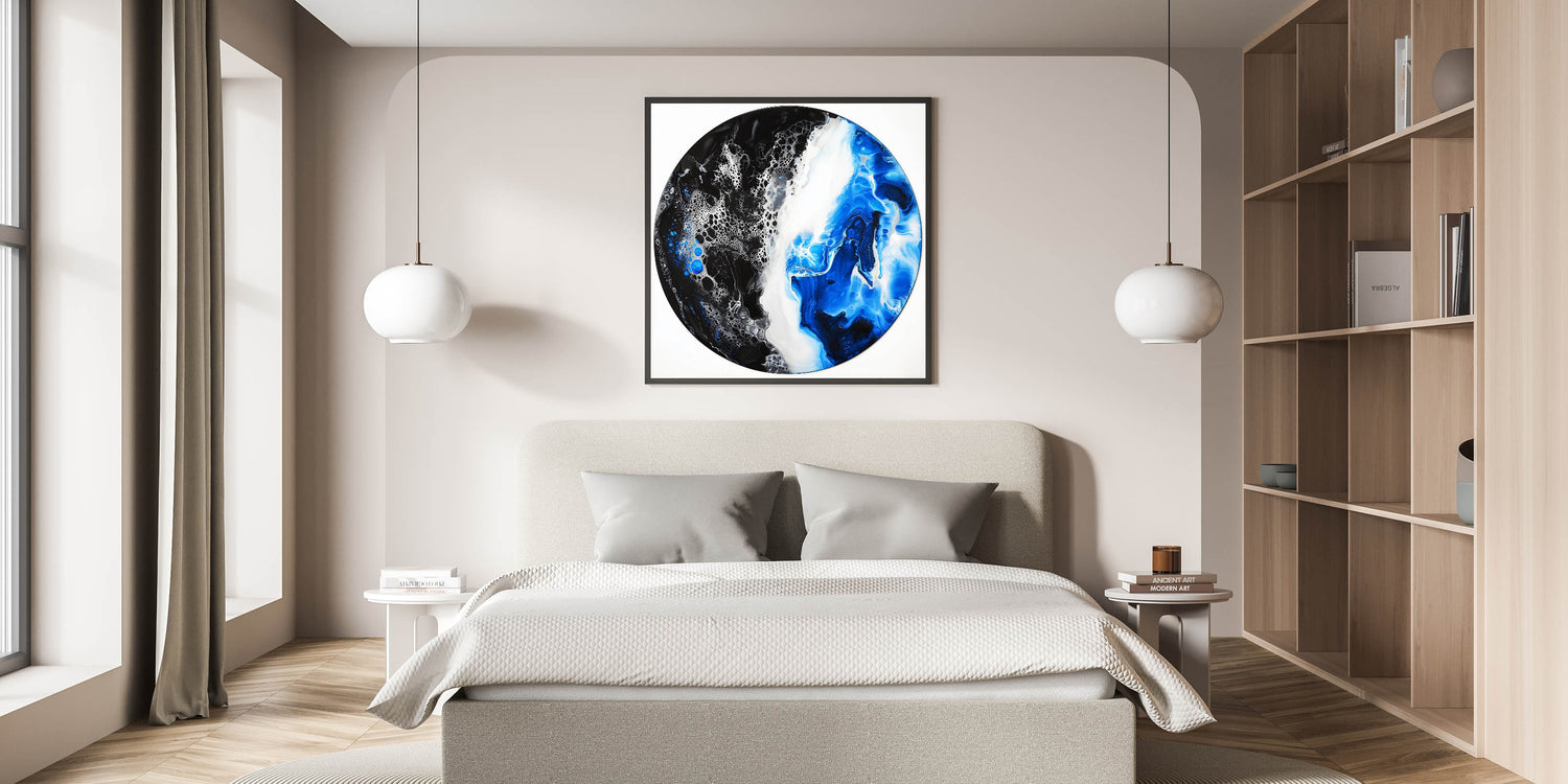 Enhance your bedroom with this modern bedroom wall art, featuring a mesmerizing fusion of deep blue, black, and white in a striking circular composition. This high-quality framed canvas print captures fluid abstract textures, creating a bold yet elegant visual impact. The dynamic contrast of dark and light hues makes it an eye-catching acrylic bedroom wall art piece, perfect for contemporary interiors.