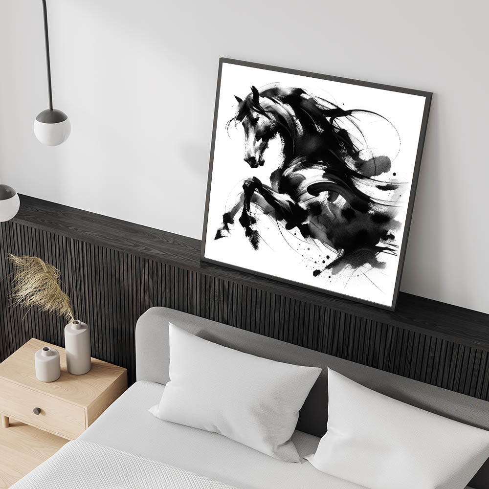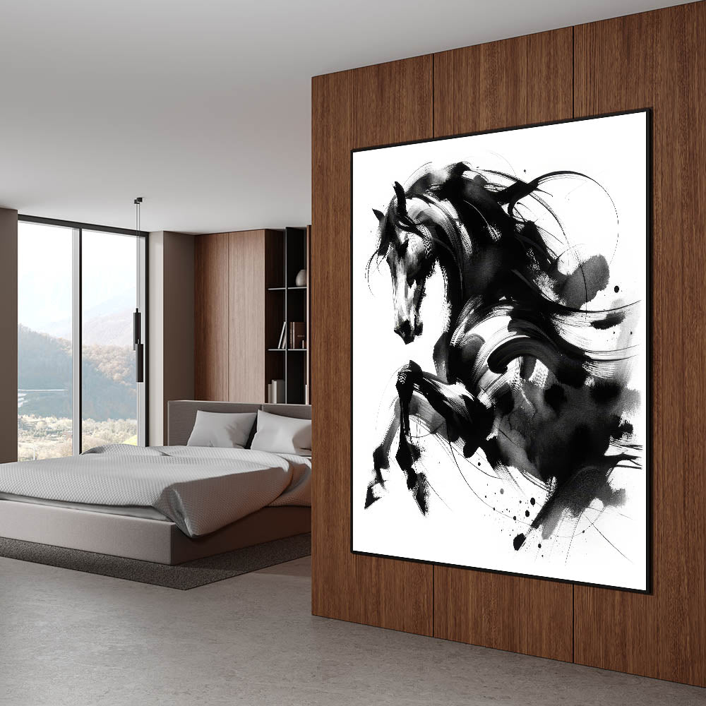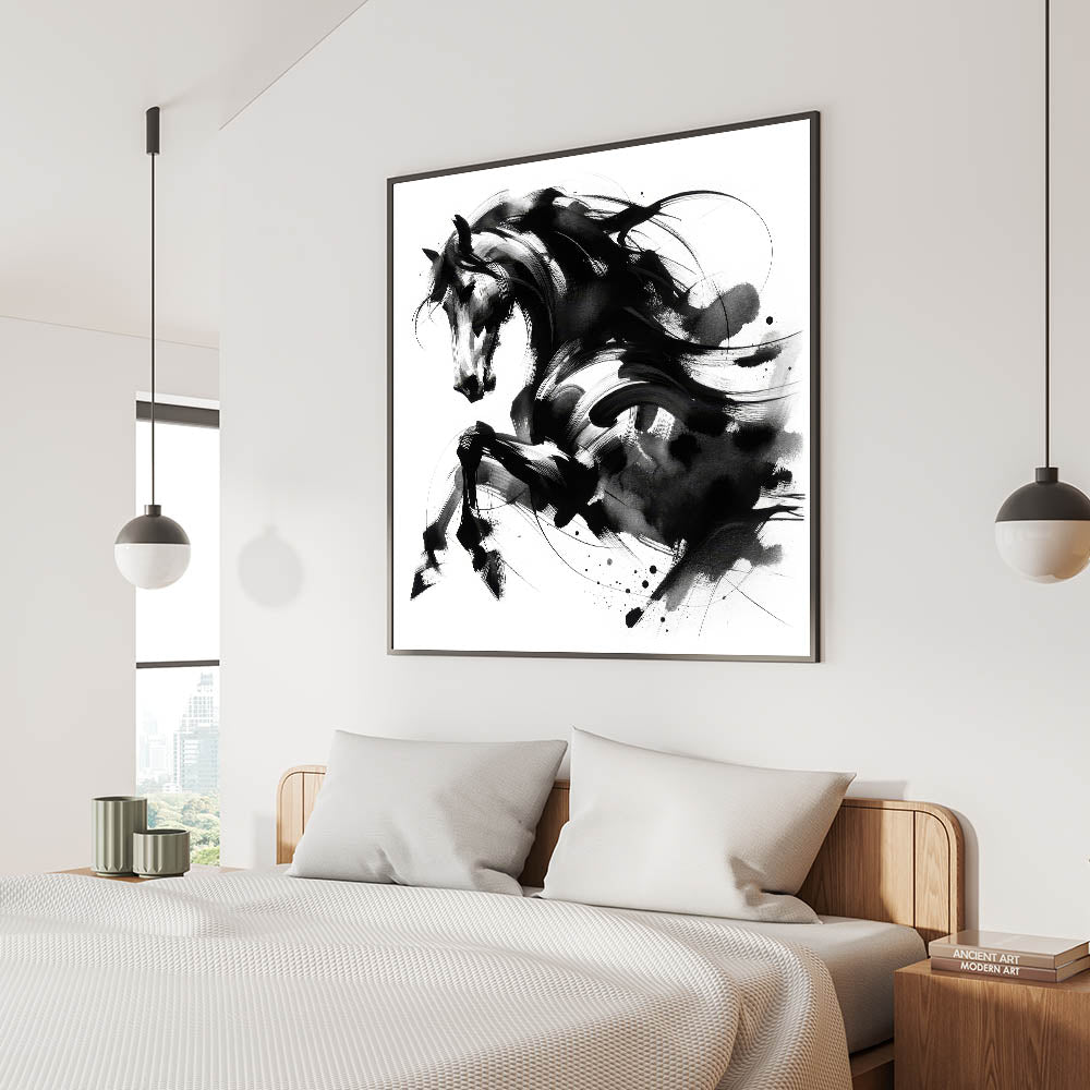 Bring power and movement into your bedroom with this abstract black and white horse wall art, capturing the energy and grace of a galloping horse. The expressive brushstrokes and fluid ink splashes create a modern and artistic interpretation, making it a striking focal point in any contemporary bedroom setting.