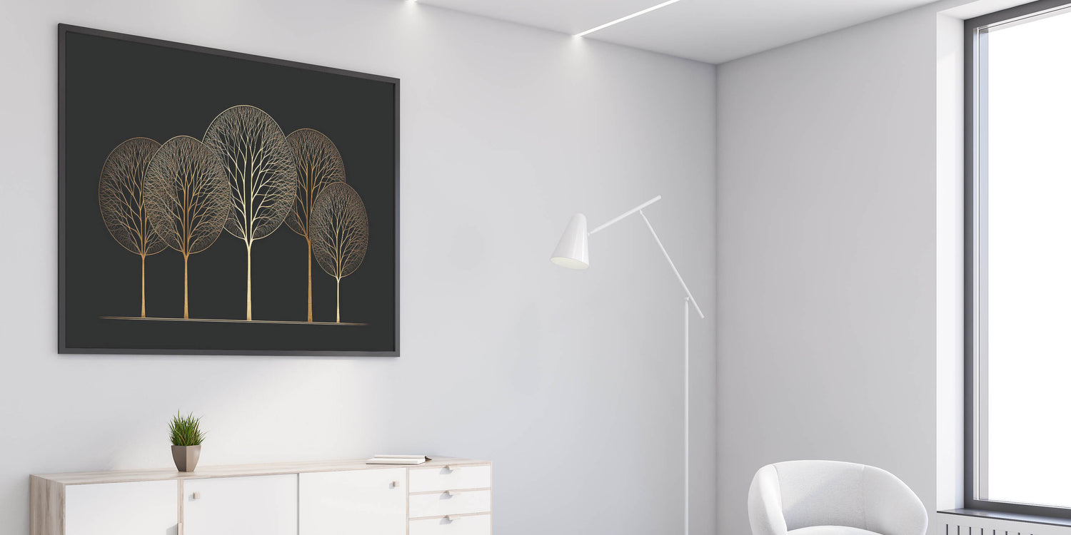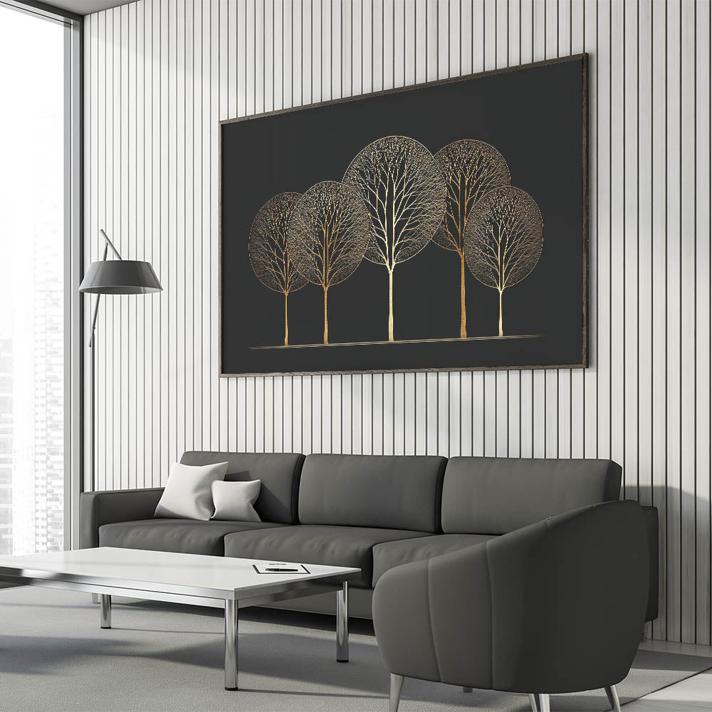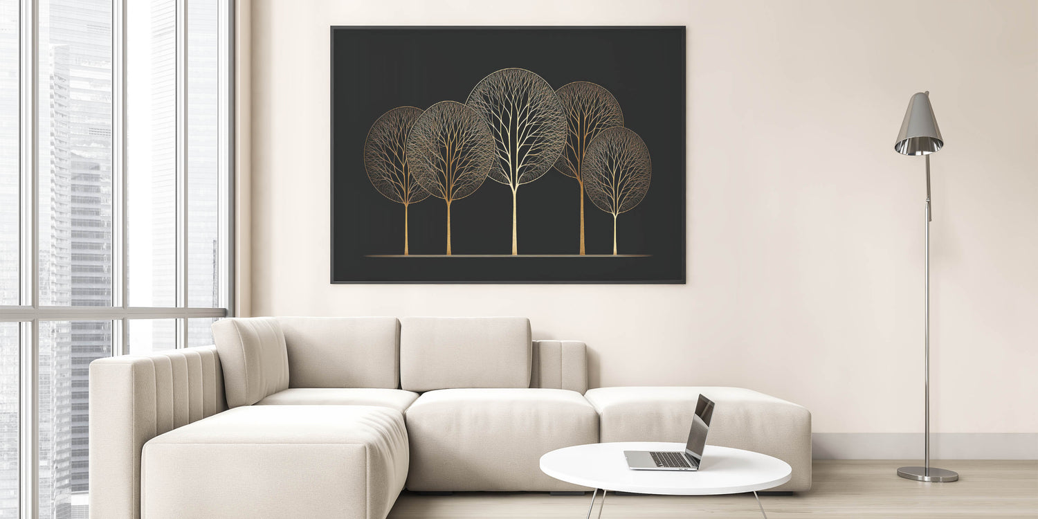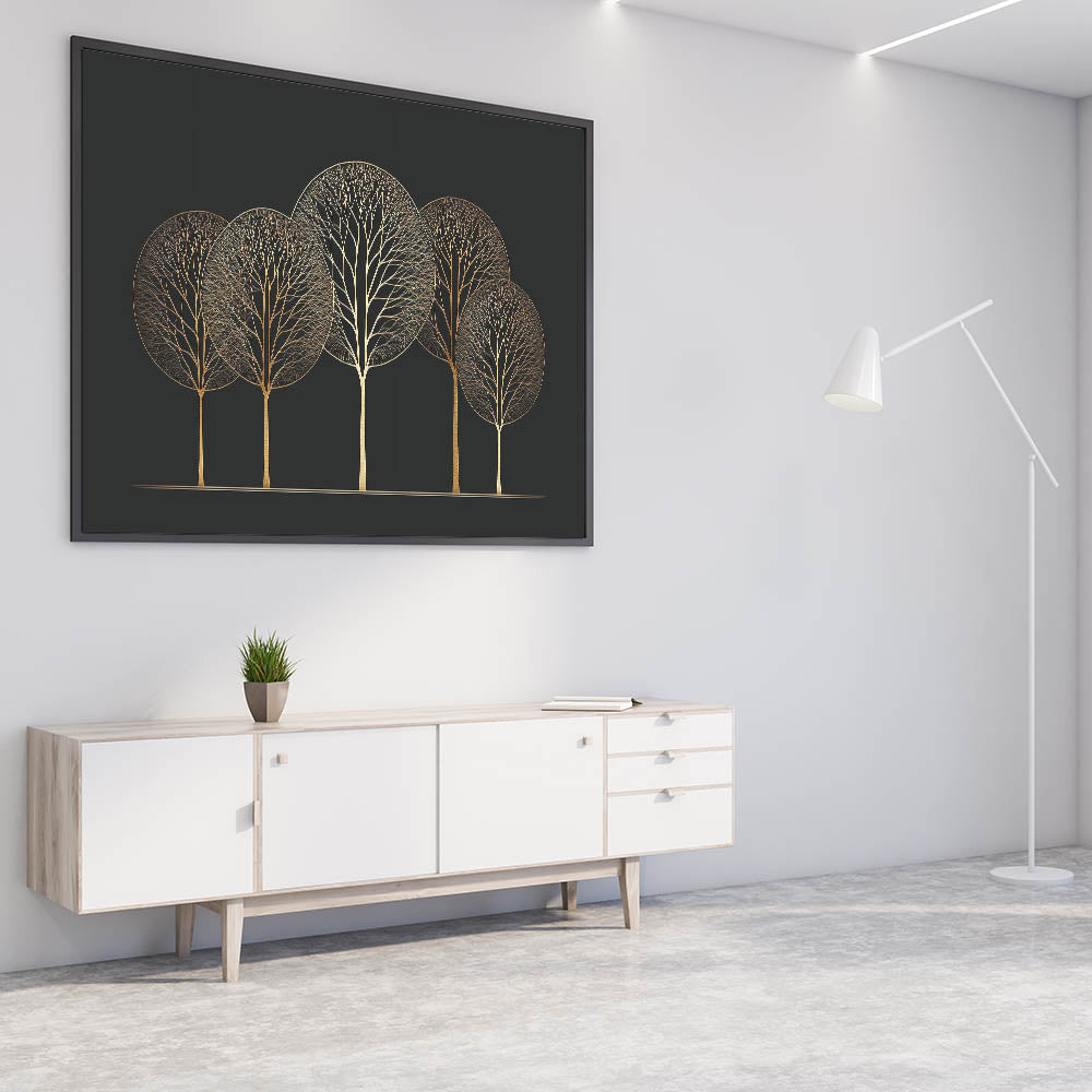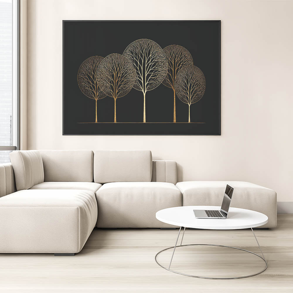 Elevate your decor with this striking abstract botanical print, featuring a row of golden trees set against a deep black background. This artwork combines modern design elements with nature-inspired shapes, making it an ideal piece for contemporary interiors. The intricate detailing of the branches and the warm gold tones create a captivating contrast, adding depth and sophistication to any space.
