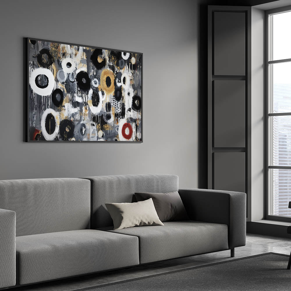Add energy and sophistication to your space with this living room wall art, featuring an expressive black, white, gold, and red abstract circular design. The fluid brushstrokes, layered textures, and dynamic drips bring a sense of movement and contemporary style, making this modern wall art perfect for modern living room decor. Whether placed in a minimalist setting or paired with bold interiors, this canvas wall art makes a stunning focal point.