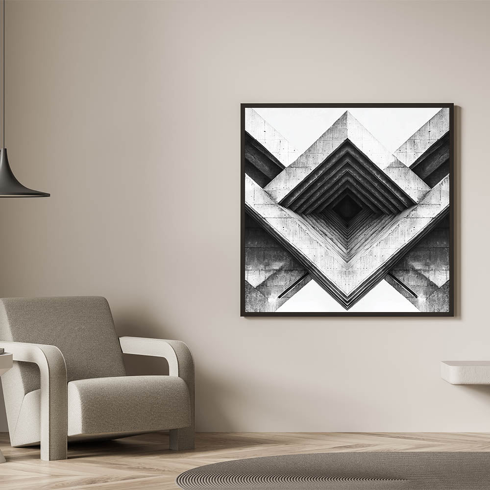 Add a bold and modern touch to your space with this abstract concrete geometry wall art. Featuring a striking composition of symmetrical architectural lines and dynamic shapes, this monochrome piece embodies the essence of modern minimalism. Its intricate detailing and sharp contrasts create a sense of depth and intrigue, making it an ideal statement piece for contemporary interiors.