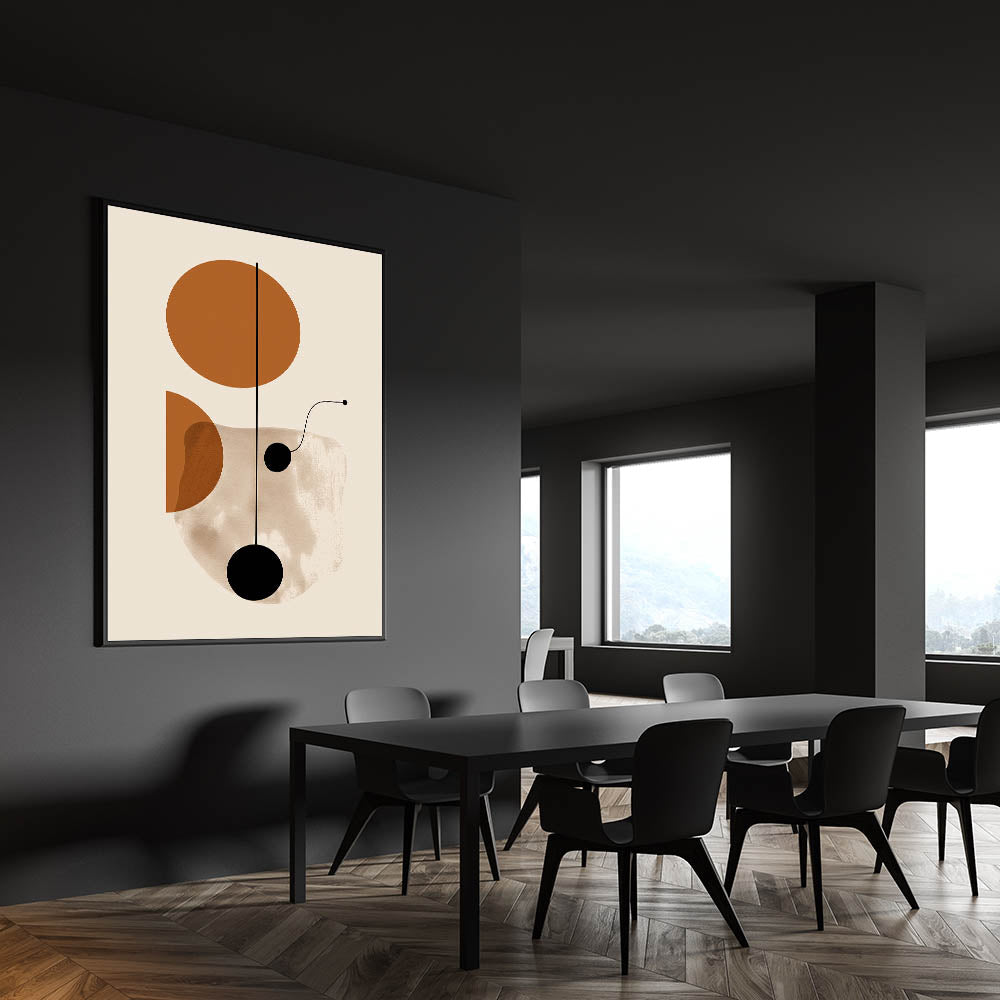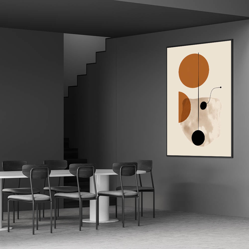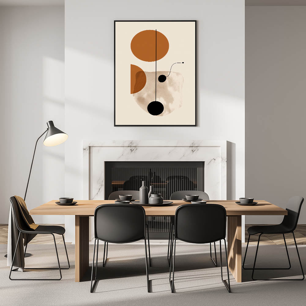 Upgrade your dining space with this elegant dining room wall art, a perfect blend of abstract geometry and earthy tones. Featuring warm brown, beige, and black elements, this modern dining room art offers a sophisticated and contemporary appeal. Its balanced shapes and minimalistic style create a customizable dining area print that complements modern, Scandinavian, or rustic interiors.