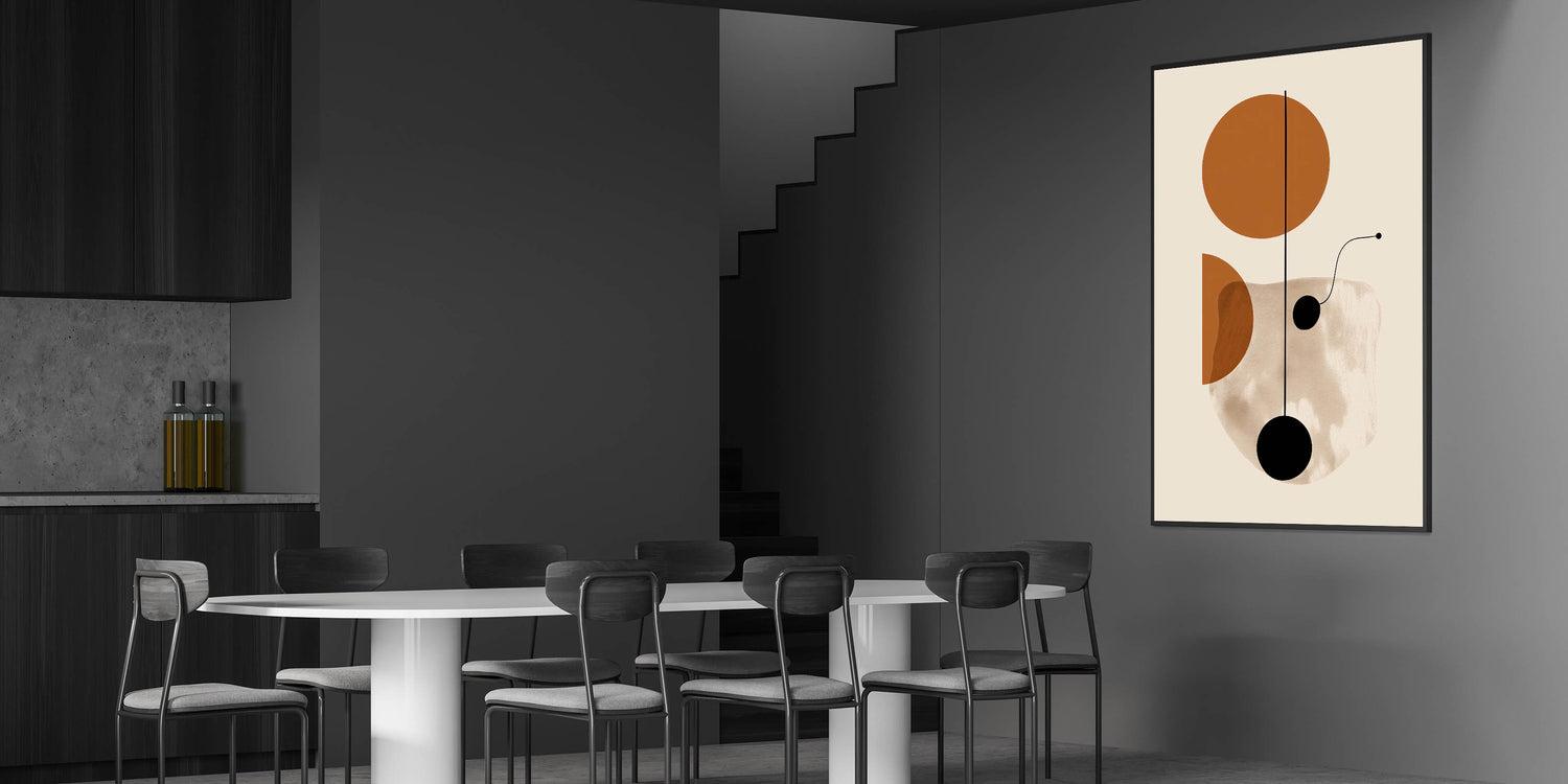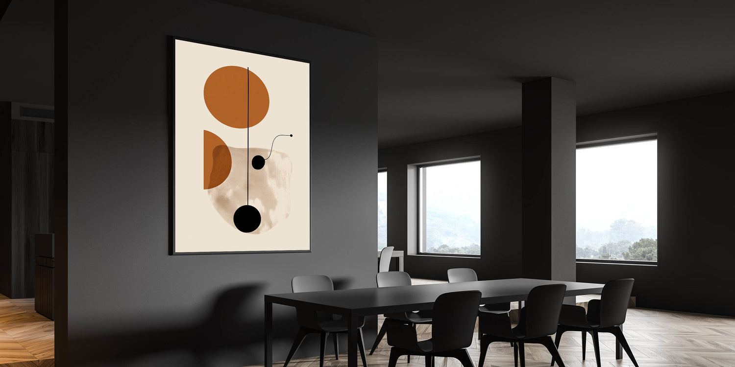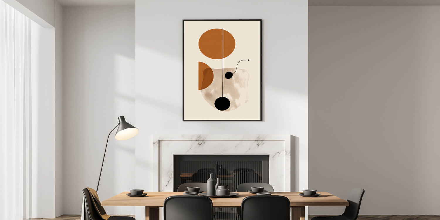 Upgrade your dining space with this elegant dining room wall art, a perfect blend of abstract geometry and earthy tones. Featuring warm brown, beige, and black elements, this modern dining room art offers a sophisticated and contemporary appeal. Its balanced shapes and minimalistic style create a customizable dining area print that complements modern, Scandinavian, or rustic interiors.