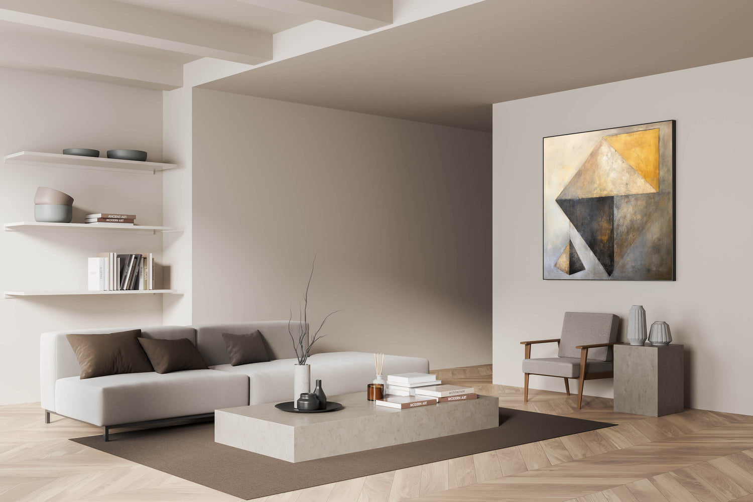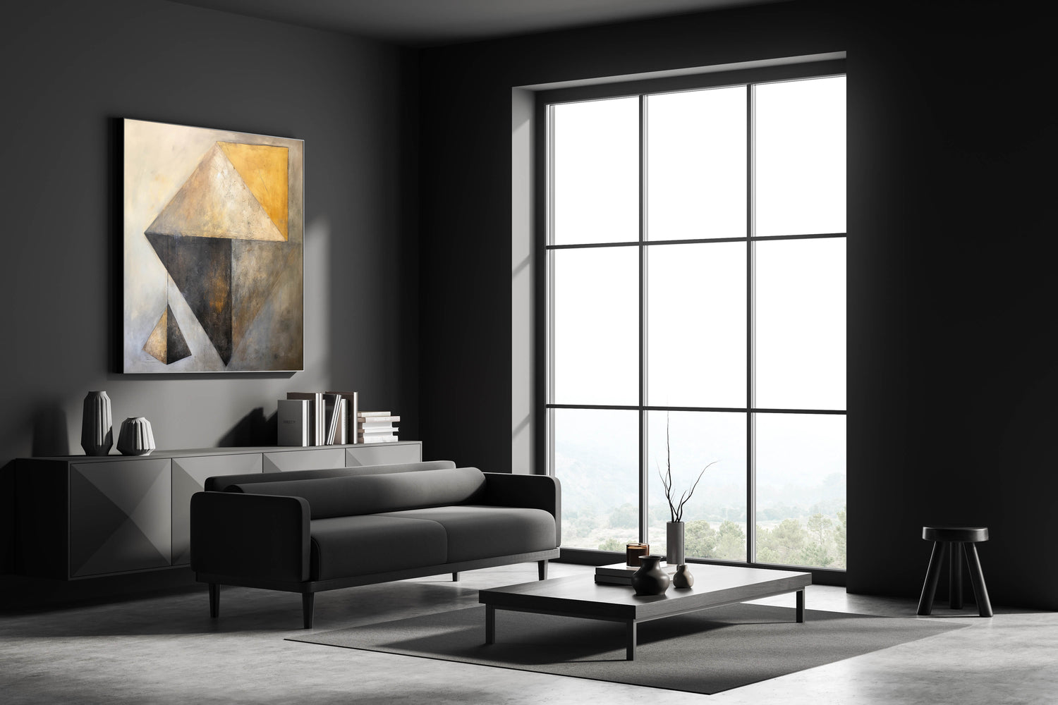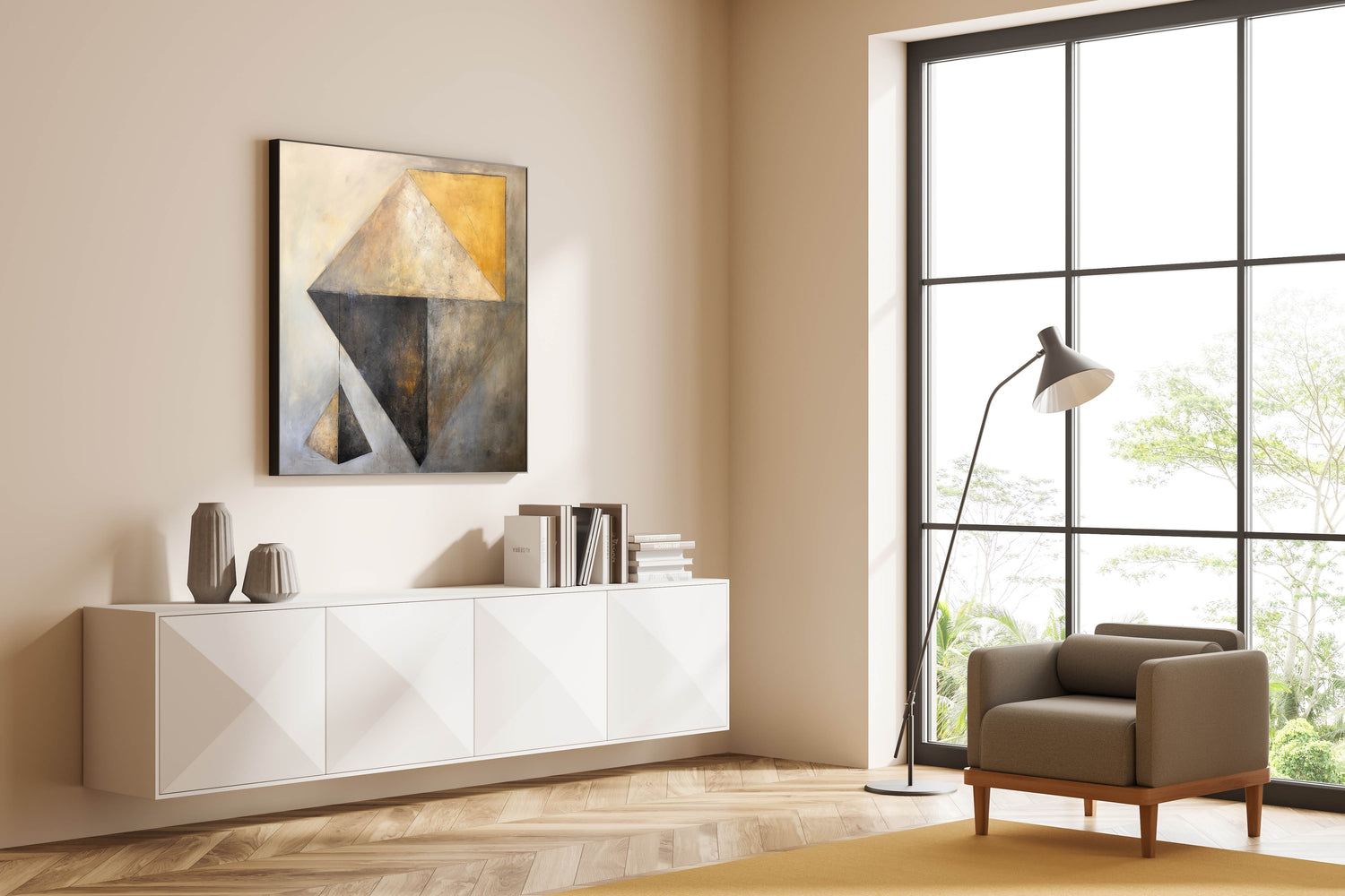 This modern geometric piece is perfect for living rooms, offices, or bedrooms, bringing an element of elegance and artistic sophistication to your decor. The clean lines and distinct shapes make it a versatile addition, suited for various interior styles.