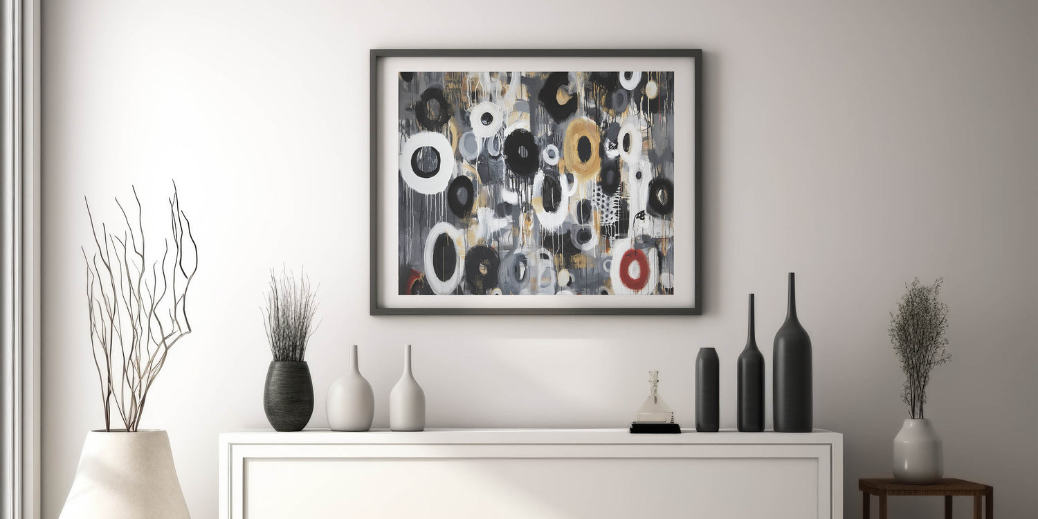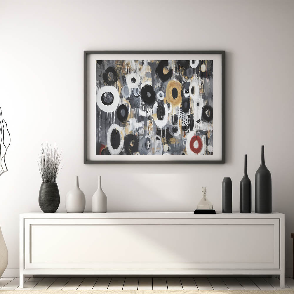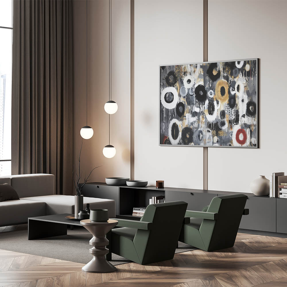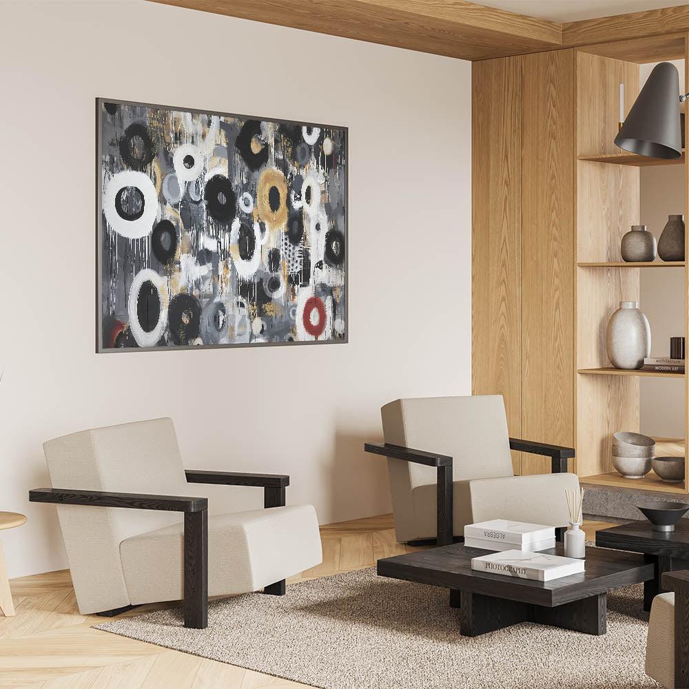 Add depth and energy to your interiors with this Abstract Geometric Painting, featuring bold circular shapes in a textured, layered composition. The artwork’s palette includes dynamic tones of black, white, gold, and muted red, interspersed with abstract drips and splashes for a modern aesthetic. Perfect for contemporary or industrial settings, this piece seamlessly enhances modern home decor with its geometric abstract designs.
