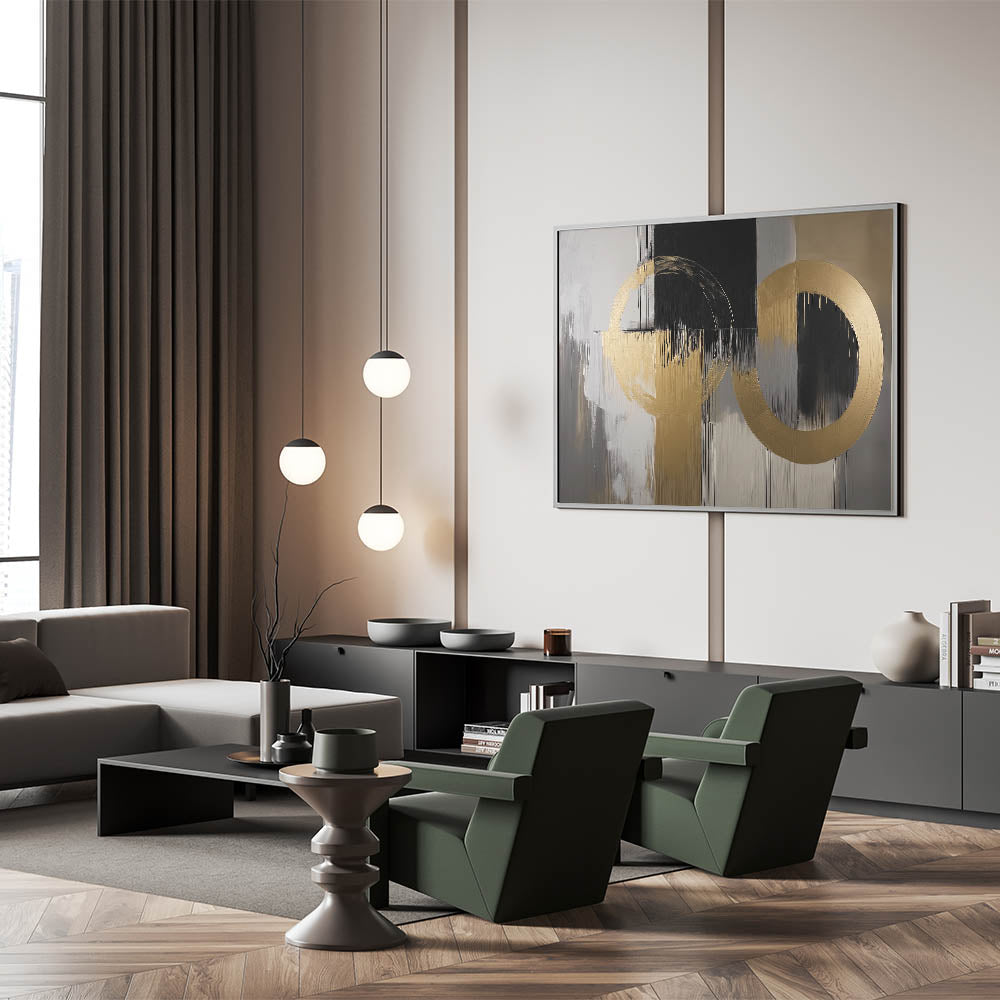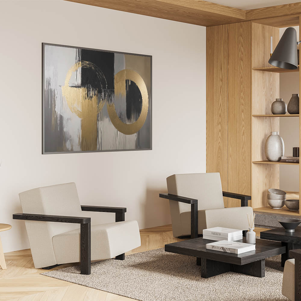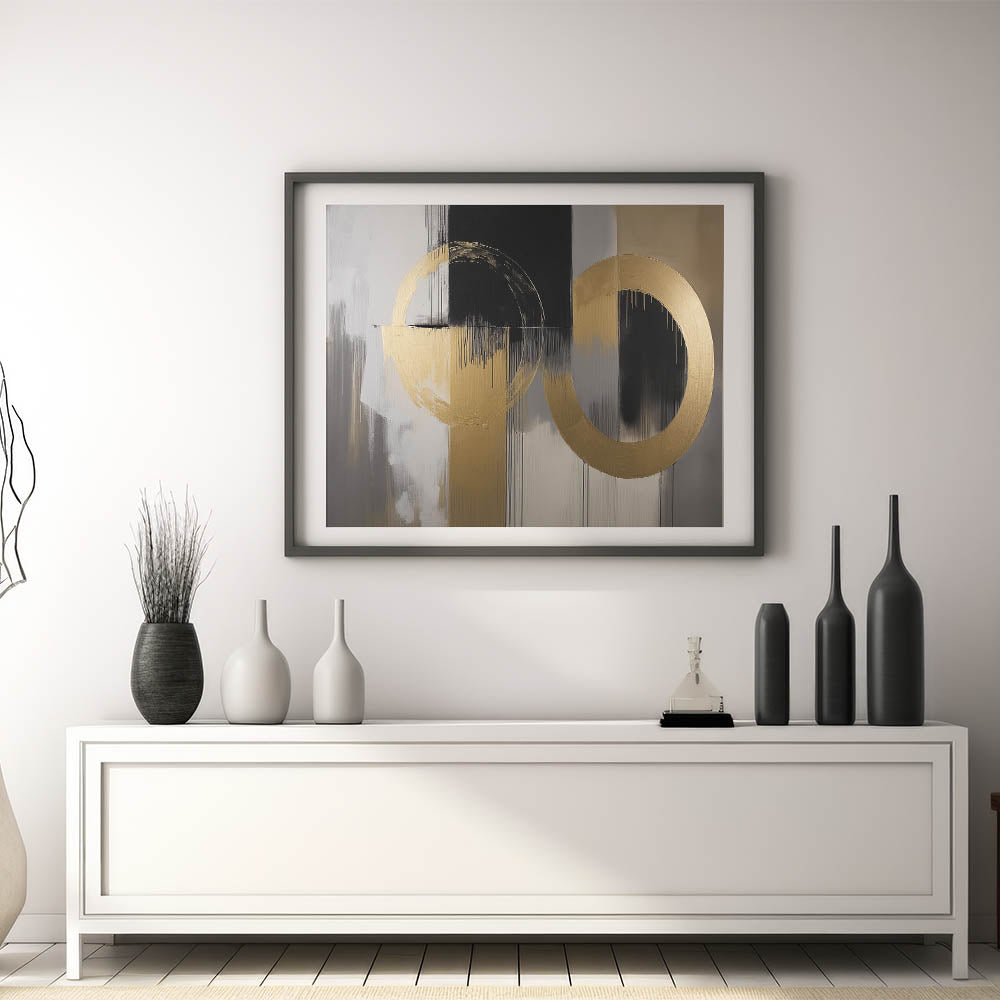 Bring modern elegance to your home with this Abstract Geometric Wall Art, featuring two overlapping gold circles set against an abstract black, gray, and white textured background. The dynamic design incorporates dripping metallic gold accents that contrast beautifully with the muted tones, creating a bold and sophisticated centerpiece for contemporary interiors.