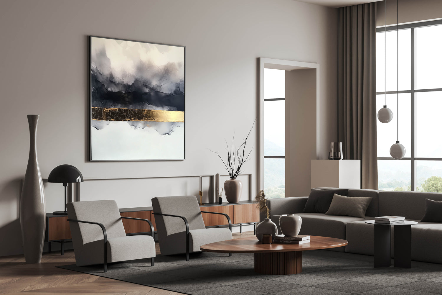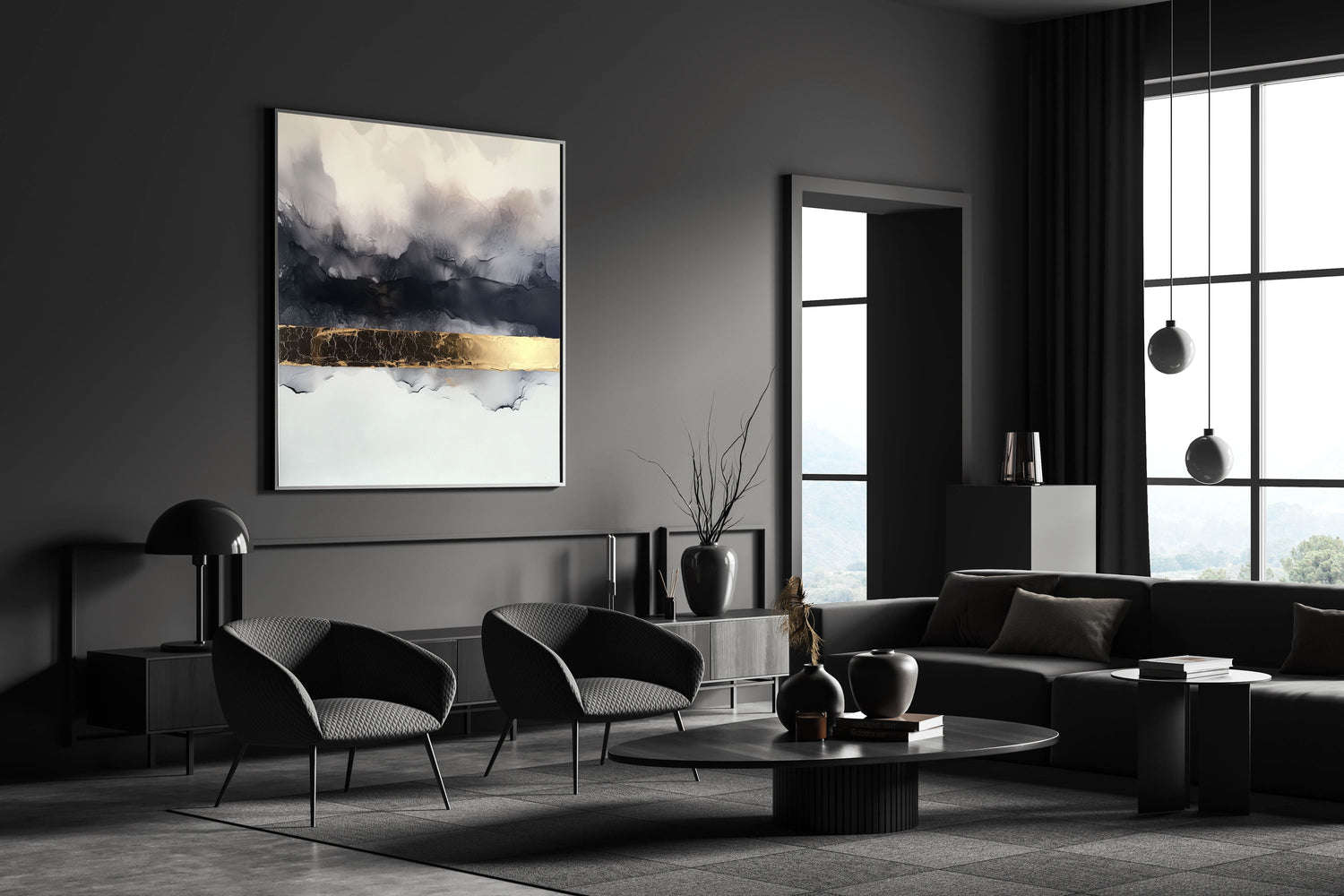 Add a touch of luxury to your décor with this Abstract Gold and Gray Art. This striking piece combines soft gray tones with bold black and a shimmering metallic gold accent, creating a perfect blend of elegance and modernity. The textured design features fluid, cloudy strokes with a central band of gold, giving it a sophisticated and timeless look. Ideal for minimalist, industrial, or contemporary interiors, this artwork transforms any space into a gallery of style.