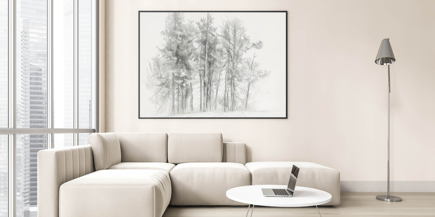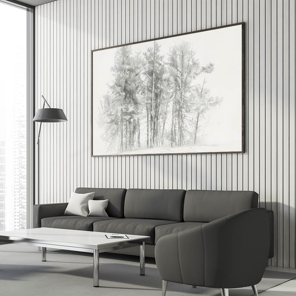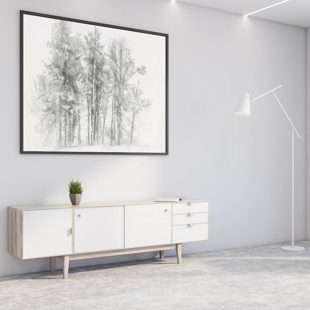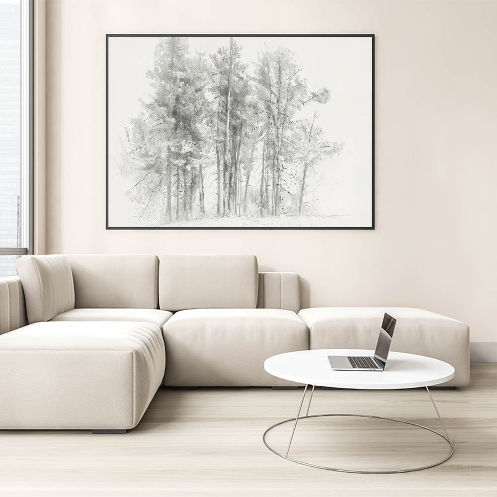 Immerse yourself in the tranquil beauty of nature with this Abstract Landscape Drawing, featuring a serene depiction of a pine forest in monochrome tones. The intricate pencil strokes and delicate shading capture the quiet essence of a forest landscape, making this artwork a calming and timeless addition to your decor.
