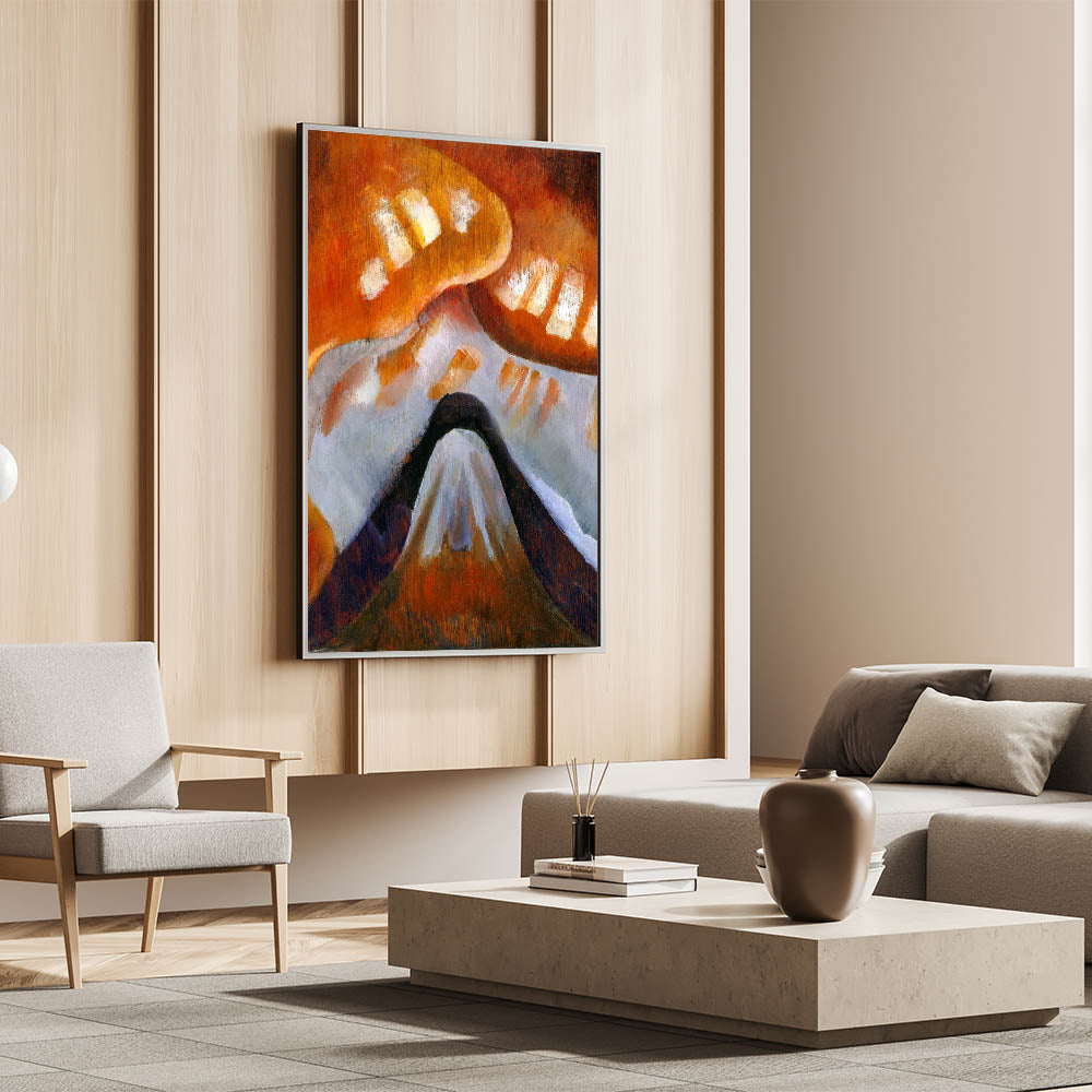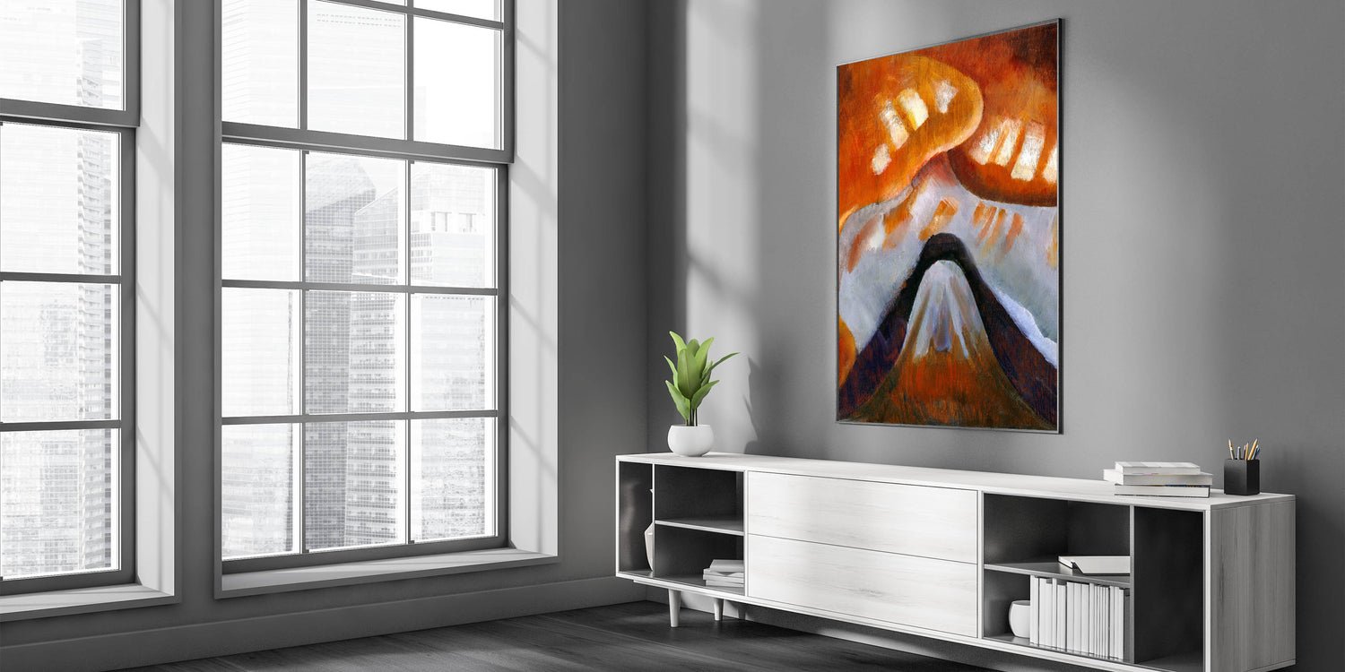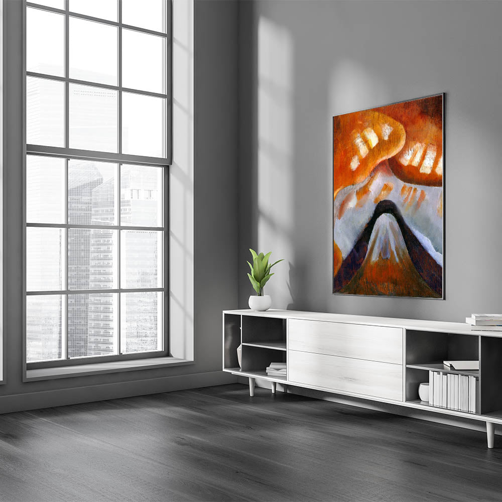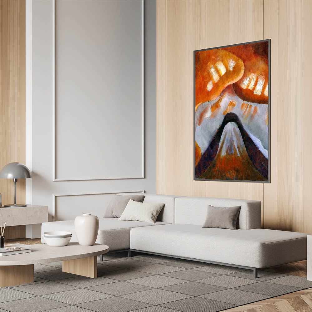 Add a touch of elegance to your space with this stunning piece of Abstract Modern Art. This unique artwork features warm hues of orange and brown, intertwined with white and black elements, forming a mesmerizing depiction of abstract mountains. Perfect for creating a focal point in any room, it effortlessly blends with both contemporary and minimalist home decor.