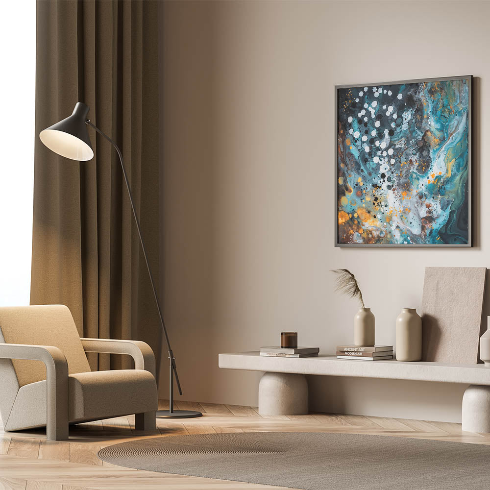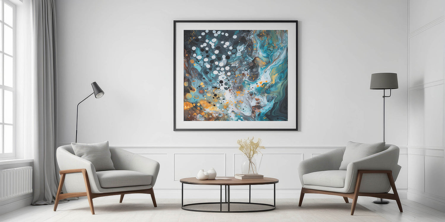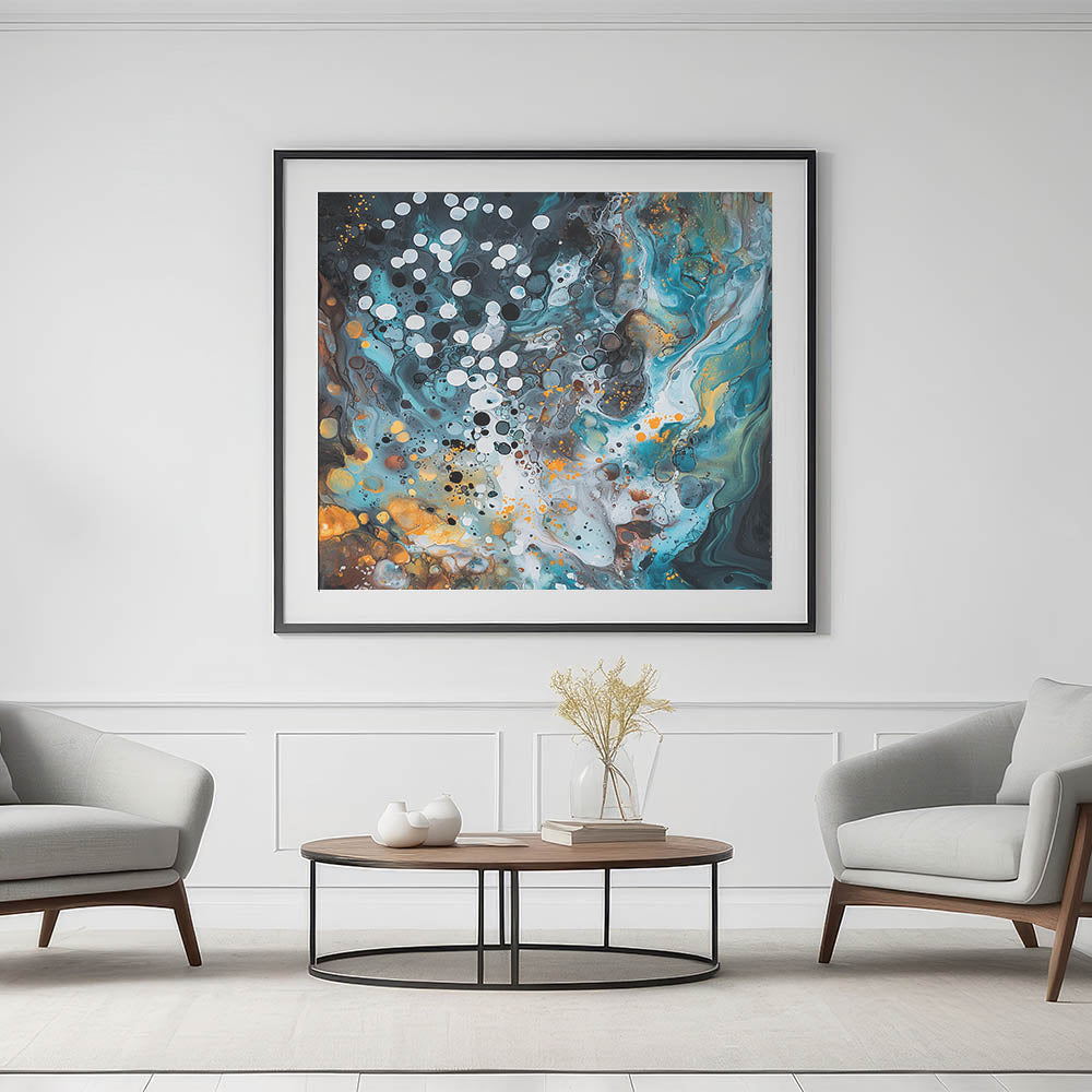 Transform your space with this striking abstract splatter artwork from the "Splatters and Spots in Abstracts" collection. This mesmerizing piece combines a vibrant palette of turquoise, gold, and black with fluid patterns and layered textures. The scattered white and black dots add depth and contrast, creating a design that evokes movement and creativity.