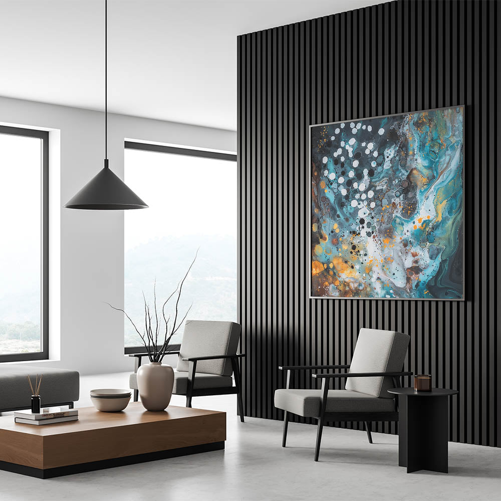 Add a dynamic centerpiece to your decor with this captivating abstract design. Its bold use of color and texture is ideal for creating an inspiring and stylish atmosphere in any living or office space.