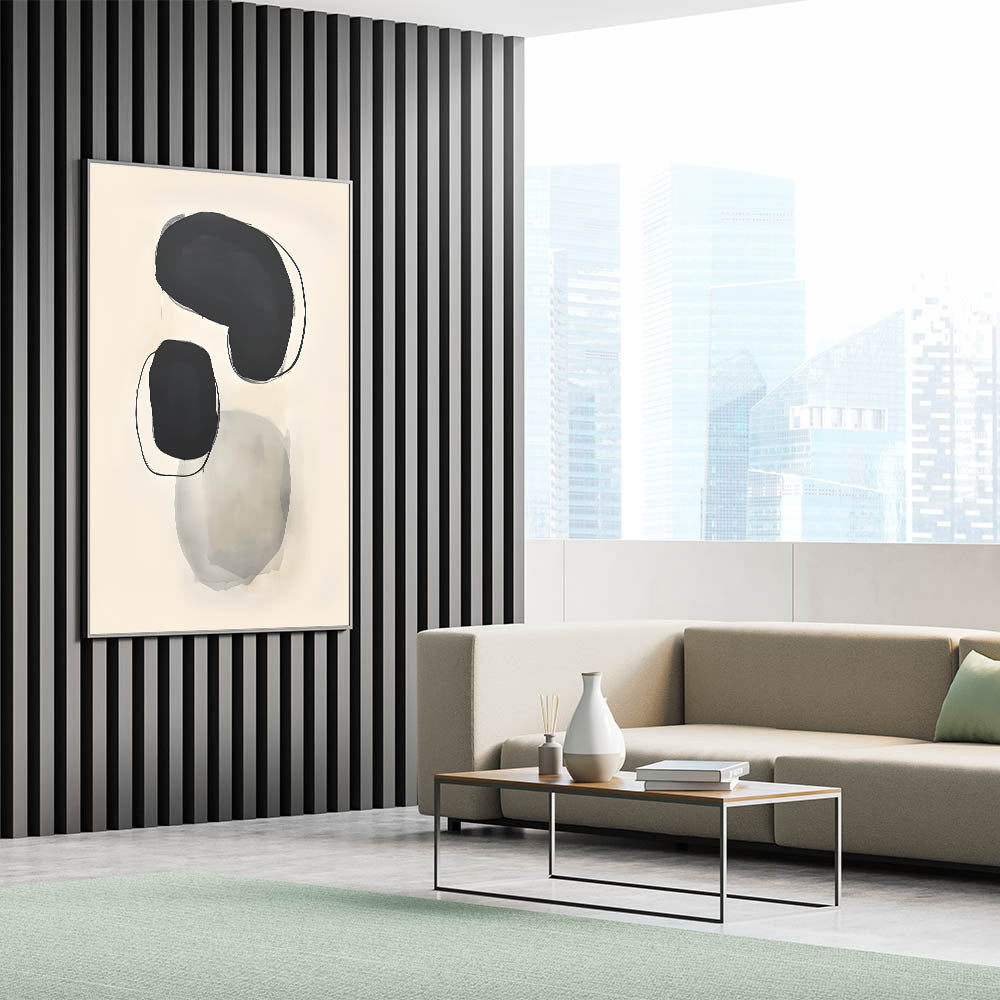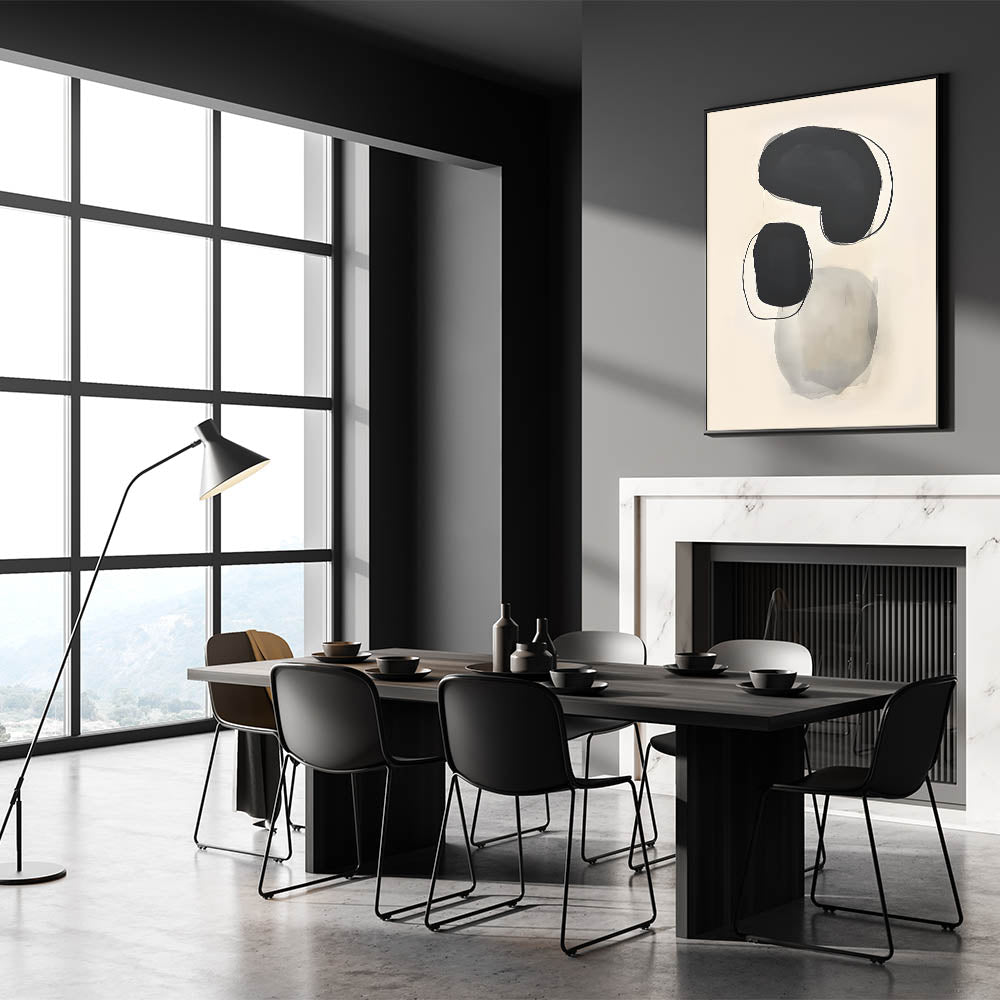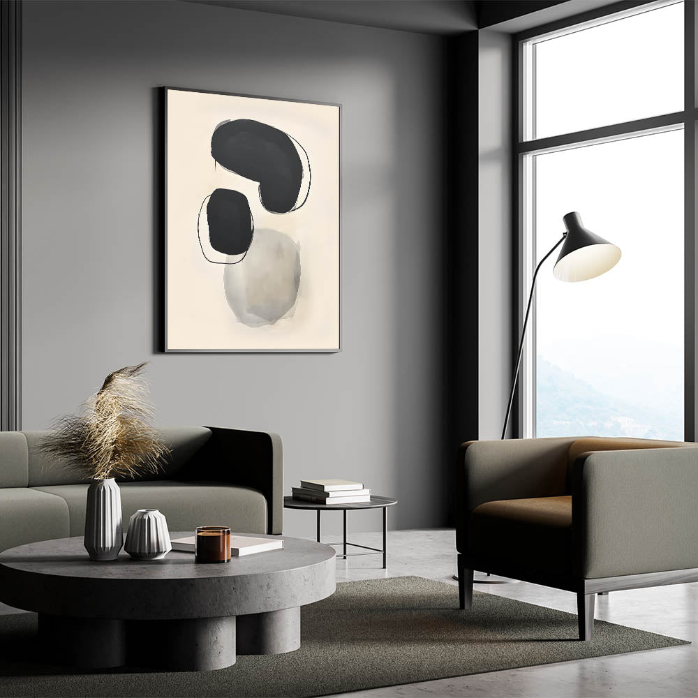 This soulful design from the Abstracts in Earthen Harmony collection brings depth and movement through the balance of shape and shade. Featuring expressive black forms layered above a translucent gray base, this abstract wall art is a subtle yet powerful statement of modern artistic intention. Its warm neutral background enhances its calming and grounding aesthetic.