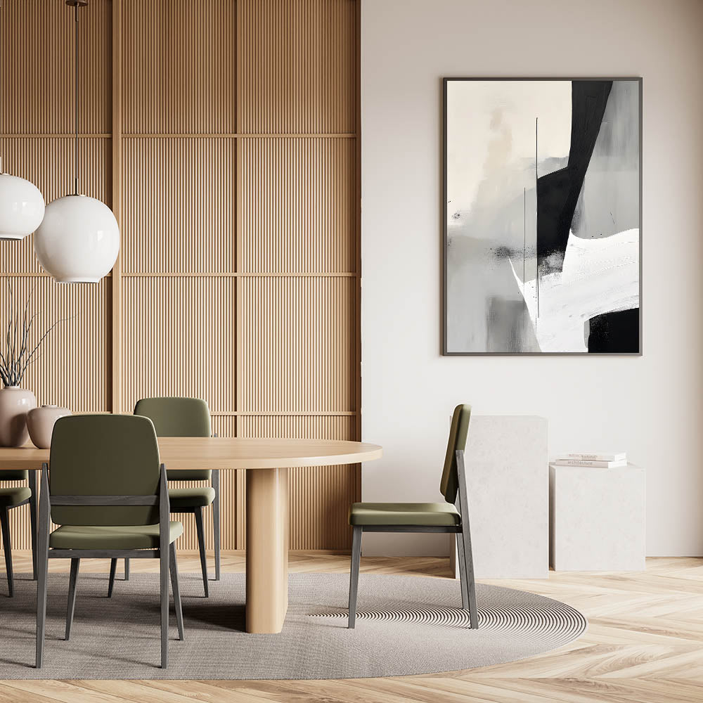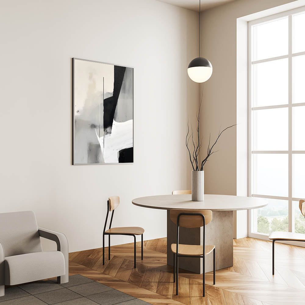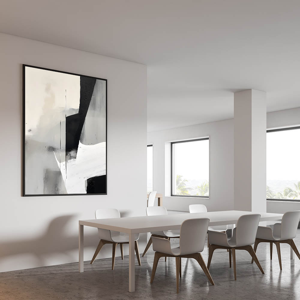 Add modern sophistication to your dining space with acrylic and canvas art for dining spaces, featuring a bold monochrome abstract design. This elegant dining room wall art showcases striking black and white brushstrokes with subtle gray shading, creating a dynamic yet refined composition. Its minimalist aesthetic makes it a perfect choice for contemporary, industrial, and modern interiors.