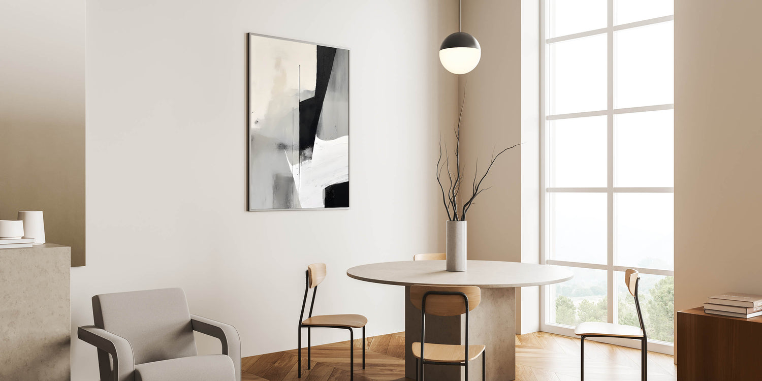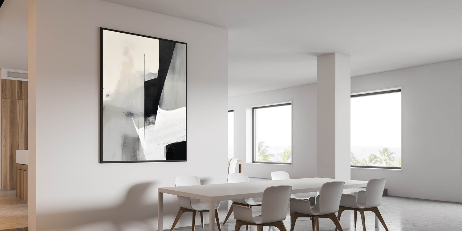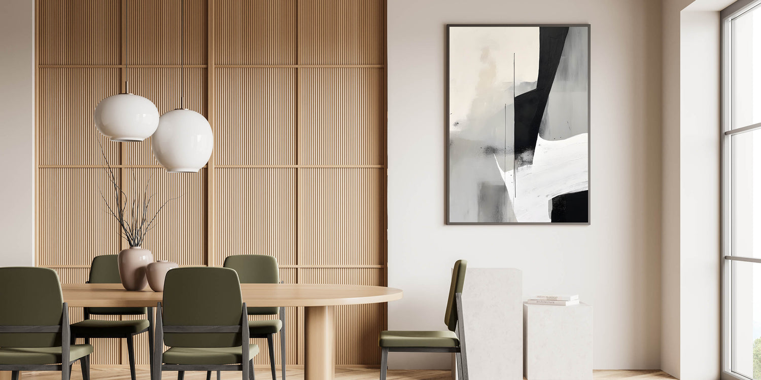 Add modern sophistication to your dining space with acrylic and canvas art for dining spaces, featuring a bold monochrome abstract design. This elegant dining room wall art showcases striking black and white brushstrokes with subtle gray shading, creating a dynamic yet refined composition. Its minimalist aesthetic makes it a perfect choice for contemporary, industrial, and modern interiors.