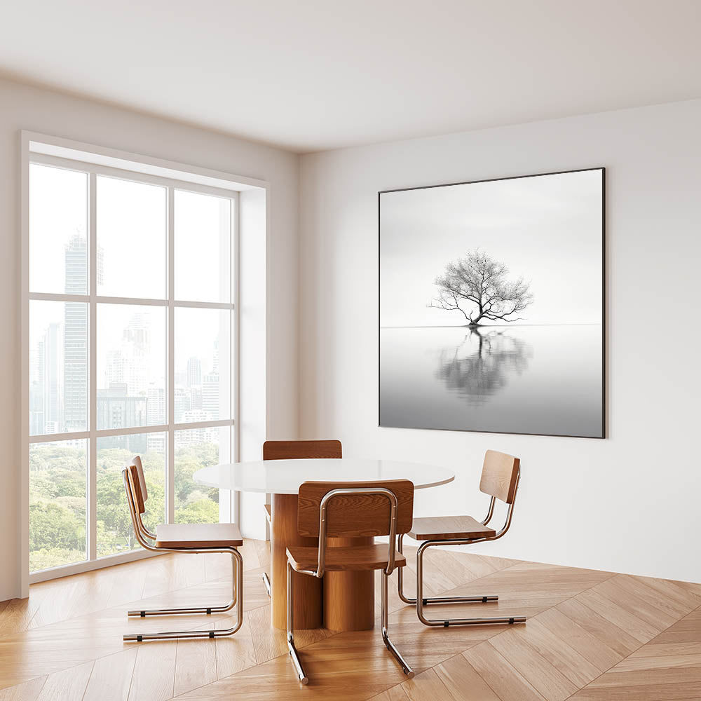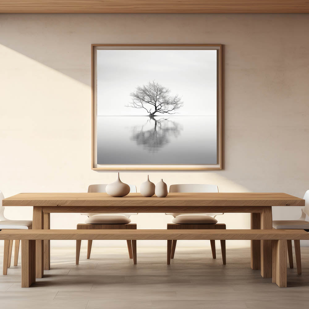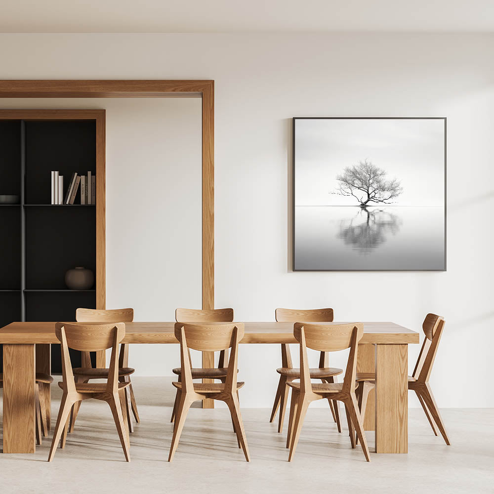 Enhance your dining space with this acrylic dining room artwork, featuring a stunning black and white nature reflection. This captivating composition of a lone tree mirrored in still water evokes tranquility and modern sophistication. The contemporary dining art piece blends seamlessly into minimalist, Scandinavian, or monochrome interiors, making it a timeless addition to your dining room wall decor.