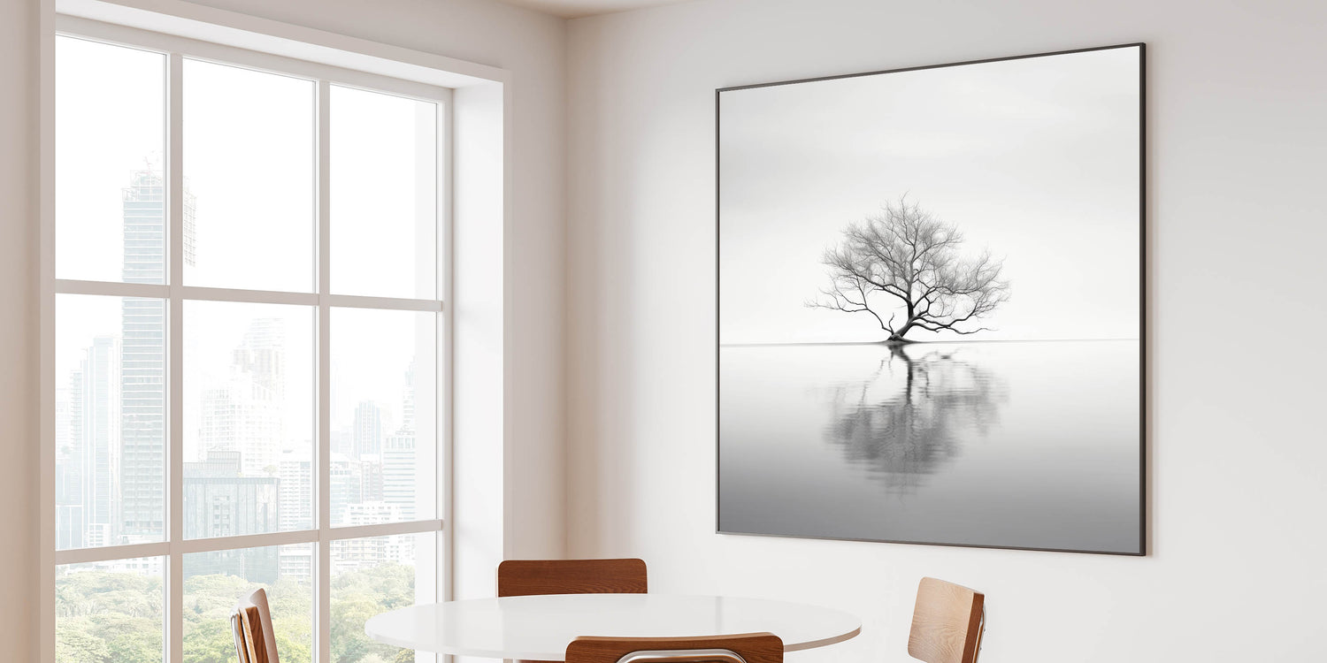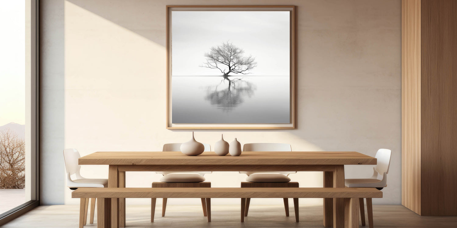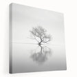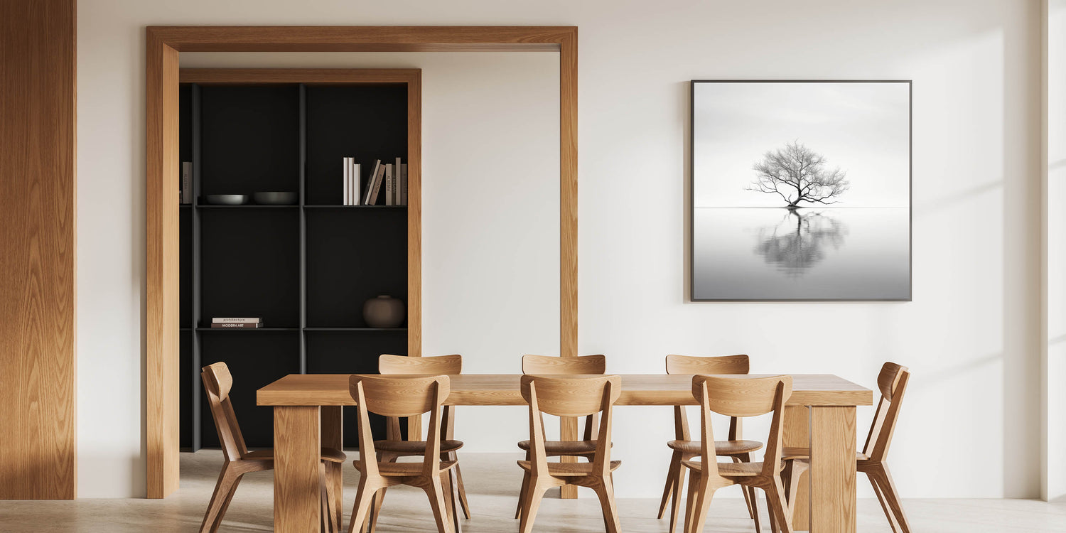 Enhance your dining space with this acrylic dining room artwork, featuring a stunning black and white nature reflection. This captivating composition of a lone tree mirrored in still water evokes tranquility and modern sophistication. The contemporary dining art piece blends seamlessly into minimalist, Scandinavian, or monochrome interiors, making it a timeless addition to your dining room wall decor.