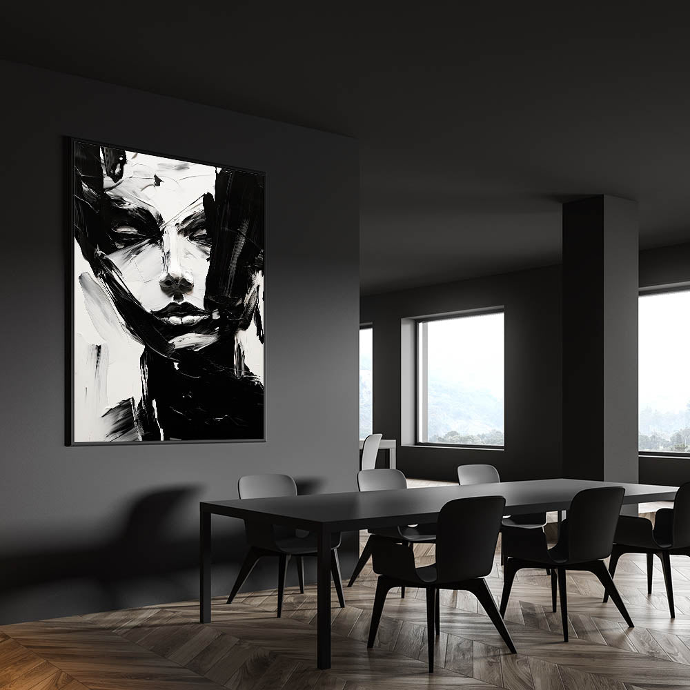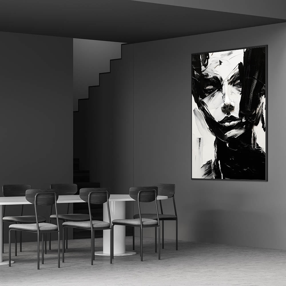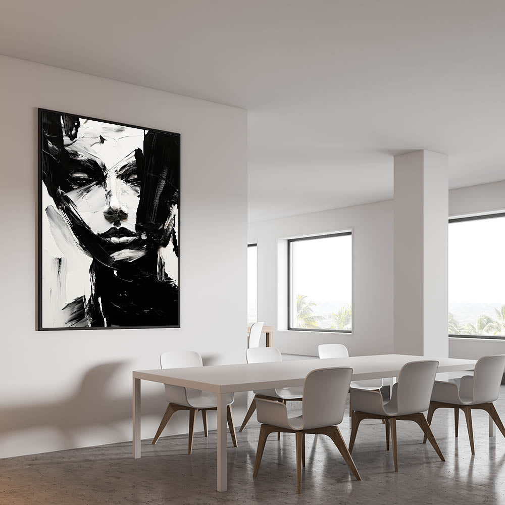 Make a bold statement in your dining space with this acrylic dining room artwork, featuring a striking black and white abstract portrait. The expressive brushstrokes and textured depth create a captivating visual impact, making it an ideal addition to elegant dining room wall art collections. Whether displayed as framed dining room prints or canvas art for dining areas, this dynamic piece enhances any contemporary setting.