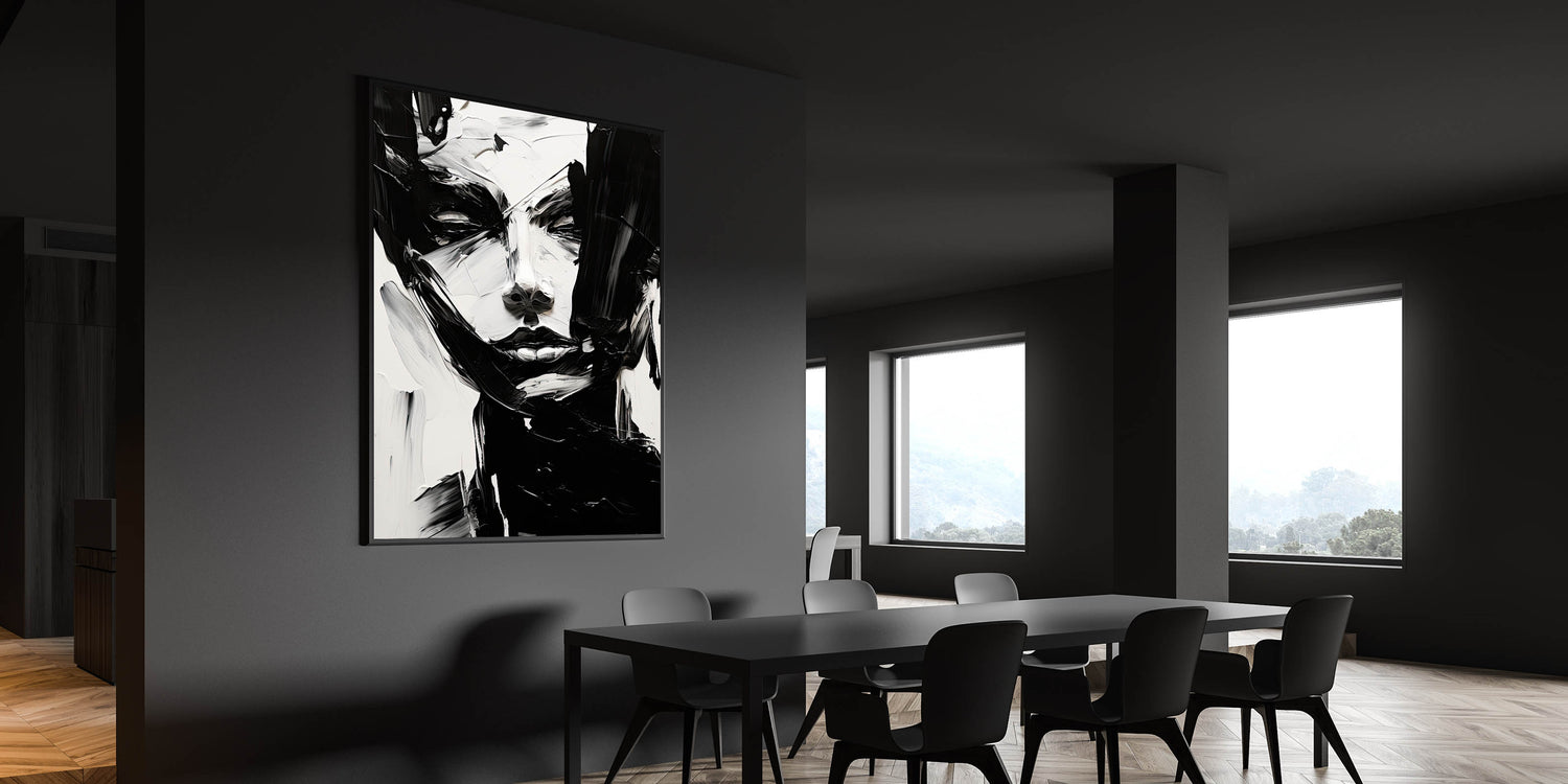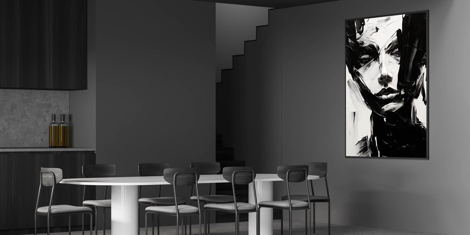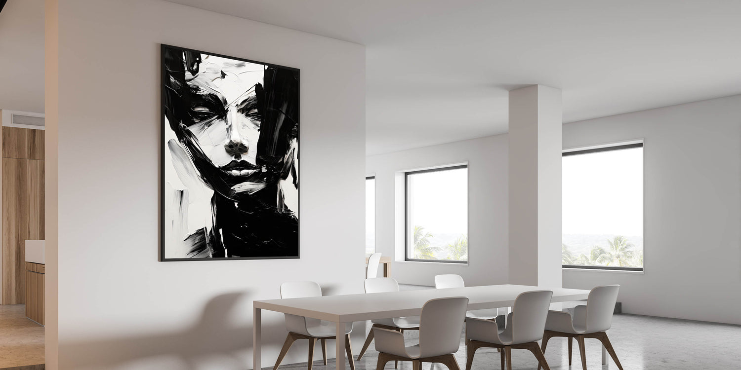 Make a bold statement in your dining space with this acrylic dining room artwork, featuring a striking black and white abstract portrait. The expressive brushstrokes and textured depth create a captivating visual impact, making it an ideal addition to elegant dining room wall art collections. Whether displayed as framed dining room prints or canvas art for dining areas, this dynamic piece enhances any contemporary setting.