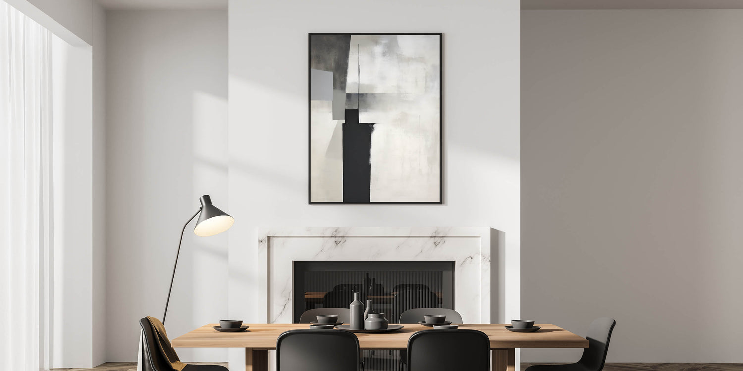 This modern dining room art is perfect for minimalist, industrial, and contemporary interiors, adding depth and sophistication. Whether you choose a rolled canvas print for dining area versatility or a framed dining room print for a polished look, this artwork transforms your space with understated elegance.