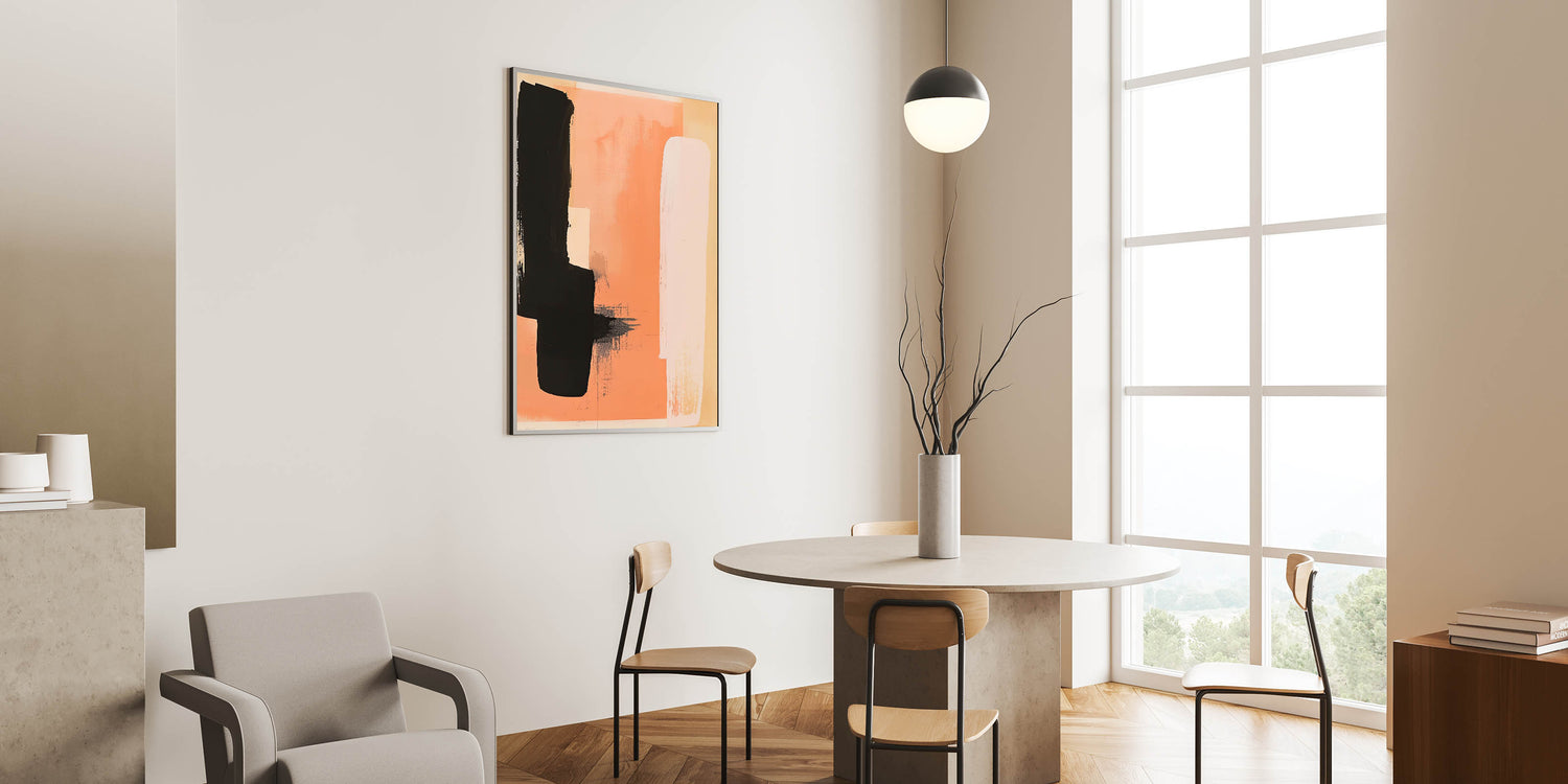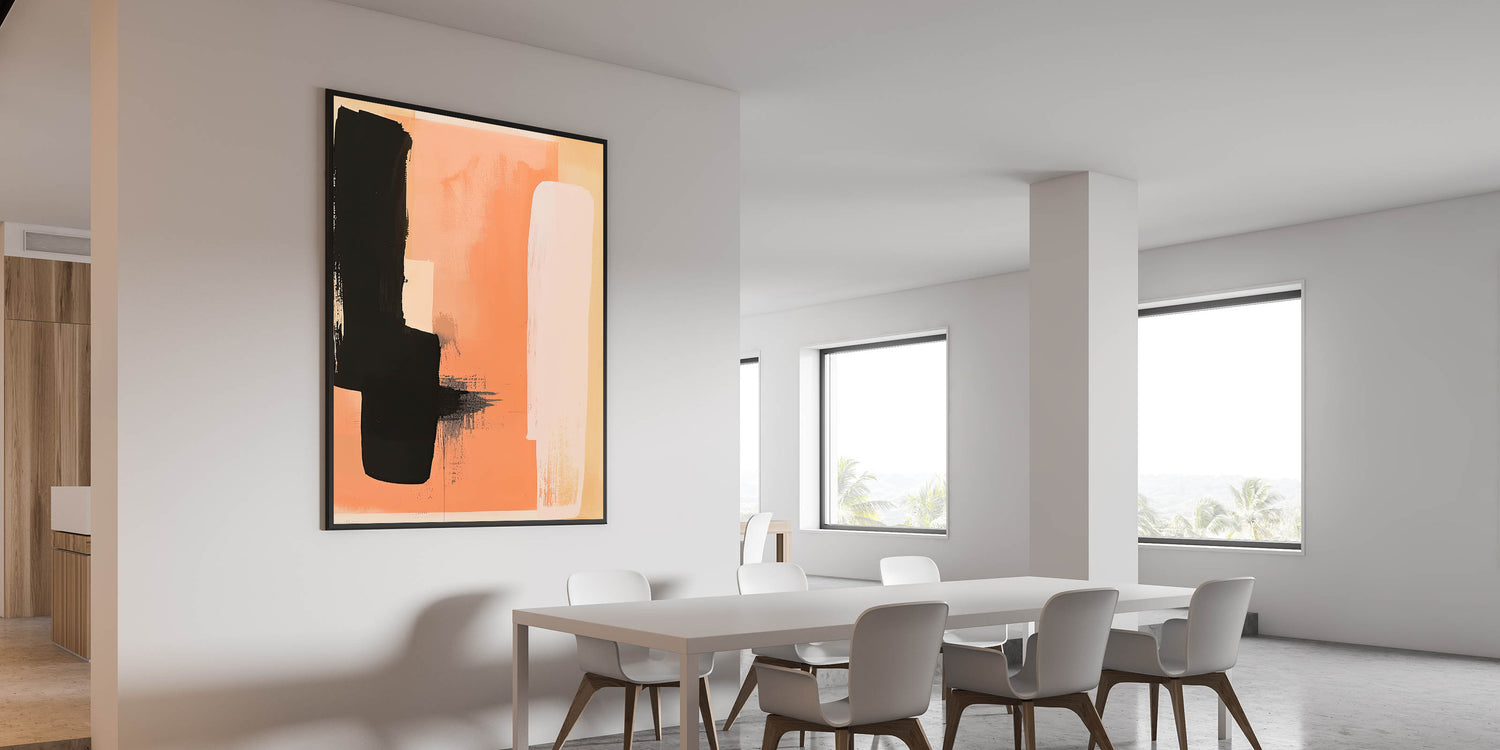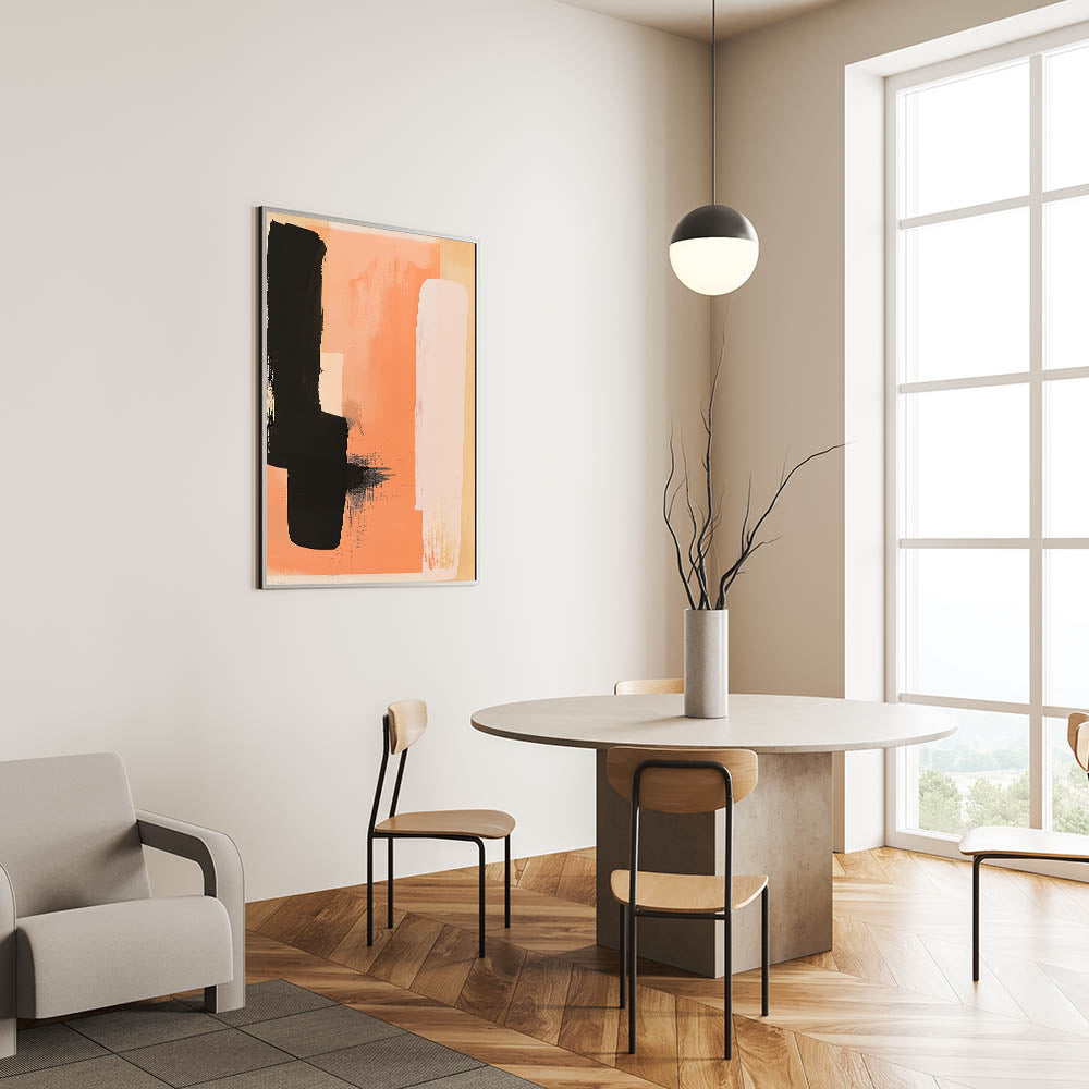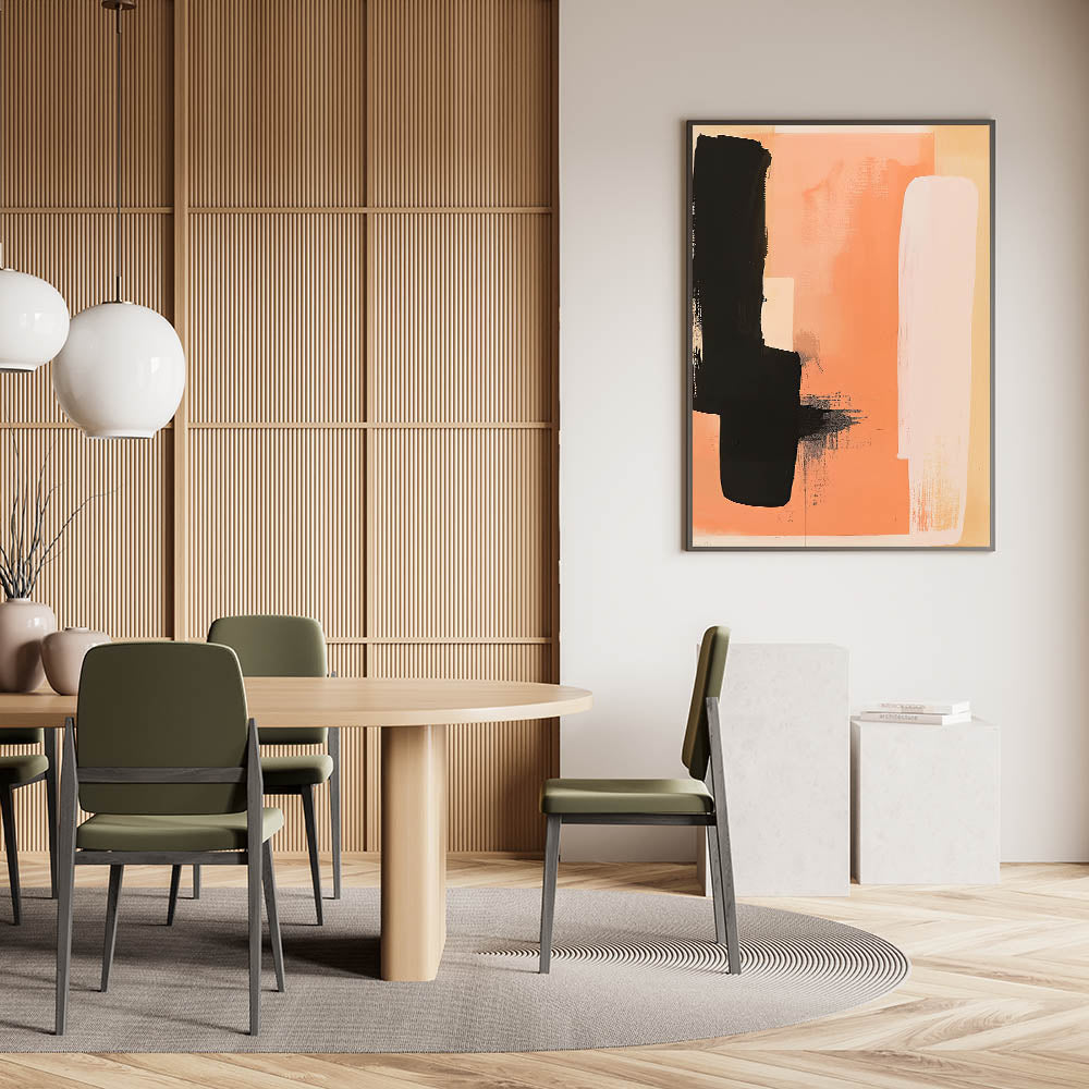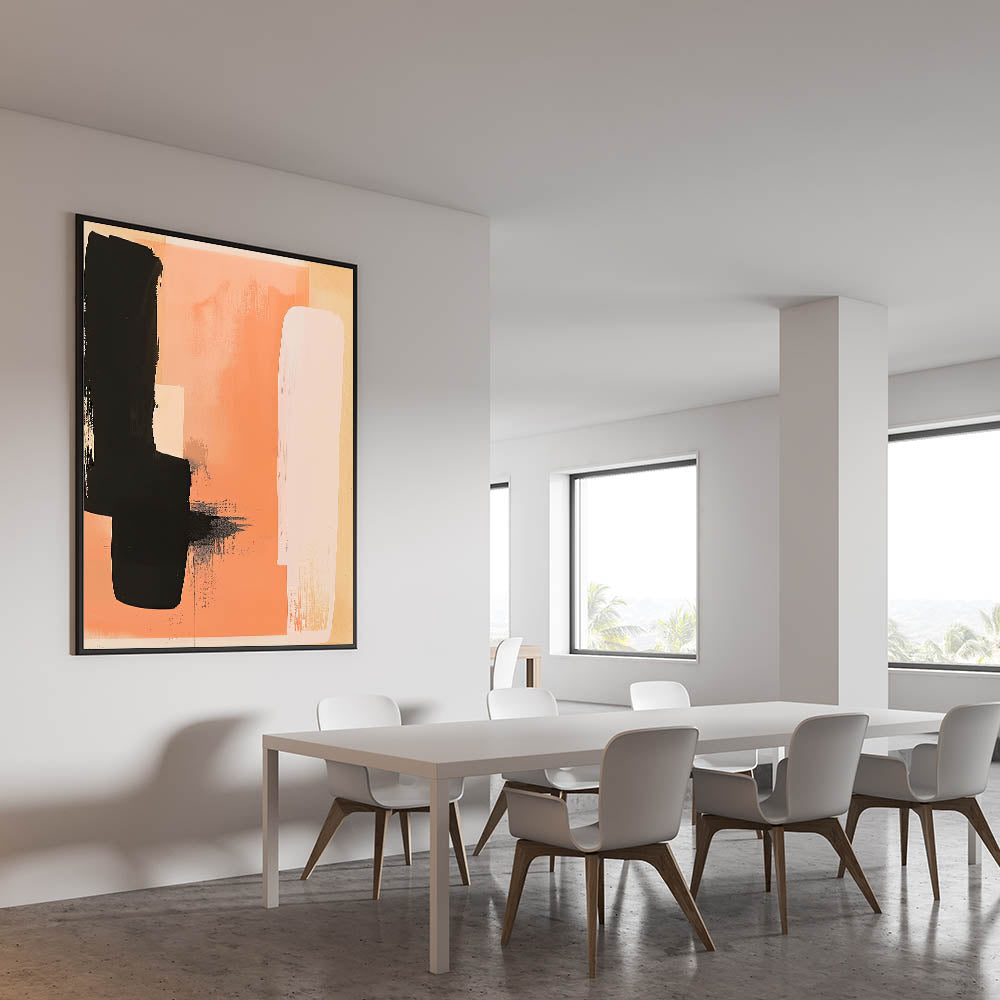 Add a bold statement to your dining space with this elegant dining room wall art, featuring a striking combination of black, peach, and beige in an abstract design. The expressive brushstrokes and color contrasts create a dynamic yet sophisticated look, making it an excellent focal point for modern and contemporary interiors.