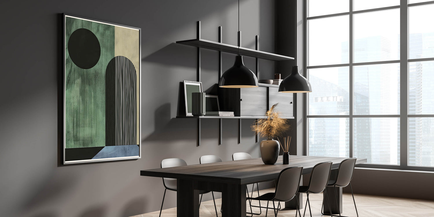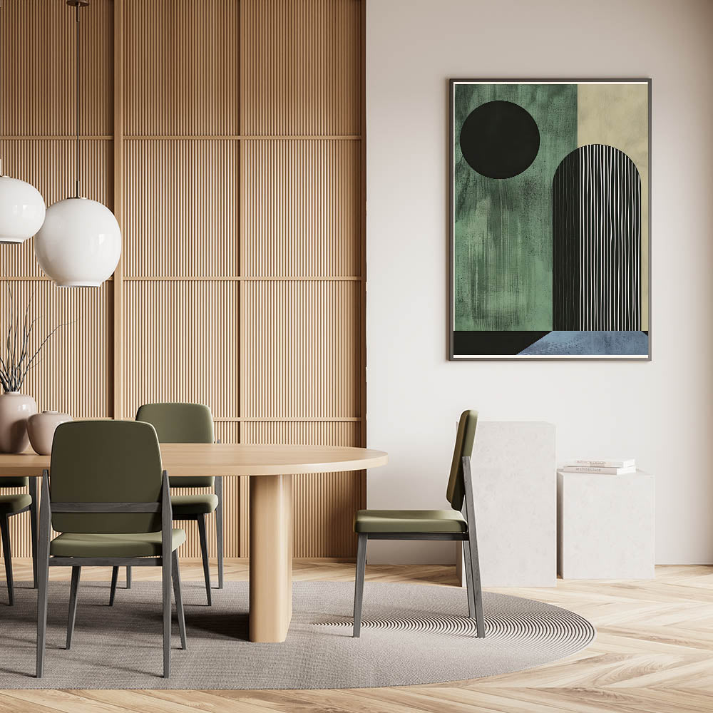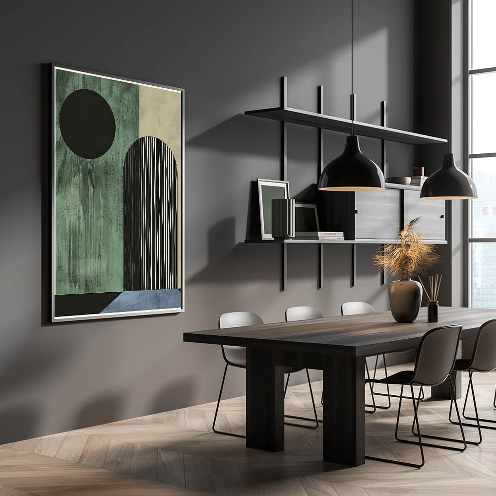 Transform your dining space with this elegant dining room wall art, designed for modern interiors. This contemporary dining art piece features a geometric composition in dark green, black, and blue, adding a sophisticated yet bold touch to your space. Whether you prefer framed dining room prints or a sleek acrylic dining room artwork, this design is available in various high-quality materials.
