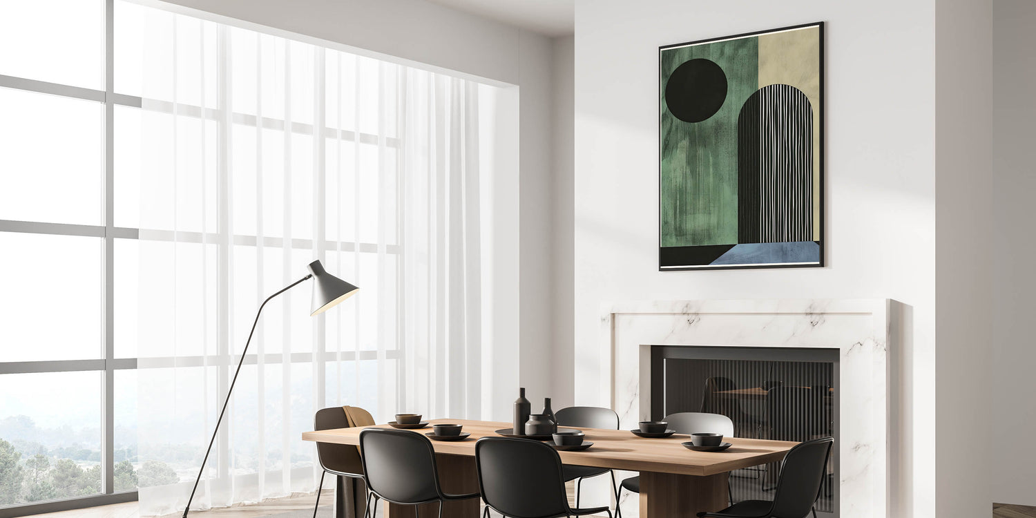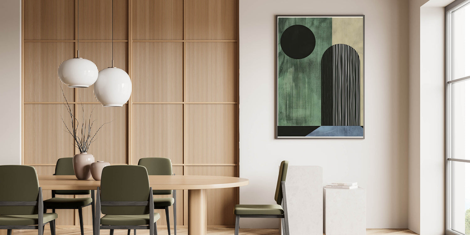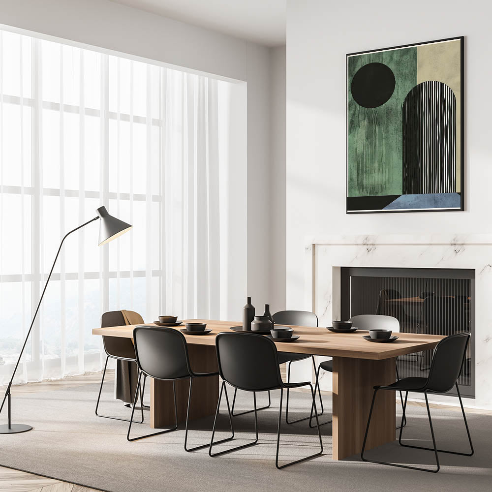 Transform your dining space with this elegant dining room wall art, designed for modern interiors. This contemporary dining art piece features a geometric composition in dark green, black, and blue, adding a sophisticated yet bold touch to your space. Whether you prefer framed dining room prints or a sleek acrylic dining room artwork, this design is available in various high-quality materials.