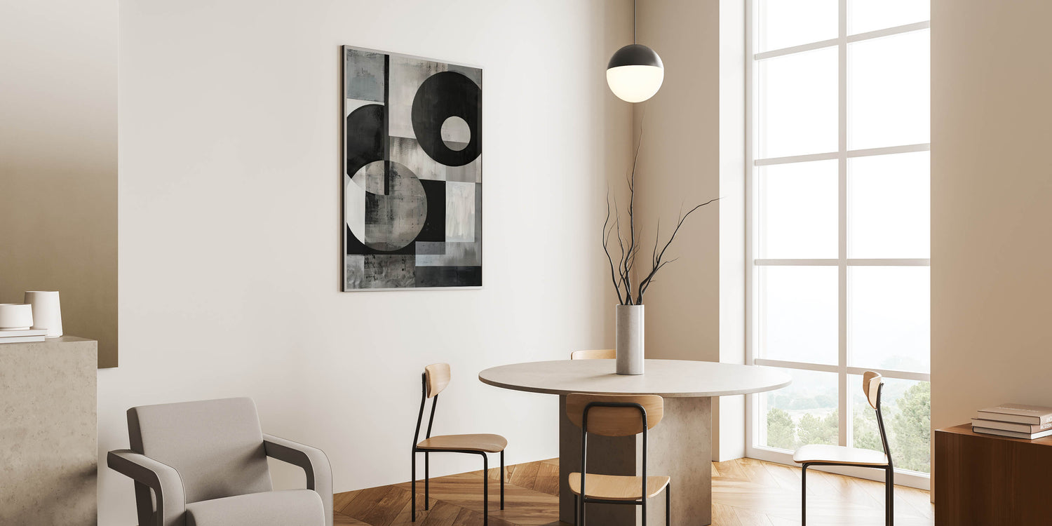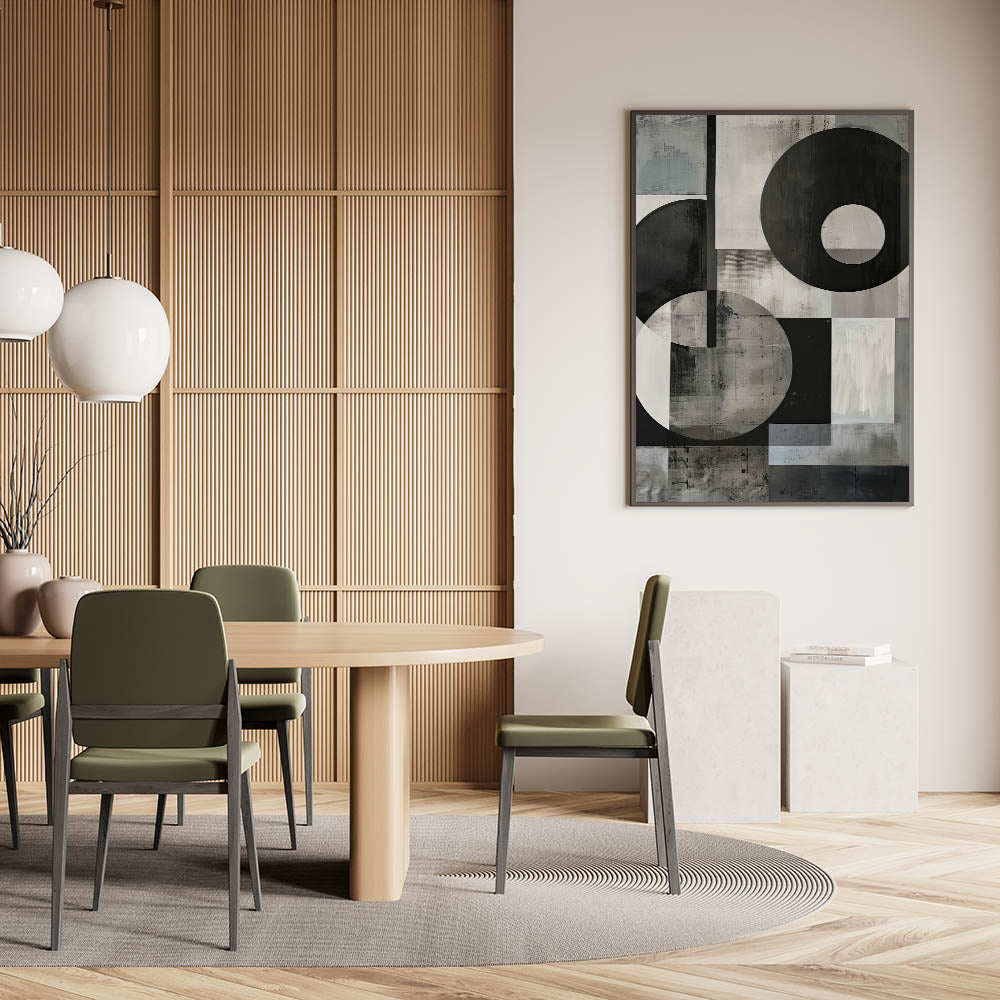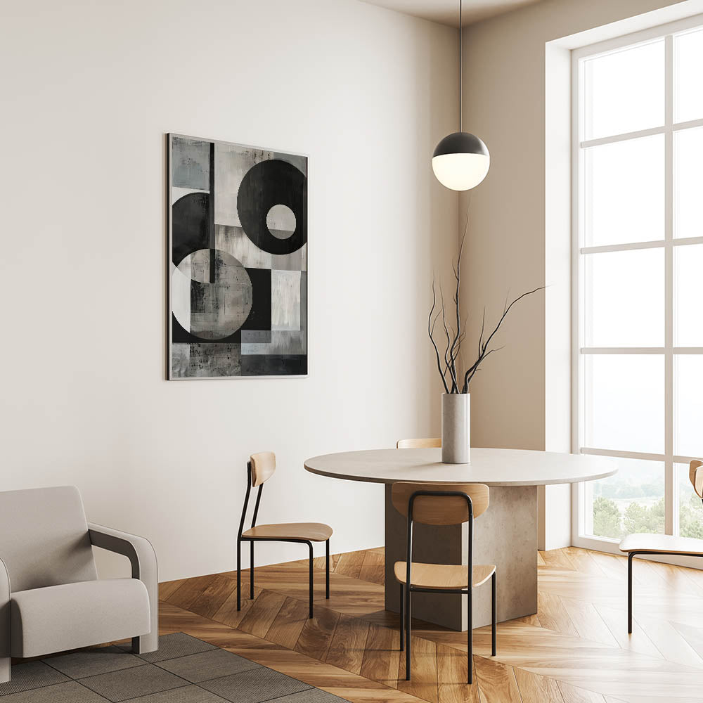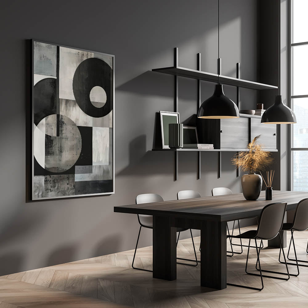 Add a bold, modern touch to your dining space with this geometric dining room wall art, featuring a striking interplay of black, gray, and white circles and rectangles. The layered composition, textured details, and abstract balance make it an excellent choice for modern dining room art lovers seeking a sophisticated yet dynamic aesthetic.