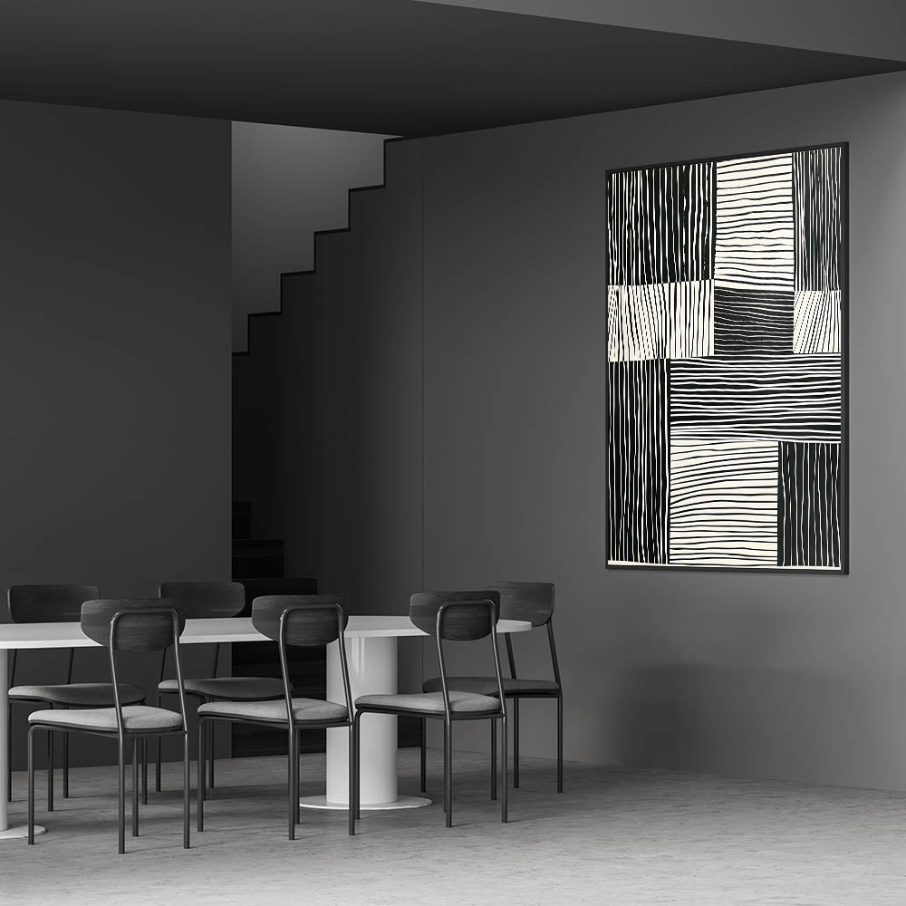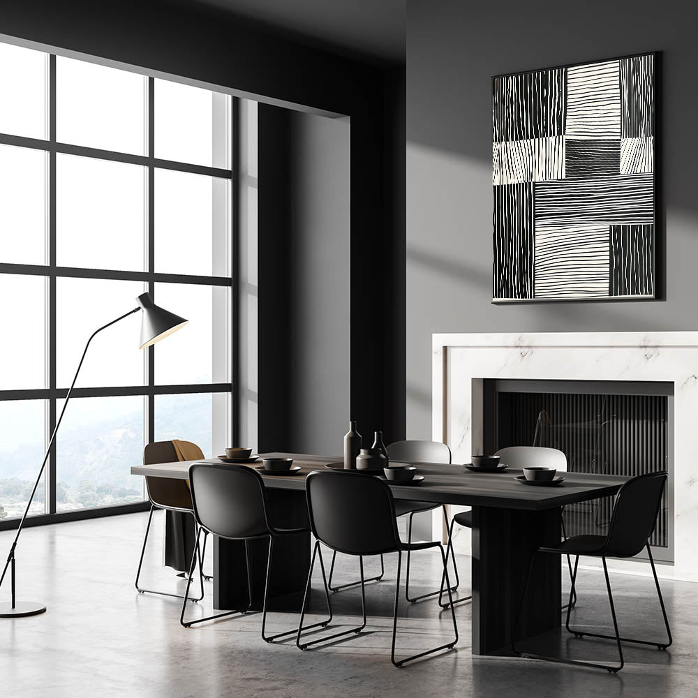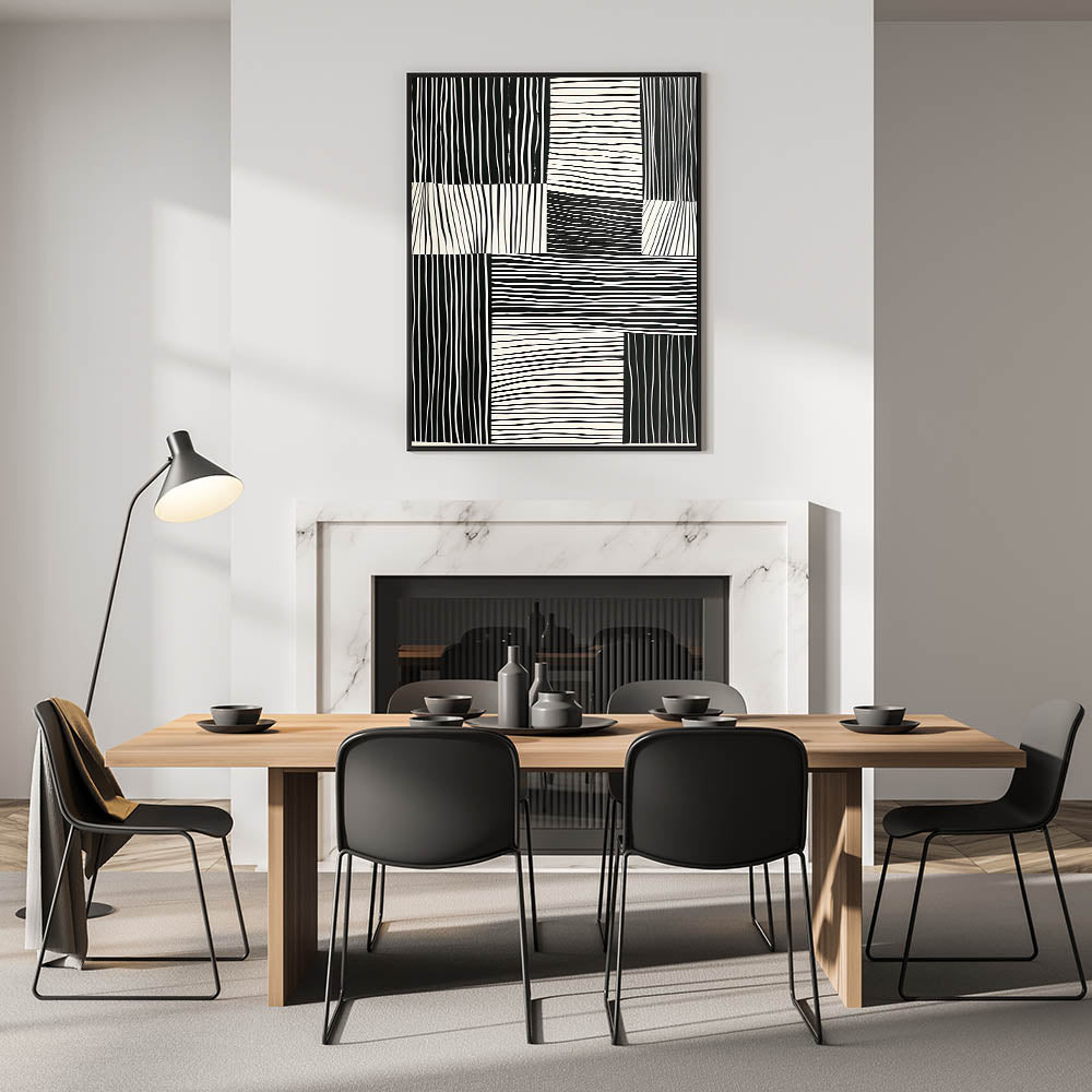 Upgrade your dining space with this acrylic dining room artwork, featuring a striking black and white geometric pattern with bold, fluid lines. This modern dining room art makes a powerful statement, perfect for minimalist, industrial, and contemporary interiors.