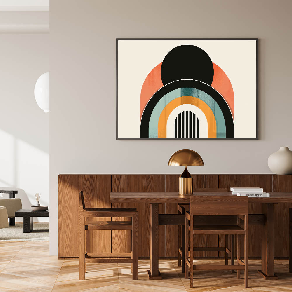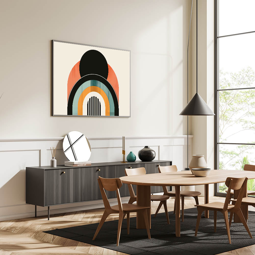 Add a bold and stylish touch to your dining space with this acrylic dining room artwork, featuring a vibrant geometric arch design. The striking combination of black, orange, teal, and mustard yellow creates a visually dynamic piece, making it a perfect canvas art for dining area. The retro-modern aesthetic of this contemporary dining art piece enhances mid-century, bohemian, and eclectic interiors, making it a standout addition to your dining room wall decor.