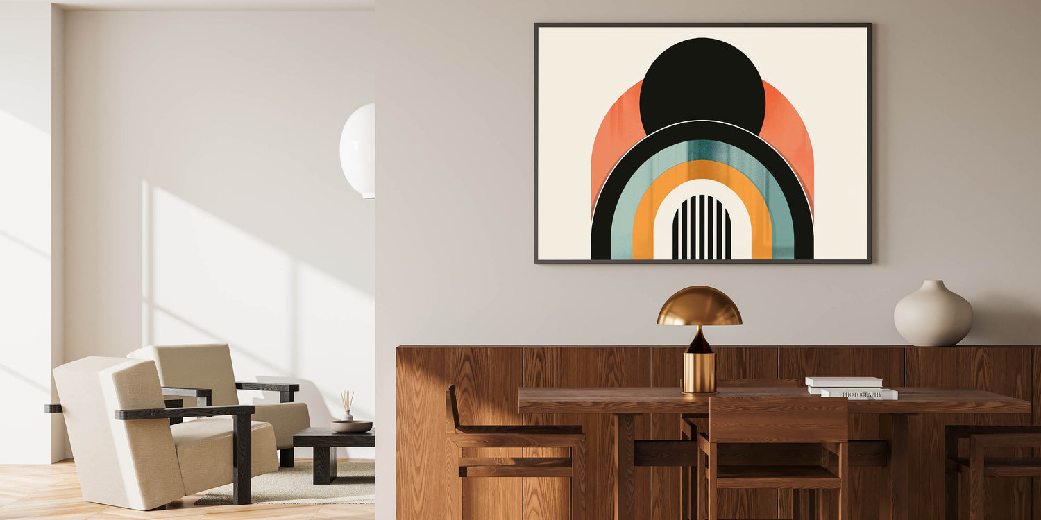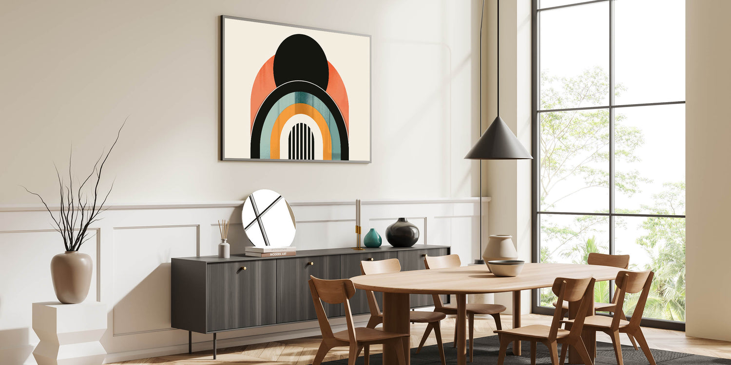 This dining room wall decor blends bold shapes and rich hues, making it an eye-catching focal point in your space. Whether you choose framed or acrylic dining room artwork, this design adds a vibrant, retro-inspired touch to any modern home.
