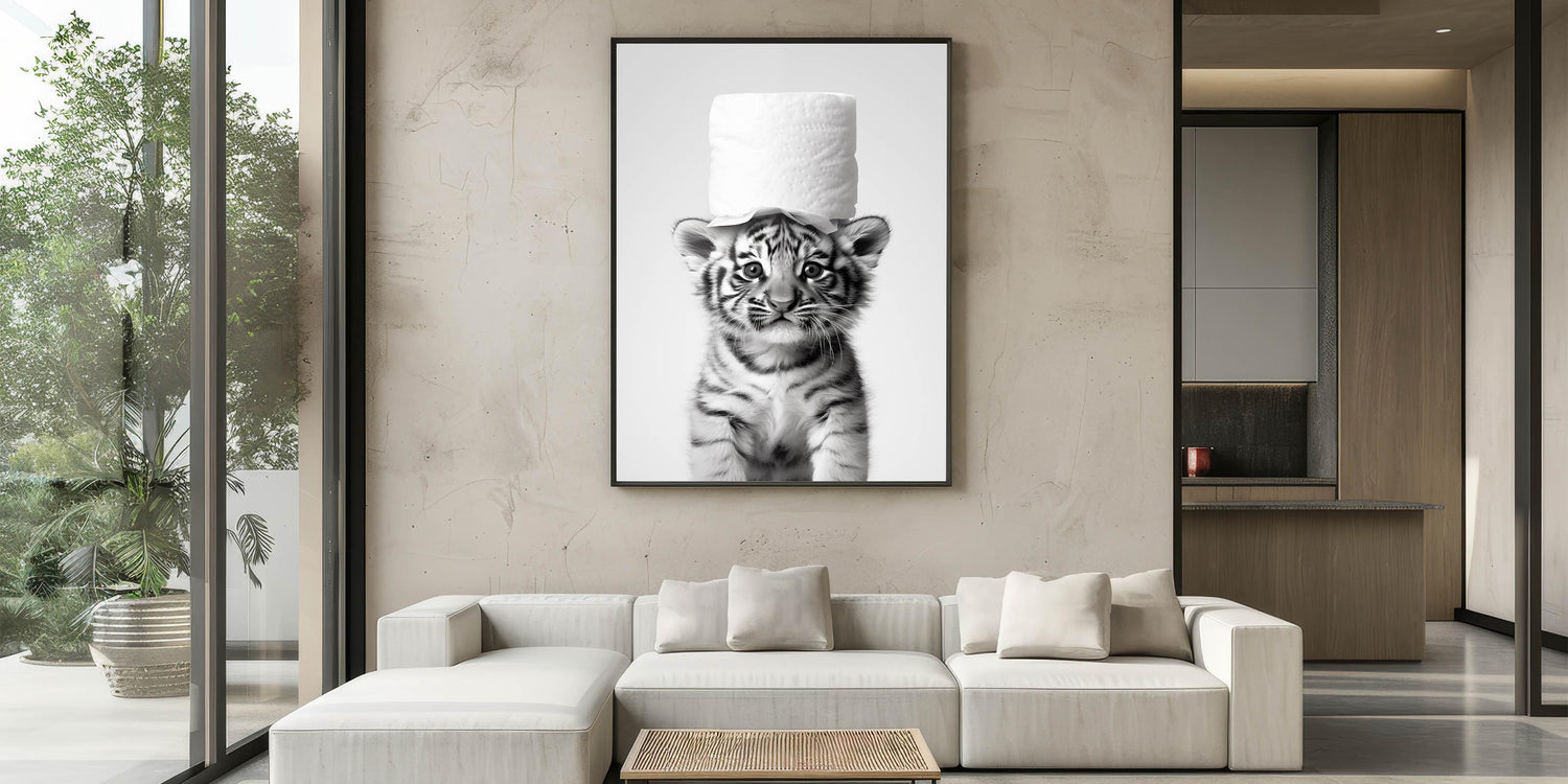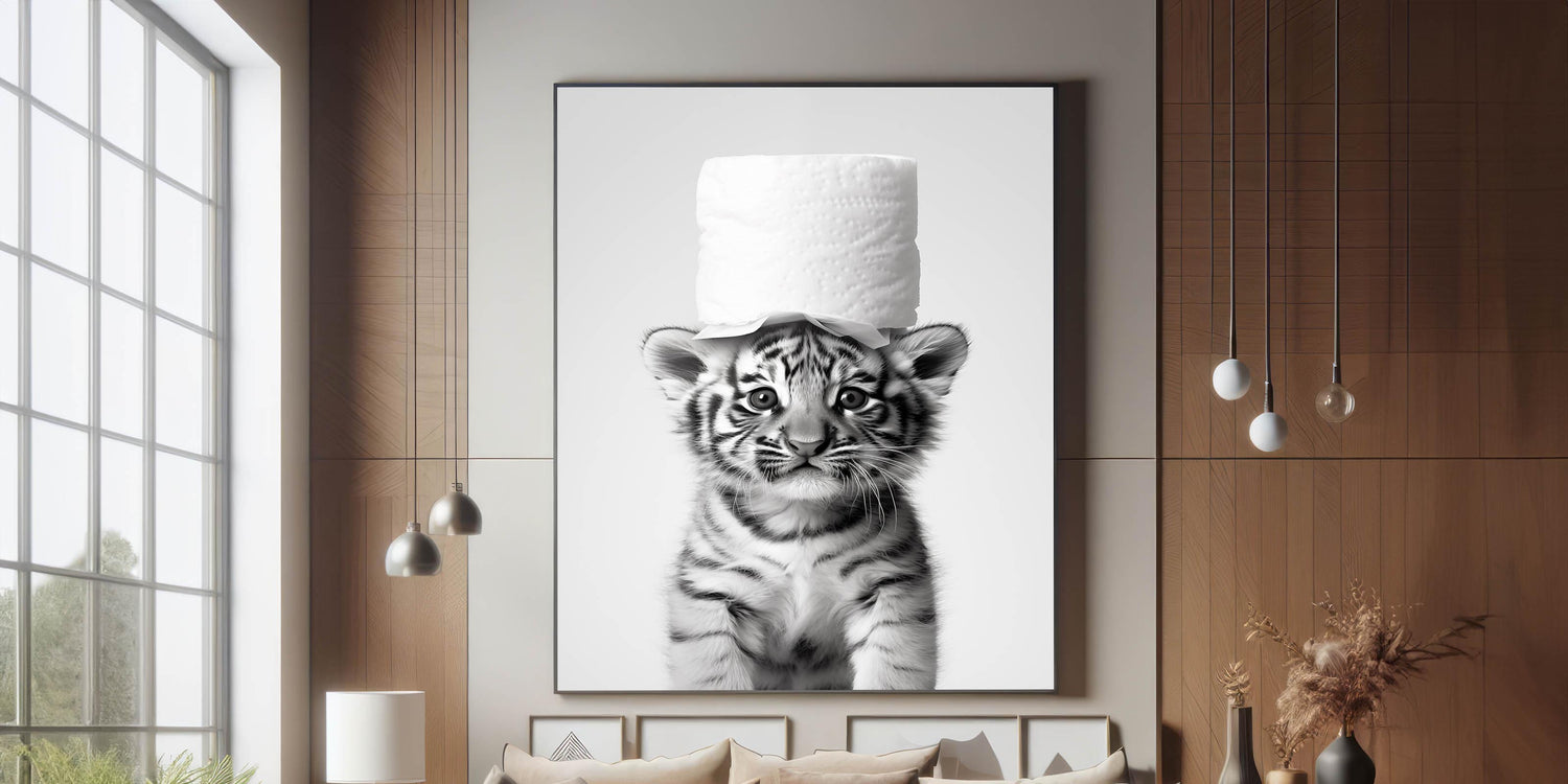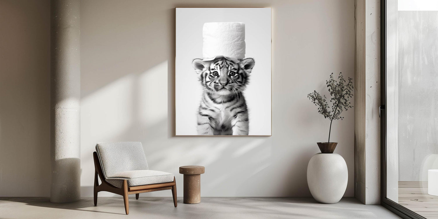 Add a bold and playful charm to your bathroom with this delightful tiger cub wall art. Featuring an adorable tiger cub balancing a roll of toilet paper on its head, this black-and-white design blends humor and elegance perfectly. Its minimalist tones ensure versatility, making it an ideal addition to modern or eclectic bathroom spaces.