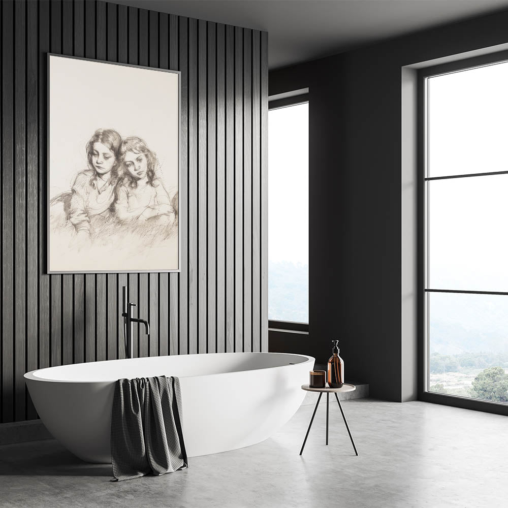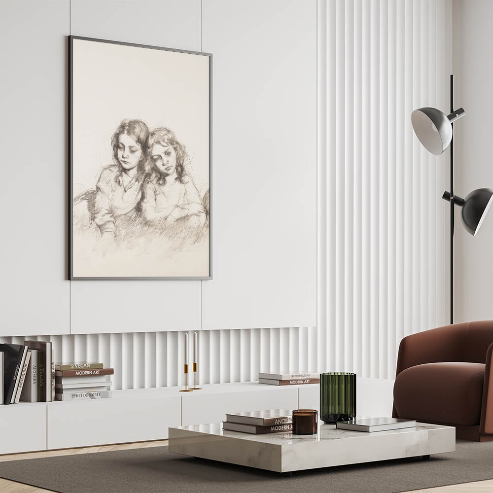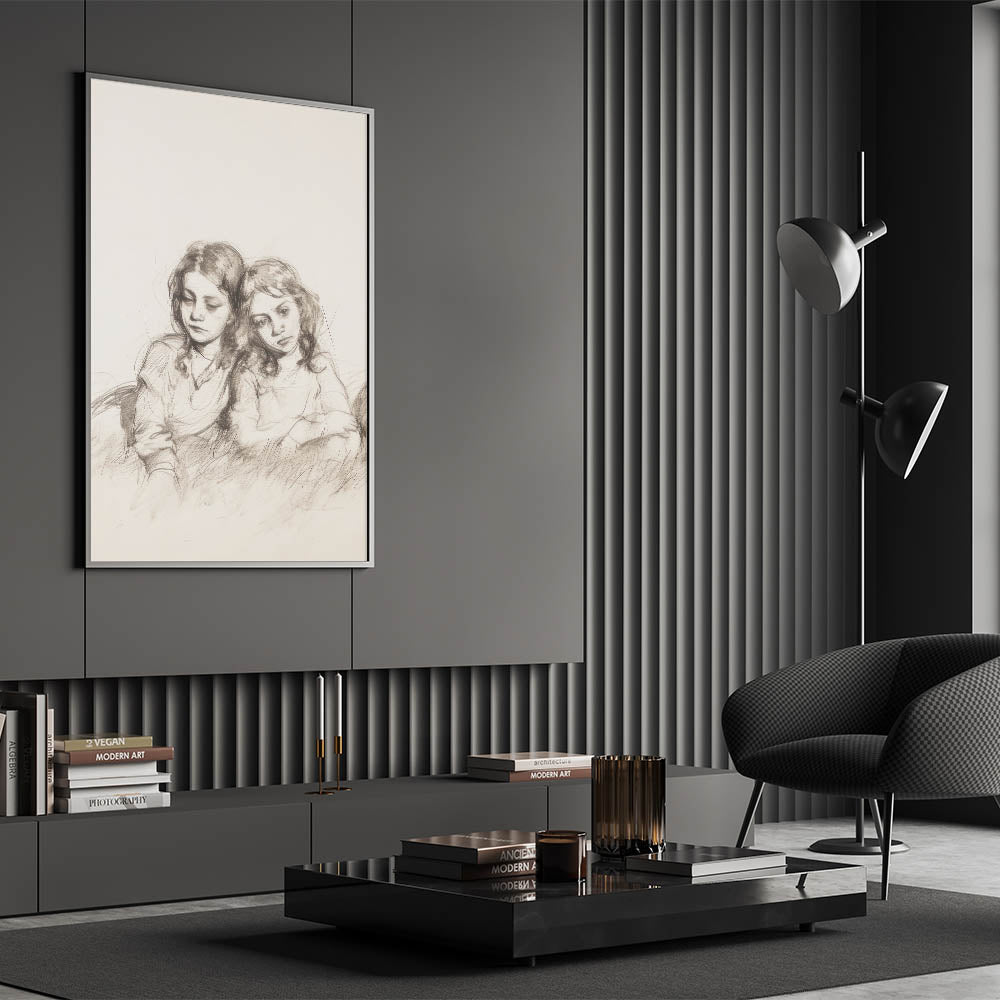 Capture the essence of tender connection with this artistic figurative design. Featuring two young companions in a delicate, sketch-style rendering, this artwork exudes timeless charm and emotional depth. The soft monochromatic palette highlights the intricate details of the figures, making it an exquisite addition to any wall decor collection.