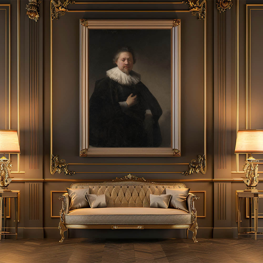 Embrace the timeless elegance of Baroque art with this striking portrait of a nobleman. The artwork captures the solemn dignity and refined attire of the subject, complete with a lavish lace ruff and flowing robes. The muted background and delicate light emphasize the details of the nobleman’s facial expression and attire, reflecting the Baroque period’s masterful use of chiaroscuro.