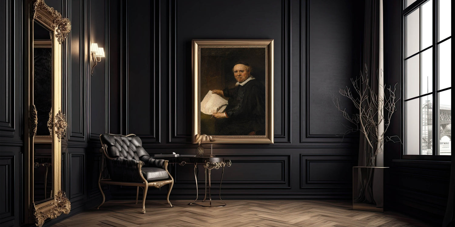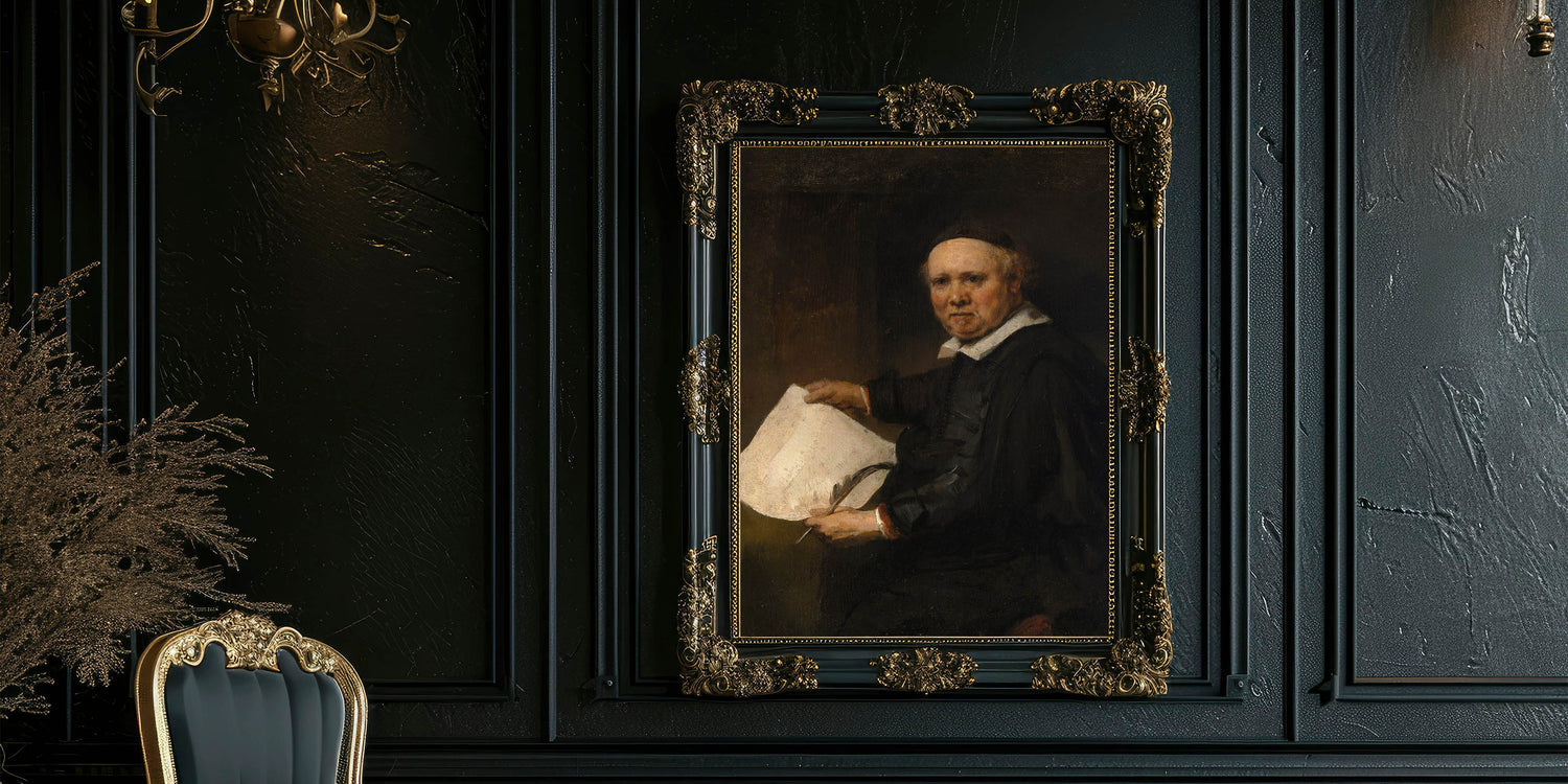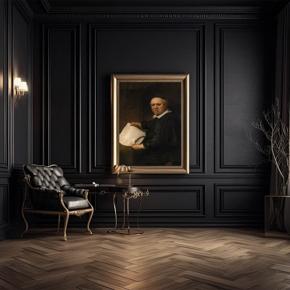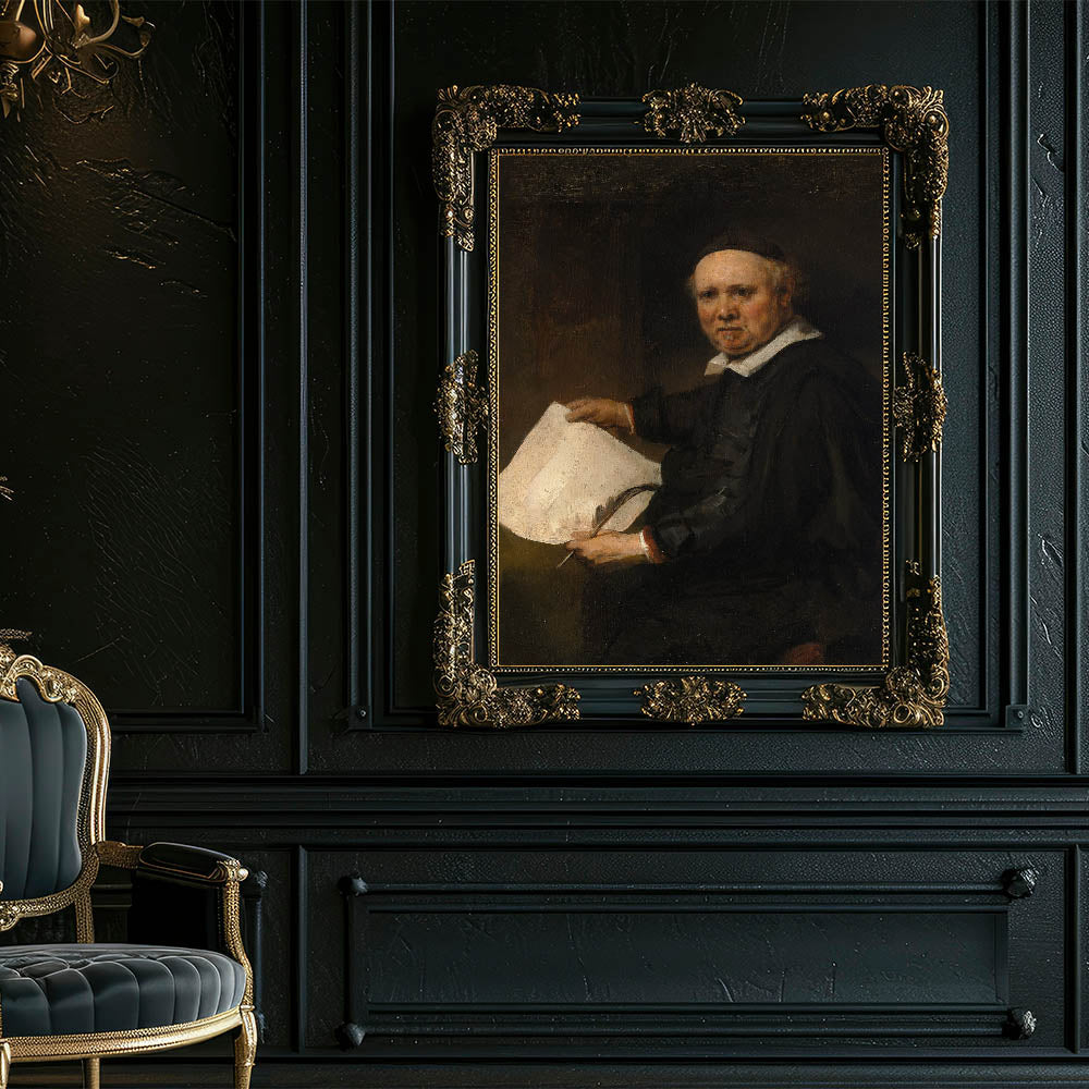 Celebrate the timeless artistry of the Baroque period with this distinguished portrait of a scholar. Captured in stunning detail, this painting features an elderly gentleman holding a quill and manuscript, symbolizing intellect and dedication. The rich textures, moody background, and masterful use of light and shadow reflect the artistic elegance of Baroque designs, making it a captivating focal point for any space.