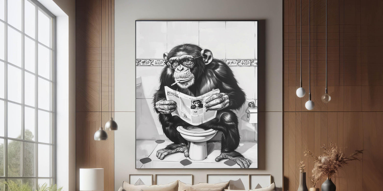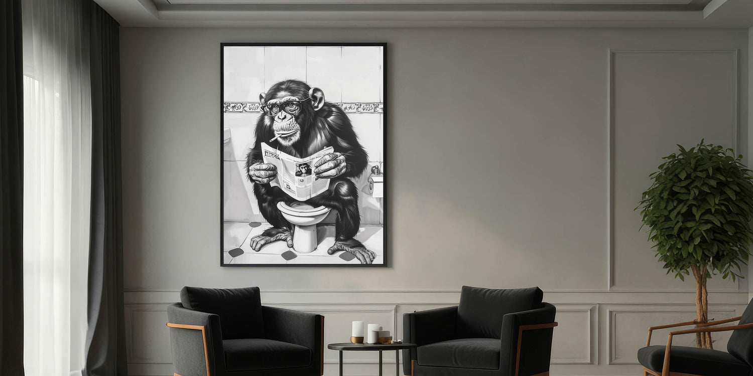Inject a dose of humor into your bathroom with this quirky and entertaining wall art featuring a chimpanzee reading a newspaper while sitting on the toilet. This black-and-white design with intricate details and a touch of satire adds personality and character to any bathroom space. Perfect for those who appreciate playful and modern bathroom wall art, this piece is a conversation starter that will bring smiles to anyone who sees it.