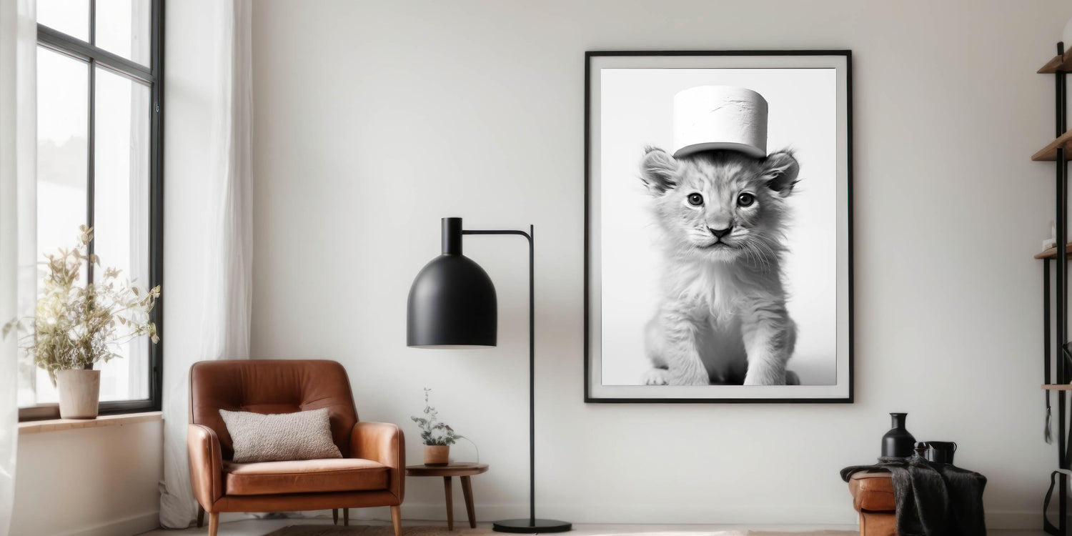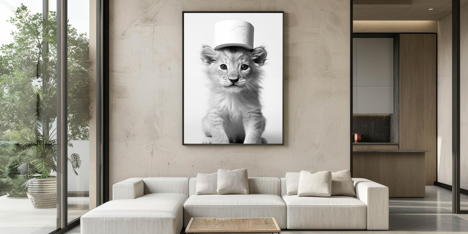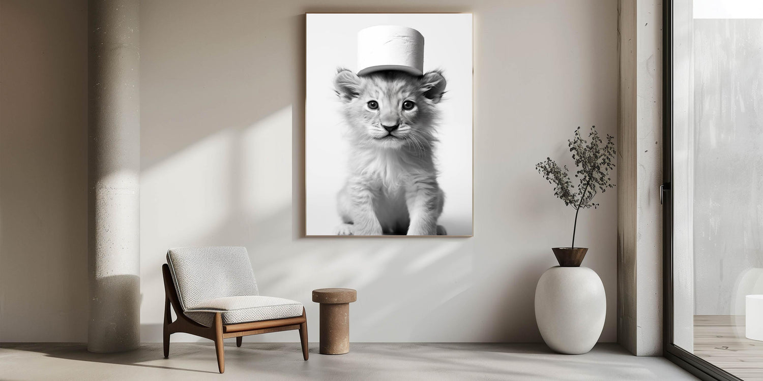 Bring a playful twist to your bathroom decor with this charming wall art featuring an adorable lion cub wearing a toilet roll as a hat. The black-and-white minimalist design adds sophistication while retaining a touch of humor, making it a perfect piece for modern bathroom spaces. This versatile artwork seamlessly blends whimsy with elegance to create a unique focal point.
