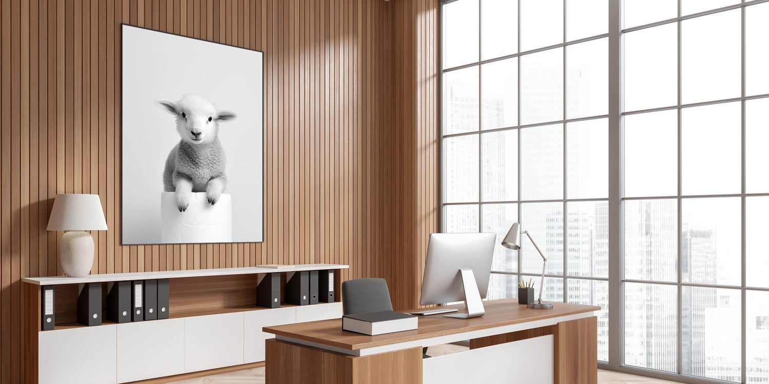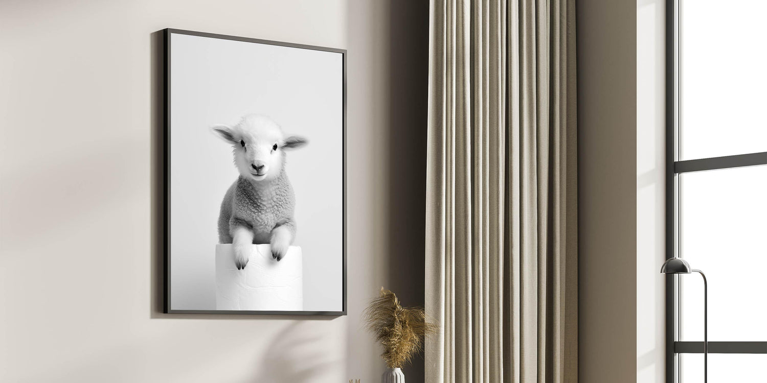 Introduce elegance and charm to your bathroom with this delightful piece of wall art featuring a fluffy lamb perched on a toilet roll. This minimalist design combines simplicity and warmth, making it perfect for contemporary and modern bathroom settings. Its black-and-white palette adds sophistication while maintaining a playful, inviting touch.